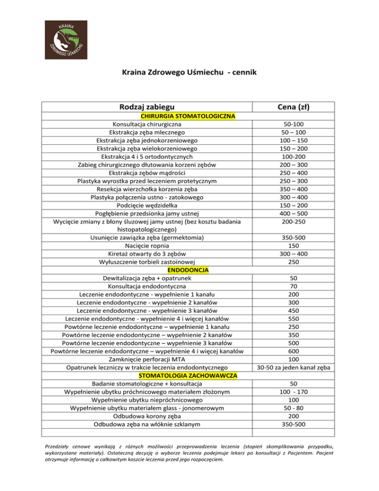 Kraina Zdrowego Uśmiechu - cennik Rodzaj zabiegu Cena (zł)