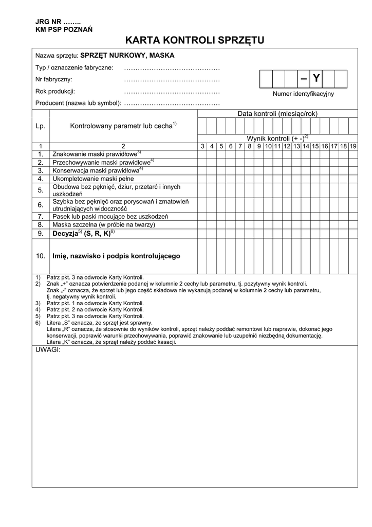 JRG NR …….. KM PSP POZNAŃ KARTA KONTROLI SPRZĘTU Nazwa sprzętu: SPRZĘT NURKOWY, MASKA Typ / oznaczenie fabryczne: …………………………………… Nr fabryczny: …………………………………… Rok produkcji: …………………………………… – Y Numer identyfikacyjny Producent (nazwa lub symbol): …………………………………… Data kontroli (miesiąc/rok) Kontrolowany parametr lub cecha1) Lp. Wynik kontroli (+ -)2) 1 1. 2. 3. 4. 5. 6. 7. 8. 9. 10. 1) 2) 3) 4) 5) 6) 2 Znakowanie maski prawidłowe3) Przechowywanie maski prawidłowe4) Konserwacja maski prawidłowa4) Ukompletowanie maski pełne Obudowa bez pęknięć, dziur, przetarć i innych uszkodzeń Szybka bez pęknięć oraz porysowań i zmatowień utrudniających widoczność Pasek lub paski mocujące bez uszkodzeń Maska szczelna (w próbie na twarzy) 3 4 5 6 7 8 9 10 11 12 13 14 15 16 17 18 19 Decyzja5) (S, R, K)6) Imię, nazwisko i podpis kontrolującego Patrz pkt. 3 na odwrocie Karty Kontroli. Znak „+” oznacza potwierdzenie podanej w kolumnie 2 cechy lub parametru, tj. pozytywny wynik kontroli. Znak „-” oznacza, że sprzęt lub jego część składowa nie wykazują podanej w kolumnie 2 cechy lub parametru, tj. negatywny wynik kontroli. Patrz pkt. 1 na odwrocie Karty Kontroli. Patrz pkt. 2 na odwrocie Karty Kontroli. Patrz pkt. 3 na odwrocie Karty Kontroli. Litera „S” oznacza, że sprzęt jest sprawny. Litera „R” oznacza, że stosownie do wyników kontroli, sprzęt należy poddać remontowi lub naprawie, dokonać jego konserwacji, poprawić warunki przechowywania, poprawić znakowanie lub uzupełnić niezbędną dokumentację. Litera „K” oznacza, że sprzęt należy poddać kasacji. UWAGI: 1. ZNAKOWANIE Maska powinna być trwale i czytelnie oznakowana numerem identyfikacyjnym (inwentarzowym lub serwisowym). Znakowanie powinno być wykonane w sposób nie utrudniający odczytu znakowania producenta. Znakowanie nie powinno pogarszać cech użytkowych maski. 2. KONSERWACJA I PRZECHOWYWANIE Jeżeli w instrukcji fabrycznej nie zalecono inaczej, konserwację i przechowywanie maski należy prowadzić według podanych niżej zasad. Konserwację maski należy przeprowadzić niezwłocznie po każdym użyciu. Konserwacja polega na dokładnym umyciu wodą mydlaną, spłukaniu czystą wodą i osuszeniu w temperaturze pokojowej. Jeśli maska nie będzie dłuższy czas używana, należy odpiąć pasek (paski) z klamer, części z tworzywa silikonowego posmarować smarem silikonowym, a części gumowe przesypać talkiem, szczelnie zamknąć w woreczku foliowym lub pudełku i odstawić w suche i chłodne miejsce. Przed ponownym użyciem, maskę dokładnie umyć z talku i smaru silikonowego. 3. KONTROLA 3.1. Kontrola okresowa Kontrolę okresową wykonuje jednostka PSP, w której posiadaniu jest maska. Kontrola obejmuje maski będące w użytkowaniu oraz maski znajdujące się w magazynie. Kontrolę należy wykonywać co 6 miesięcy. Kontrola polega na sprawdzeniu kolejno wszystkich parametrów lub cech podanych w Karcie kontroli. Wyniki kontroli i podjętą decyzję należy zapisać w Karcie zgodnie z podanymi w niej wskazówkami. Decyzja „S” powinna być podejmowana w przypadku, gdy wyniki wszystkich kontroli podanych w lp. 1 – 8 Karty są pozytywne. Decyzja „R” powinna być podejmowana, gdy wyniki choć jednej z kontroli według lp. 1 – 8 Karty są negatywne, a naprawa lub wymiana uszkodzonych elementów jest możliwa i opłacalna. Bezpośrednio po usunięciu przyczyn podjęcia decyzji „R” (np. w wyniku wykonanej naprawy) należy dokonać ponownej kontroli co najmniej tych parametrów lub cech, które spowodowały tę decyzję. Ponownie zapisać wyniki kontroli i podjętą decyzję w Karcie. Decyzja „K” powinna być podejmowana w przypadku, gdy wymiana lub naprawa uszkodzonych elementów jest niemożliwa lub nieopłacalna. 3.2. Kontrola bieżąca Kontrolę bieżącą wykonuje użytkownik maski. Kontrola obejmuje wyłącznie maski będące w użytkowaniu. Kontrolę należy przeprowadzać po każdym użyciu maski, po wykonaniu czynności konserwacyjnych według pkt. 2. Kontrola polega na sprawdzeniu cech i parametrów według lp. 3 – 8 Karty. Sposób kontroli, zapisy i podejmowanie decyzji powinny odbywać się na zasadach, jak dla kontroli okresowej według pkt. 3.1. W przypadku, gdy wszystkie wyniki kontroli bieżącej są pozytywne, można nie dokonywać jej zapisów.