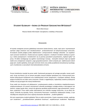 STUDENT GLOBALNY – IKONA CZY PRODUKT SZKOLNICTWA WYŻSZEGO? Maria Marciniszyn Wyższa Szkoła Informatyki i Zarządzania z siedzibą w Rzeszowie Streszczenie W wyniku następstw procesu globalizacji otoczenie świata biznesu, nauki, stylu życia i wyznawanych wartości ulega zmianom oraz nieodwracalnym przekształceniom ich dotychczasowego wizerunku. W artykule została podjęta próba zdefiniowana i umiejscowienia młodego człowieka we współczesnym procesie kształcenia. Artykuł porusza aspekty związane z modnymi trendami edukacji za granicą, a także powiązanymi z kształceniem się za granicą sposobami pozyskiwania „mądrych głów” do pracy. W dobie nasilającego się ogólnie rozumianego rozwoju, niezwykle istotnym staje się kapitał ludzki oraz umiejętności związane z jego gospodarowaniem. Celem artykułu jest zdefiniowanie takich pojęć jak: student globalny, brain gain lub brain drain oraz próba przybliżenia konsekwencji wynikających z kształcenia w warunkach internationalisation at home. Proces kształcenia rozwijał się przez wieki. Ewoluował począwszy od samego początku naszej cywilizacji. Ucząc się historii, już na samym początku naszych dziejów spotykamy się z historycznymi przekazami dotyczącymi kształcenia oraz osobistościami stricte związanymi z rozwojem edukacji. Dzisiaj pojęcie kształcenia ma takie samo znaczenie. Chodzi o najpełniejsze, najbardziej rzetelne przekazanie wiedzy oraz jej przyjęcie do naszej świadomości. Przez wieki nie stroniono od zdobywania i przekazywania wiedzy w kontekście międzykulturowym, międzynarodowym. W czasach starożytnych człowiek posiadający rozległą wiedzę o otaczającym nas świecie, znający języki obce, cieszył się ogromną aprobatą społeczeństwa, jego poważaniem, szacunkiem, podziwem. Przez wieki osoba wykształcona nie zmieniła swojego wizerunku, aż po dzień dzisiejszy. Zmieniły się sposoby, formy, instrumenty finansowe i możliwości zdobywania wiedzy. Z tym nieodłącznie związane jest coraz częściej stosowane określenie - „student globalny”. Kim jest wspomniany student globalny? Ma on wiele synonimów. Często nazywany zostaje „wędrującym studentem”, „przedstawicielem pokolenia Erasmusa”, współczesnym studentem. Wędrujący www.think.wsiz.rzeszow.pl, ISSN 2082-1107, Nr 2 (10) 2012, s. 23-26 Student globalny – ikona czy produkt współczesnego szkolnictwa wyższego? studenci nie są wynalazkiem naszych czasów, ale nigdy dotąd nie występowali oni w skali masowej. Dotąd świat nie był tak dla nich otwarty i tak ich potrzebował. Szacuje się, że obecnie liczba wędrujących studentów wynosi ponad 2 miliony. Szacuje się również, że w przeciągu najbliższych 20 - 25 lat, ich liczba się potroi. Młodzi ludzie wyjeżdżają, aby studiować w innym kraju. Jadą studiować na semestr lub kilka; zbierają wiedzę, gromadzą materiały, np. do rozpraw doktorskich; podejmują decyzje o nauce za granicą z ciekawości, z chęci przeżycia czegoś innego. Wyjazdy studentów mogą mieć różny charterach. Uczestniczą oni w wymian międzyuczelnianych, korzystają ze stypendiów np. Erasmus. Wyjeżdżają także na własną rękę. Są chciani i niechciani, lubiani i traktowani po macoszemu, są i tacy, którym los dał kartę wyjazdu. Są biedni i bogaci, którzy są w stanie wydać ostatnie pieniądze na kształcenie w innym kraju. Bywają tacy, którzy jadą by uczyć się, ale i tacy, którzy w wyjeździe upatrują szanse na lepsze życie – jadą studiować by uciec od biedy, przemocy, terroru, prześladowań, wojny. Motywów jest tak naprawdę tyle, ilu jest „studentów wędrujących”. Każdy mimo, że należy do tej jednej ogromnej grupy, ma inny, osobisty cel. „Studenci globalni” są wszędzie. Największy ich odsetek znajduje się w Europie, szczególnie w Niemczech oraz Wielkiej Brytanii. Nie brakuje ich również w Stanach Zjednoczonych oraz Australii. Przyjeżdżają zewsząd i jadą do najbardziej odległych i małych państw świata. Co drugi „student globalny” jest z Azji, co trzeci z Europy, inni przyjeżdżają z Ameryki Południowej, Afryki, Oceanii i stanowią ciekawe uzupełnienie masowych wyjazdów studenckich. Różnorodność przyczynia się do dynamizacji rozwoju współczesnego społeczeństwa – efekt globalizacji. „Studenci globalni” również mają w tym swój udział. Obecność ich na zajęciach wzbogaca merytoryczność zajęć, ich udziały w dyskusjach poszerzają horyzonty myślowe. Podejście do różnorodnych kwestii i problemów pogłębia poszukiwania i odpowiedzi na trudne pytania, co czyni studiowanie bardziej fascynującym i pełniejszym. Dzięki obecności różnorodności uczymy się obchodzić z tym, co nas od siebie różni, szukamy czegoś wspólnego, konfrontujemy poglądy, wymieniamy się nimi. Poczucie realizowania się na poziomie międzynarodowym i międzykulturowym sprawia, że można wejść w poczucie tzw. internationalisation at home. Mieszanka kultur, kompetencji, umiejętności oraz obycie w środowisku interkulturowym, daje możliwości budowania międzynarodowej sieci współpracy. Porozumienie ponad granicami i podziałami scala. Tak dzieje się np. z milionem dotychczasowych wychowanków europejskiego Socratesa - Erasmusa, największego programu tego typu na świecie. Pokolenie Erasmusa, stało się awangardą nowej, europejskiej tożsamości. Tak też przecież Niemcy i Francuzi przezwyciężyli wzajemne animozje po drugiej wojnie światowej - intensywną wymianą studencką. W tym kontekście warto przypomnieć lansowane przez ONZ The Millennium Development Goals i koncepcję globalnej współpracy edukacyjnej jako najważniejszego środka do zwalczania światowej biedy i budowania efektywnej strategii w radzeniu sobie z konfliktami na tle kulturowym, religijnym, etnicznym. Ale czy na pewno inwestuje się w pokój, wstrzymanie konfliktów, błogi pokój między zwaśnion