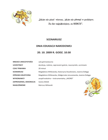 „JakŜ „JakŜe nie pisa pisać wierszy, jakŜ jakŜe nie płonąć w podzięce. podzi . Za dar najpię najpiękniejszy, za SERCE”. SCENARIUSZ DNIA EDUKACJI NARODOWEJ 20. 10. 2009 R. GODZ. 10:30 MIEJSCE UROCZYSTOŚCI sala gimnastyczna UCZESTNICY dyrekcja, rodzice, zaproszeni goście, nauczyciele, uczniowie CZAS TRWANIA 20 minut SCENARIUSZ Magdalena Witkowska, Katarzyna Duszkiewicz, Joanna Dołęga OPRAWA MUZYCZNA Magdalena Witkowska, Małgorzata Januszewska, Joanna Dołęga WYKONAWCY zespół wokalno – instrumentalny „AKORD” ZAPROSZENIA, DEKORACJA Iwona Złotek NAGŁOŚNIENIE Mariusz Milewski PRZEBIEG UROCZYSTOŚCI: UTWÓR „Once” – Falling Slowly” – wykonanie instrumentalne POWITANIE PATRYCJA Witam Państwa serdecznie! W imieniu uczniów naszej szkoły pragnę powitać, tych wszystkich, którzy przybyli na dzisiejszą uroczystość, aby wraz z nami świętować Dzień Edukacji Narodowej. Witam więc całą Dyrekcję naszego Ośrodka, wszystkich nauczycieli, wychowawców, zaproszonych gości oraz pozostałych pracowników naszej szkoły. Spotykamy się dziś, aby chociaż raz w roku podziękować naszym nauczycielom, za ich trud, serce oraz wkład w nasze wychowanie i nauczanie. Dziękujemy Wam za to, że uczycie nas żyć tak, byśmy potrafili dać siebie innym. Proszę Panią Dyrektor o zabranie głosu. POWITANIE GOŚCI PRZEZ PANIĄ DYREKTOR WRĘCZENIE NAGRÓD DYREKTORA MIRELLA Pozwolą Państwo, że odczytam list skierowany do Was od uczniów naszej szkoły: Z grzeczniutkim ukłonem Z uśmiechem radości. Witamy dziś wszystkich zebranych tu gości Chcemy mówić wiersze I zaśpiewać ładnie Proszę się nie gniewać, Gdy nam źle wypadnie. A teraz zapraszamy wszystkich na krótką prezentację słowno – muzyczną. PIOSENKA „DOBRY DZIEŃ” Ref. Hej, hej, hej (2x) Dobry dzień (2x) Jak nie dobry (2x) to go zmień! 1. Pożyczymy naszej pani sto uśmiechów, słońca blask i błękitu odrobinę, i miłości pełną garść. A gdy słońce zajdzie chmurą i gdy sił już będzie brak, To posłuchaj naszej rady i zawołaj z nami tak Ref. Hej, hej, hej (2x) Dobry dzień (2x) Jak nie dobry (2x) to go zmień! 2. Pożyczymy naszej pani moc gorących, ciepłych słów dni radosnych i wspaniałych, kolorowych, pięknych snów. A za wszystko, co złe było, co smuciło Waszą twarz Dziś Was bardzo przepraszamy i śpiewamy refren nasz. PATRYCJA (Włączamy podkład muzyczny – patrz prezentacja Warszawa) Dziękujemy jak każdego roku! Z każdym rokiem bardziej i goręcej, bo dzięki Wam, Nauczyciele, wiemy, rozumiemy z każdą lekcją więcej. Dziękujemy, jak każdego roku ... Wciąż zbyt mało i nigdy zbyt wiele za to światło, co mroki rozjaśnia. Dziękujemy Wam, Nauczyciele! Uczniowie trzymają napis „Dziękujemy nauczycielom”. PATRYCJA Do życzeń i podziękowań dołączamy mały upominek, składając go na Wasze ręce. (podkład – patrz prezentacja Warszawa) (Patrycja, Sławek, Mirella, Jacek – wręczają upominki) UROCZYSTE PASOWANIE NOWYCH UCZNIÓW GOSIA Jak to bywa w każdej szkole, tego dnia swoje święto mają również Ci uczniowie, którzy dołączyli do naszego szkolnego grona w tym roku. Dla nich to naprawdę ważny dzień i wielkie święto. Dzisiaj zostaną oni pasowani na uczniów naszej szkoły. Dla nich teraz ta piosenka: PIOSENKA „NASZA SZKOŁA” (Zwrotki recytowane, refren śpiewany) ASIA Końcem lata pachnie już ogniska dym i do szkoły iść już czas, starszy kumpel idzie też i woła nas, my z nim. Nowych wrażeń mamy dużo tu co krok aż czasami brak nam słów, na wakacje chętnie pojedziemy znów, za rok. Ref. Szkołę, naszą szkołę, każdy uczeń zna, w szkole, naszej szkole wszystko gra. Szkoła, nasza szkoła, fajna, każdy wie. W szkole, naszej szkole nie jest źle. ASIA Pierwszy dzwonek dźwięcznie brzmi i daje znak każdy uczy się bo wie. Że nieukiem dzisiaj być jest bardzo źle, o tak! Nie ma pracy, nic nie znaczy taki ktoś, Kto nie umie nic, bo leń. Robi sobie sam przez długi czas na złość. Ref. Szkołę, naszą szkołę, każdy uczeń zna, w szkole, naszej szkole wszystko gra. Szkoła, nasza szkoła, fajna, każdy wie. W szkole, naszej szkole nie jest źle. GOSIA Zapraszamy teraz na środek sali wszystkich nowych uczniów naszej szkoły, a Panią Dyrektor prosimy o przystąpienie do uroczystego pasowania. (podczas wyczytywania nowych uczniów starsi koledzy i koleżanki zapraszają swoich młodszych kolegów do uroczystego pasowania, pani dyrektor pasuje każdego ucznia, wręczając mu jednocześnie upominek oraz akt pasowania, w tle słychać podkład muzyczny – patrz prezentacja Warszawa). GOSIA A teraz usiądźcie na swoje miejsca i zobaczcie co dla Was jeszcze przygotowaliśmy. ASIA Przyszliście do szkoły nie tylko po to, aby spotkać nowych przyjaciół, doskonale się bawić, ale też po to, aby nauczyć się wielu nowych, ciekawych rzeczy. Wiecie pewnie, że z dnia na dzień coraz więc pojawia się różnych odmian chorób. Pewnie już na zajęciach Wasi nauczyciele mówili Wam o jednej z odmian grypy, która ostatnio się pojawiła. Dlatego chcemy umieć zapobiegać chorobom i Wam przekazać tę wiedzę. Dzisiaj więc chcielibyśmy rozpocząć podróż do tego miejsca, w którym polubicie dbanie o własne zdrowie i swój organizm, aby każde działanie związane z higieną przynosiło Wam przyjemność i radość, a nie było tylko obowiązkiem. Abyście zrozumieli jak wielka jest potrzeba dbania o higienę swoją i innych. Zobaczcie jak na każdym kroku, w każdym miejscu i w każdej chwili czyhają na nas bakterie i wirusy. WOJNA Z MIKROBAMI Obsada: wirus, bakteria, dziewczynka i chłopiec. Mikroby razem (Kasia i Asia oraz zespół śpiewają): My jesteśmy mikroby, roznosimy choroby, czaimy się skrycie, czyhamy na życie! /x 2 Wirus (Kasia): Gdzie Pani lubi mieszkać Pani Bakterio? Bakteria (Asia): Za brudnym paznokciem, w nie wypranych kocach, w kurzu na podłodze, na niemytych owocac