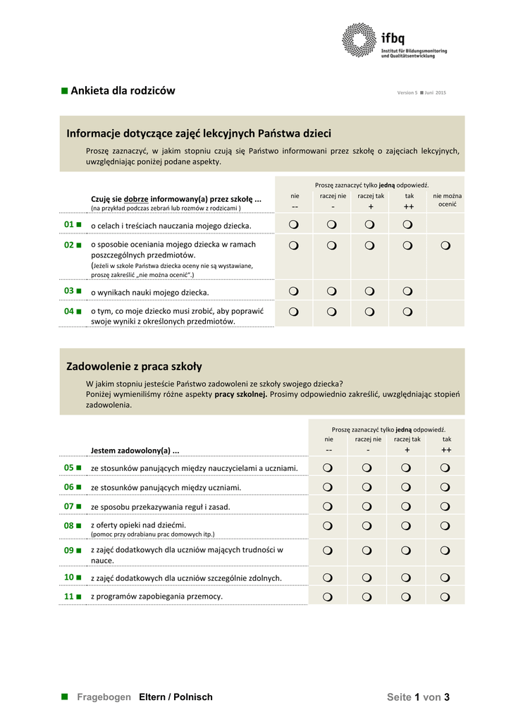Ankieta dla rodziców Version 5 Juni 2015 Informacje dotyczące zajęć lekcyjnych Państwa dzieci Proszę zaznaczyć, w jakim stopniu czują się Państwo informowani przez szkołę o zajęciach lekcyjnych, uwzględniając poniżej podane aspekty. Proszę zaznaczyć tylko jedną odpowiedź. nie raczej nie raczej tak tak -- - + ++ 01 o celach i treściach nauczania mojego dziecka. 02 o sposobie oceniania mojego dziecka w ramach 03 o wynikach nauki mojego dziecka. 04 o tym, co moje dziecko musi zrobić, aby poprawić Czuję sie dobrze informowany(a) przez szkołę ... (na przykład podczas zebrań lub rozmów z rodzicami ) poszczególnych przedmiotów. (Jeżeli w szkole Państwa dziecka oceny nie są wystawiane, nie można ocenić proszę zakreślić „nie można ocenić“.) swoje wyniki z określonych przedmiotów. Zadowolenie z praca szkoły W jakim stopniu jesteście Państwo zadowoleni ze szkoły swojego dziecka? Poniżej wymieniliśmy różne aspekty pracy szkolnej. Prosimy odpowiednio zakreślić, uwzględniając stopień zadowolenia. Proszę zaznaczyć tylko jedną odpowiedź. nie raczej nie raczej tak tak -- - + ++ 05 ze stosunków panujących między nauczycielami a uczniami. 06 ze stosunków panujących między uczniami. 07 ze sposobu przekazywania reguł i zasad. 08 z oferty opieki nad dziećmi. 10 z zajęć dodatkowych dla uczniów szczególnie zdolnych. 11 z programów zapobiegania przemocy. Jestem zadowolony(a) ... (pomoc przy odrabianu prac domowych itp.) 09 z zajęć dodatkowych dla uczniów mających trudności w nauce. Fragebogen Eltern / Polnisch Seite 1 von 3 Państwa współudział w życiu szkoły Państwa córki/syna Proszę zakreślić, w jakim stopniu jesteście Państwo włączani przez szkołę w jej szkolną rzeczywistość. Proszę zaznaczyć tylko jedną odpowiedź. bardzo rzadko lub nigdy rzadko często bardzo często -- - + ++ 14 zaprezentowanie mojego zawodu. 15 o aktywną współpracę w ramach indywidualnych W ramach współpracy ze szkołą mojej córki/mojego syna byłem proszony/byłam proszona o … 12 towarzyszenie jako opiekun(ka) podczas wycieczek i/lub wyjazdów. 13 prowadzenie zajęć szkolnych (np. kursy lub kółka zainteresowań). programów wspierajacych (np. współtworzenie planu mającego na celu polepszenie umiejętności w czytaniu.) Przywiązanie i współdziałanie rodziców oraz ogólne zadowolenie Prosimy zaznaczyć, na ile ogólnie są Państwo zadowoleni ze szkoły Państwa córki/syna, i czy byli już Państwo wcześniej na ten temat pytani, oraz na ile czujecie się Państwo związani ze szkoła Państwa córki/syna. Proszę zaznaczyć tylko jedną odpowiedź. 16 Jestem bardzo zadowolony(a), że moja córka/mój syn uczęszcza do tej szkoły. 17 W gronie moich znajomych wyrażam się o szkole mojej córki/mojego syna z uznaniem, i polecam jako szczególnie dobrą. 18 W pełni popieram koncepcje szkoły, do której uczęszcza moja córka/mój syn. 19 Jestem ogólnie zadowolony(a) ze szkoły mojej córki/mojego syna. 20 W pisemnej formie byłem(am) już wcześniej proszony(a) o wyrażenie mojej opinii dotyczącej zadowolenia z pracy szkoły. Fragebogen Eltern / Polnisch nie raczej nie raczej tak tak -- - + ++ Seite 2 von 3 Preorientacja zawodowa i studia Proszę zaznaczyć, w jakim stopniu trafne są podane wypowiedzi na temat preorientacji zawodowej i studiów. Proszę odpowiedzieć na te pytania tylko w tym wypadku, jeżeli Państwa córka/syn uczęszczają do klasy 10 lub wyższej. Proszę zaznaczyć tylko jedną odpowiedź. 21 Moja córka/mój syn uzyskuje w szkole informacje o nie raczej nie raczej tak tak -- - + ++ wszechstronnych możliwościach kształcenia zawodowego. 22 W ramach wsparcia preorientacji zawodowego moja córka/mój syn otrzymuje systematycznie wskazówki o jej/ jego zainteresowaniach i uzdolnieniach. Rozwój w kierunku szkoły inkluzyjnej Zgodnie z wytycznymi Konferencji UNESCO w Salamance w roku 1994, inkluzja obejmuje wszystkie dzieci niezależnie od ich warunków fizycznych, intelektualnych, socjalnych, emocjonalnych, językowych czy innych czynników. Dotyczy to dzieci upośledzonych i utalentowanych, dzieci z mniejszości językowych, kulturowych czy etnicznych, oraz dzieci z innych regionów lub grup o nierównych szansach. Proszę zaznaczyć, na ile trafne są podane wypowiedzi. Proszę zaznaczyć tylko jedną odpowiedź. 23 Szkoła uwzględnia zróżnicowanie kulturowe uczennic i nie raczej nie raczej tak tak -- - + ++ uczniów. 24 Szkoła uwzględnia zróżnicowanie językowe uczennic i uczniów. 25 Szkoła uwzględnia zróżnicowanie społeczne uczennic i uczniów. 26 Szkoła uwzględnia różnorodne potrzeby i możliwości edukacyjne uczennic i uczniów. Dziękujemy za wypełnienie ankiety! Fragebogen Eltern / Polnisch Seite 3 von 3