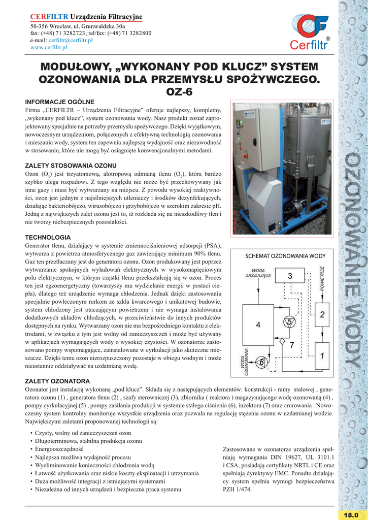 CERFILTR Urządzenia Filtracyjne 50-356 Wrocław, ul. Grunwaldzka 30a fax: (+48) 71 3282723; tel/fax: (+48) 71 3282800 e-mail: [email protected] www.cerfiltr.pl MODUŁOWY, „WYKONANY POD KLUCZ” SYSTEM OZONOWANIA DLA PRZEMYSŁU SPOŻYWCZEGO. OZ-6 INFORMACJE OGÓLNE Firma „CERFILTR – Urządzenia Filtracyjne” oferuje najlepszy, kompletny, „wykonany pod klucz”, system ozonowania wody. Nasz produkt został zaprojektowany specjalnie na potrzeby przemysłu spożywczego. Dzięki wyjątkowym, nowoczesnym urządzeniom, połączonych z efektywną technologią ozonowania i mieszania wody, system ten zapewnia najlepszą wydajność oraz niezawodność w stosowaniu, które nie mogą być osiągnięte konwencjonalnymi metodami. ZALETY STOSOWANIA OZONU Ozon (O3) jest trzyatomową, alotropową odmianą tlenu (O2), która bardzo szybko ulega rozpadowi. Z tego względu nie może być przechowywany jak inne gazy i musi być wytwarzany na miejscu. Z powodu wysokiej reaktywności, ozon jest jednym z najsilniejszych utleniaczy i środków dezynfekujących, działając bakteriobójczo, wirusobójczo i grzybobójczo w szerokim zakresie pH. Jedną z największych zalet ozonu jest to, iż rozkłada się na nieszkodliwy tlen i nie tworzy niebezpiecznych pozostałości. TECHNOLOGIA Generator tlenu, działający w systemie zmiennociśnieniowej adsorpcji (PSA), wytwarza z powietrza atmosferycznego gaz zawierający minimum 90% tlenu. Gaz ten przetłaczany jest do generatora ozonu. Ozon produkowany jest poprzez wytwarzanie spokojnych wyładowań elektrycznych w wysokonapięciowym polu elektrycznym, w którym cząstki tlenu przekształcają się w ozon. Proces ten jest egzoenergetyczny (towarzyszy mu wydzielanie energii w postaci ciepła), dlatego też urządzenie wymaga chłodzenia. Jednak dzięki zastosowaniu specjalnie powleczonym rurkom ze szkła kwarcowego i unikatowej budowie, system chłodzony jest otaczającym powietrzem i nie wymaga instalowania dodatkowych układów chłodzących, w przeciwieństwie do innych produktów dostępnych na rynku. Wytwarzany ozon nie ma bezpośredniego kontaktu z elektrodami, w związku z tym jest wolny od zanieczyszczeń i może być używany w aplikacjach wymagających wody o wysokiej czystości. W ozonatorze zastosowano pompy wspomagające, zainstalowane w cyrkulacji jako skuteczne mieszacze. Dzięki temu ozon nierozpuszczony pozostaje w obiegu wodnym i może nieustannie oddziaływać na uzdatnianą wodę. SCHEMAT OZONOWANIA WODY 3 4 7 ZALETY OZONATORA Ozonator jest instalacją wykonaną „pod klucz”. Składa się z następujących elementów: konstrukcji - ramy stalowej , generatora ozonu (1) , generatora tlenu (2) , szafy sterowniczej (3), zbiornika ( reaktora ) magazynującego wodę ozonowaną (4) , pompy cyrkulacyjnej (5) , pompy zasilania produkcji w systemie stałego ciśnienia (6), inżektora (7) oraz orurowania . Nowoczesny system kontrolny monitoruje wszystkie urządzenia oraz pozwala na regulację stężenia ozonu w uzdatnianej wodzie. Największymi zaletami proponowanej technologii są: • • • • • • • • Czysty, wolny od zanieczyszczeń ozon Długoterminowa, stabilna produkcja ozonu Energooszczędność Najlepsza możliwa wydajność procesu Wyeliminowanie konieczności chłodzenia wodą Łatwość użytkowania oraz niskie koszty eksploatacji i utrzymania Duża możliwość integracji z istniejącymi systemami Niezależna od innych urządzeń i bezpieczna praca systemu Zastosowane w ozonatorze urządzenia spełniają wymagania DIN 19627, UL 3101.1 i CSA, posiadają certyfikaty NRTL i CE oraz spełniają dyrektywy EMC. Ponadto działający system spełnia wymogi bezpieczeństwa PZH 1/474. 18.0 CERFILTR Urządzenia Filtracyjne DANE TECHNICZNO- UZYTKOWE Charakterystyka urządzenia Typ OZ-6 Wydajność systemu: Wymiary: Produkcja ozonu: Pojemność zbiornika wody uzdatnionej: Orurowanie: Medium chłodzące: Gaz zasilający2): Sugerowany rodzaj generatora tlenu: Wydajność pompy odprowadzającej: ( stałego zadanego ciśnienia ) OZONATOR - RZUT Z BOKU 10m3/h 1390 mm długość 790 mm szerokość 1750 mm wysokość 6 g/godz 0,5 m3, stal 316 L stal 316 L naturalna cyrkulacja powietrza 90% tlenu typ AS – 12 działający w oparciu o technologię zmiennociśnieniowej adsorpcji (PSA) do 15 m3/godz 4,5 bar Zalecane warunki pracy Ozonator instalować w miejscach dobrze wentylowanych, odizolowanych od warunków pogodowych, o temperaturze otoczenia 4 – 44 ºC OZONATOR - RZUT Z PRZODU Gwarancja3) 1 rok na części oraz działanie Ozonator znajduje przemysłowych. zastosowanie GŁÓWNIE dla aplikacji 1) Firma stale doskonali swoje produkty i zastrzega sobie prawo zmian w specyfikacji oraz wyglądzie urządzeń bez powiadomienia. 2) Określono dla warunków: ciśnienie 1 atmosfera, temperatura 0 ºC. 3) Niewłaściwe zabezpieczone i niedostatecznie wentylowane pomieszczenie oraz niewłaściwy sposób zasilania stanowią zagrożenie dla ludzi i mogą spowodować uszkodzenia nieobjęte gwarancją. UZDATNIANIE WODY - SYSTEMY FILTRACYJNE DLA PRZEMYSŁU Produkcja: mikrofiltry, wkłady filtracyjne, złoża do usuwania żelaza i manganu, desorbery gazów, zestawy pompowe stałego ciśnienia, poziomu i przepływu. Handel: ozonatory, mikrofiltry, lampy UV, systemy odwróconej osmozy, automatyka przemysłowa, zawory wielodrożne Fleck-Siata, armatura przemysłowa, pompy. Usługi: projektowanie i wykonawstwo stacji usuwania: żelaza i manganu, zmiękczania, usuwania azotanów - azotynów, pierwiastków ciężkich, desorpcja gazów.