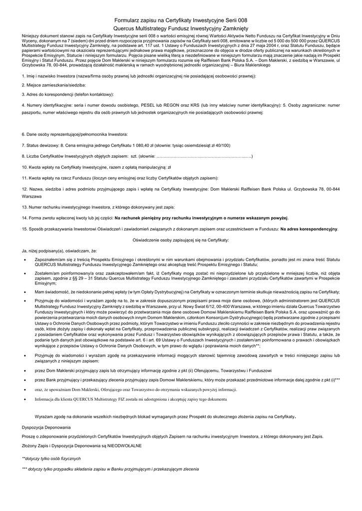 Formularz zapisu na Certyfikaty Inwestycyjne Serii 008 Quercus Multistrategy Fundusz Inwestycyjny Zamknięty Niniejszy dokument stanowi zapis na Certyfikaty Inwestycyjne serii 008 o wartości emisyjnej równej Wartości Aktywów Netto Funduszu na Certyfikat Inwestycyjny w Dniu Wyceny, dokonanym na 7 (siedem) dni przed dniem rozpoczęcia przyjmowania zapisów na Cetyfikaty serii 008, emitowane w liczbie od 5 000 do 500 000 przez QUERCUS Multistrategy Fundusz Inwestycyjny Zamknięty, na podstawie art. 117 ust. 1 Ustawy o Funduszach Inwestycyjnych z dnia 27 maja 2004 r, oraz Statutu Funduszu, będące papierami wartościowymi na okaziciela reprezentującymi jednakowe prawa majątkowe, przeznaczone do objęcia w drodze oferty publicznej na warunkach określonych w Prospekcie Emisyjnym, Statucie i niniejszym formularzu. Pojęcia pisane wieliką literą a niezdefiniowane w niniejszym formularzu mają znaczenie jakie nadają im Prospekt Emisyjny i Statut Funduszu. Przez pojęcie Dom Maklerski w niniejszym formularzu rozumie się Raiffeisen Bank Polska S.A. – Dom Maklerski, z siedzibą w Warszawie, ul Grzybowska 78, 00-844, prowadzącą działalność maklerską w ramach wyodrębnionej jednostki organizacyjnej – Biura Maklerskiego 1. Imię i nazwisko Inwestora (nazwa/firma osoby prawnej lub jednostki organizacyjnej nie posiadającej osobowości prawnej): 2. Miejsce zamieszkania/siedziba: 3. Adres do korespondencji (telefon kontaktowy): 4. Numery identyfikacyjne: seria i numer dowodu osobistego, PESEL lub REGON oraz KRS (lub inny właściwy numer identyfikacyjny): 5. Osoby zagraniczne: numer paszportu, numer właściwego rejestru dla osób prawnych lub jednostek organizacyjnych nie posiadających osobowości prawnej: 6. Dane osoby reprezentującej/pełnomocnika Inwestora: 7. Status dewizowy: 8. Cena emisyjna jednego Certyfikatu 1 080,40 zł (słownie: tysiąc osiemdziesiąt zł 40/100) 8. Liczba Certyfikatów Inwestycyjnych objętych zapisem: szt. (słownie: ………………………………………………………….) 10. Kwota wpłaty na Certyfikaty Inwestycyjne, razem z opłatą manipulacyjną: zł 11. Kwota wpłaty na rzecz Funduszu (iloczyn ceny emisyjnej oraz liczby Certyfikatów objętych zapisem): 12. Nazwa, siedziba i adres podmiotu przyjmującego zapis i wpłatę na Certyfikaty Inwestycyjne: Dom Maklerski Raiffeisen Bank Polska ul. Grzybowska 78, 00-844 Warszawa 13. Numer rachunku inwestycyjnego Inwestora, z którego dokonywany jest zapis: 14. Forma zwrotu wpłaconej kwoty lub jej części: Na rachunek pieniężny przy rachunku inwestycyjnym o numerze wskazanym powyżej. 15. Sposób przekazywania Inwestorowi Oświadczeń i zawiadomień związanych z dokonanym zapisem oraz uczestnictwem w Funduszu: Na adres korespondencyjny. Oświadczenie osoby zapisującej się na Certyfikaty: Ja, niżej podpisany(a), oświadczam, że: Zapoznałem/am się z treścią Prospektu Emisyjnego i określonymi w nim warunkami obejmowania i przydziału Certyfikatów, ponadto jest mi znana treść Statutu QUERCUS Multistrategy Funduszu Inwestycyjnego Zamkniętego oraz akceptuję treść Prospektu Emisyjnego i Statutu; Zostałem/am poinformowany/a oraz zaakceptowałem/am fakt, iż Certyfikaty mogą zostać mi nieprzydzielone lub przydzielone w mniejszej liczbie, niż objęta zapisem, zgodnie z §§ 29 – 31 Statutu Quercus Multistrategy Funduszu Inwestycyjnego Zamkniętego i zasadami przydziału Certyfikatów zawartymi w Prospekcie Emisyjnym; Mam świadomość, że niedokonanie pełnej wpłaty (w tym Opłaty Dystrybucyjnej) na Certyfikaty w oznaczonym terminie skutkuje nieważnością zapisu na Certyfikaty; Przyjmuję do wiadomości i wyrażam zgodę na to, że w zakresie dopuszczonym przepisami prawa moje dane osobowe, (których administratorem jest QUERCUS Multistrategy Fundusz Inwestycyjny Zamknięty z siedzibą w Warszawie, przy ul. Nowy Świat 6/12, 00-400 Warszawa, w którego imieniu działa Quercus Towarzystwo Funduszy Inwestycyjnych i który może powierzyć do przetwarzania moje dane osobowe Domowi Maklerskiemu Raiffeisen Bank Polska S.A. oraz upoważnić go do powierzenia przetwarzania moich danych osobowych innym Domom Maklerskim, członkom Konsorcjum Dystrybucyjnego) będą przetwarzane zgodnie z przepisami Ustawy o Ochronie Danych Osobowych przez podmioty, którym Towarzystwo w imieniu Funduszu zleciło czynności w zakresie niezbędnym do prowadzenia rejestru osób, które złożyły zapisy i dokonały wpłat na Certyfikaty, przeprowadzenia publicznej subskrypcji, realizacji świadczeń z Certyfikatów, realizacji praw związanych z posiadaniem Certyfikatów oraz wykonywania przez Fundusz i Towarzystwo obowiązków wynikających z obowiązujących przepisów prawa i Statutu, a także, że podanie tych danych jest obowiązkowe na podstawie art. 6 i art. 69 Ustawy o Funduszach Inwestycyjnych i zostałem/am poinformowana o prawach i obowiązkach wynikające z przepisów Ustawy o Ochronie Danych Osobowych, w tym prawo do wglądu i poprawiania moich danych**; Przyjmuję do wiadomości i wyrażam zgodę na przekazywanie informacji mogących stanowić tajemnicę zawodową zawartych w treści niniejszego zapisu lub związanych z niniejszym zapisem: przez Dom Maklerski przyjmujący zapis lub otrzymujący informację zgodnie z pkt (ii) Oferującemu, Towarzystwu i Funduszowi przez Bank przyjmujący i przekazujący zlecenia przyjmujący zapis Domowi Maklerskiemu, który może przekazać przedmiotowe informacje dalej zgodnie z pkt (i)*** oraz, że upoważniam Dom Maklerski, Oferującego oraz Towarzystwo do otrzymania wskazanych powyżej informacji. Informacja dla klienta QUERCUS Multistrategy FIZ została mi udostępniona i akceptuję zapisy tego dokumentu Wyrażam zgodę na dokonanie wszelkich niezbędnych blokad wymaganych przez Prospekt do skutecznego złożenia zapisu na Certyfikaty . Dyspozycja Deponowania Proszę o zdeponowanie przydzielonych Certyfikatów Inwestycyjnych objętych Zapisem na rac