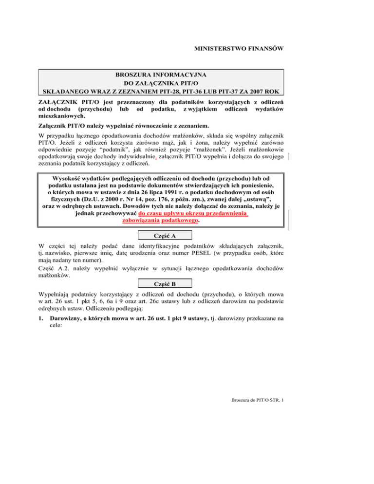 MINISTERSTWO FINANSÓW BROSZURA INFORMACYJNA DO ZAŁĄCZNIKA PIT/O SKŁADANEGO WRAZ Z ZEZNANIEM PIT-28, PIT-36 LUB PIT-37 ZA 2007 ROK ZAŁĄCZNIK PIT/O jest przeznaczony dla podatników korzystających z odliczeń od dochodu (przychodu) lub od podatku, z wyjątkiem odliczeń wydatków mieszkaniowych. Załącznik PIT/O należy wypełniać równocześnie z zeznaniem. W przypadku łącznego opodatkowania dochodów małżonków, składa się wspólny załącznik PIT/O. Jeżeli z odliczeń korzysta zarówno mąż, jak i żona, należy wypełnić zarówno odpowiednie pozycje “podatnik”, jak również pozycje “małżonek”. Jeżeli małżonkowie opodatkowują swoje dochody indywidualnie, załącznik PIT/O wypełnia i dołącza do swojego zeznania podatnik korzystający z odliczeń. Wysokość wydatków podlegających odliczeniu od dochodu (przychodu) lub od podatku ustalana jest na podstawie dokumentów stwierdzających ich poniesienie, o których mowa w ustawie z dnia 26 lipca 1991 r. o podatku dochodowym od osób fizycznych (Dz.U. z 2000 r. Nr 14, poz. 176, z późn. zm.), zwanej dalej „ustawą”, oraz w odrębnych ustawach. Dowodów tych nie należy dołączać do zeznania, należy je jednak przechowywać do czasu upływu okresu przedawnienia zobowiązania podatkowego. Część A W części tej należy podać dane identyfikacyjne podatników składających załącznik, tj. nazwisko, pierwsze imię, datę urodzenia oraz numer PESEL (w przypadku osób, które mają nadany ten numer). Część A.2. należy wypełnić wyłącznie w sytuacji łącznego opodatkowania dochodów małżonków. Część B Wypełniają podatnicy korzystający z odliczeń od dochodu (przychodu), o których mowa w art. 26 ust. 1 pkt 5, 6, 6a i 9 oraz art. 26c ustawy lub z odliczeń darowizn na podstawie odrębnych ustaw. Odliczeniu podlegają: 1. Darowizny, o których mowa w art. 26 ust. 1 pkt 9 ustawy, tj. darowizny przekazane na cele: Broszura do PIT/O STR. 1 a) określone w art. 41) ustawy o działalności pożytku publicznego i o wolontariacie, organizacjom, o których mowa w art. 3 ust. 2 i 32) ustawy o działalności pożytku publicznego i o wolontariacie, lub równoważnym organizacjom określonym w przepisach regulujących działalność pożytku publicznego obowiązujących w innym niż Rzeczpospolita Polska państwie członkowskim Unii Europejskiej lub innym państwie należącym do Europejskiego Obszaru Gospodarczego, prowadzącym działalność pożytku publicznego w sferze zadań publicznych, realizującym te cele (art. 26 ust. 1 pkt 9 lit.a ustawy), b) kultu religijnego (art. 26 ust. 1 pkt 9 lit.b ustawy), c) krwiodawstwa realizowanego przez honorowych dawców krwi zgodnie z art. 6 ustawy o publicznej służbie krwi3), w wysokości ekwiwalentu pieniężnego za pobraną krew określonego przepisami wydanymi na podstawie art. 11 ust. 2 ustawy o publicznej służbie krwi (art. 26 ust. 1 pkt 9 lit.c ustawy). 1) Zgodnie z art. 4 ustawy z dnia 24 kwietnia 2003 r. o działalności pożytku publicznego i o wolontariacie (Dz.U. Nr 96, poz. 873, z późn. zm.), sfera zadań publicznych, o której mowa w tej ustawie, obejmuje w szczególności zadania w zakresie: • pomocy społecznej, w tym pomocy rodzinom i osobom w trudnej sytuacji życiowej oraz wyrównywania szans tych rodzin i osób, • zapewnienia zorganizowanej opieki byłym żołnierzom zawodowym, którzy uzyskali uprawnienie do emerytury wojskowej lub wojskowej renty inwalidzkiej, inwalidom wojennym i wojskowym oraz kombatantom, • działalności charytatywnej, • podtrzymywania tradycji narodowej, pielęgnowania polskości oraz rozwoju świadomości narodowej, obywatelskiej i kulturowej, • działalności na rzecz mniejszości narodowych, • ochrony i promocji zdrowia, • działania na rzecz osób niepełnosprawnych, • promocji zatrudnienia i aktywizacji zawodowej osób pozostających bez pracy i zagrożonych zwolnieniem z pracy, • upowszechniania i ochrony praw kobiet oraz działalność na rzecz równych praw kobiet i mężczyzn, • działalności wspomagającej rozwój gospodarczy, w tym rozwój przedsiębiorczości, • działalności wspomagającej rozwój wspólnot i społeczności lokalnych, • nauki, edukacji, oświaty i wychowania, • krajoznawstwa oraz wypoczynku dzieci i młodzieży, • kultury, sztuki, ochrony dóbr kultury i tradycji, • upowszechniania kultury fizycznej i sportu, • ekologii i ochrony zwierząt oraz ochrony dziedzictwa przyrodniczego, • porządku i bezpieczeństwa publicznego oraz przeciwdziałania patologiom społecznym, • upowszechniania wiedzy i umiejętności na rzecz obronności państwa, • upowszechniania i ochrony wolności i praw człowieka oraz swobód obywatelskich, a także działań wspomagających rozwój demokracji, • ratownictwa i ochrony ludności, • pomocy ofiarom katastrof, klęsk żywiołowych, konfliktów zbrojnych i wojen w kraju i za granicą, • upowszechniania i ochrony praw konsumentów, • działań na rzecz integracji europejskiej oraz rozwijania kontaktów i współpracy między społeczeństwami, • promocji i organizacji wolontariatu. 2) Organizacje, o których mowa w art. 3 ust. 2 i 3 ustawy o działalności pożytku publicznego i o wolontariacie, to: • organizacje pozarządowe, którymi są, niebędące jednostkami sektora finansów publicznych, w rozumieniu przepisów o finansach publicznych, i niedziałające w celu osiągnięcia zysku, osoby prawne lub jednostki nieposiadające osobowości prawnej utworzone na podstawie przepisów ustaw, w tym fundacje i stowarzyszenia, z zastrzeżeniem ust. 4 ww. artykułu, • stowarzyszenia jednostek samorządu terytorialnego, • osoby prawne i jednostki organizacyjne działające na podstawie przepisów o stosunku Państwa do Kościoła Katolickiego w Rzeczypospolitej Polskiej, o stosunku Państwa do innych kościołów i związków wyznaniowych oraz o gwarancjach wolności sumienia i wyznania, jeżeli ich cele s