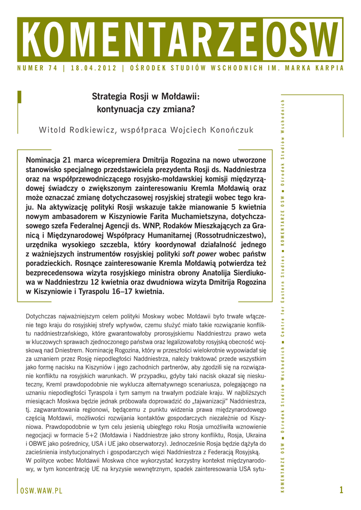 Komentarze osw O S W. W A W. P L S t u d i ó w O ś r o d e k OSW K OMENTARZE S t u d i e s E a s t e r n f o r C e n t r e Ws c h o d n i c h S t u d i ó w Dotychczas najważniejszym celem polityki Moskwy wobec Mołdawii było trwałe włączenie tego kraju do rosyjskiej strefy wpływów, czemu służyć miało takie rozwiązanie konfliktu naddniestrzańskiego, które gwarantowałoby prorosyjskiemu Naddniestrzu prawo weta w kluczowych sprawach zjednoczonego państwa oraz legalizowałoby rosyjską obecność wojskową nad Dniestrem. Nominację Rogozina, który w przeszłości wielokrotnie wypowiadał się za uznaniem przez Rosję niepodległości Naddniestrza, należy traktować przede wszystkim jako formę nacisku na Kiszyniów i jego zachodnich partnerów, aby zgodzili się na rozwiązanie konfliktu na rosyjskich warunkach. W przypadku, gdyby taki nacisk okazał się nieskuteczny, Kreml prawdopodobnie nie wyklucza alternatywnego scenariusza, polegającego na uznaniu niepodległości Tyraspola i tym samym na trwałym podziale kraju. W najbliższych miesiącach Moskwa będzie jednak próbowała doprowadzić do „tajwanizacji” Naddniestrza, tj. zagwarantowania regionowi, będącemu z punktu widzenia prawa międzynarodowego częścią Mołdawii, możliwości rozwijania kontaktów gospodarczych niezależnie od Kiszyniowa. Prawdopodobnie w tym celu jesienią ubiegłego roku Rosja umożliwiła wznowienie negocjacji w formacie 5+2 (Mołdawia i Naddniestrze jako strony konfliktu, Rosja, Ukraina i OBWE jako pośrednicy, USA i UE jako obserwatorzy). Jednocześnie Rosja będzie dążyła do zacieśnienia instytucjonalnych i gospodarczych więzi Naddniestrza z Federacją Rosyjską. W polityce wobec Mołdawii Moskwa chce wykorzystać korzystny kontekst międzynarodowy, w tym koncentrację UE na kryzysie wewnętrznym, spadek zainteresowania USA sytu- O ś r o d e k Nominacja 21 marca wicepremiera Dmitrija Rogozina na nowo utworzone stanowisko specjalnego przedstawiciela prezydenta Rosji ds. Naddniestrza oraz na współprzewodniczącego rosyjsko-mołdawskiej komisji międzyrządowej świadczy o zwiększonym zainteresowaniu Kremla Mołdawią oraz może oznaczać zmianę dotychczasowej rosyjskiej strategii wobec tego kraju. Na aktywizację polityki Rosji wskazuje także mianowanie 5 kwietnia nowym ambasadorem w Kiszyniowie Farita Muchamietszyna, dotychczasowego szefa Federalnej Agencji ds. WNP, Rodaków Mieszkających za Granicą i Międzynarodowej Współpracy Humanitarnej (Rossotrudniczestwo), urzędnika wysokiego szczebla, który koordynował działalność jednego z ważniejszych instrumentów rosyjskiej polityki soft power wobec państw poradzieckich. Rosnące zainteresowanie Kremla Mołdawią potwierdza też bezprecedensowa wizyta rosyjskiego ministra obrony Anatolija Sierdiukowa w Naddniestrzu 12 kwietnia oraz dwudniowa wizyta Dmitrija Rogozina w Kiszyniowie i Tyraspolu 16–17 kwietnia. OSW Witold Rodkiewicz, współpraca Wojciech Konończuk K OMENTARZE Strategia Rosji w Mołdawii: kontynuacja czy zmiana? Ws c h o d n i c h numer 74 | 18.04.2012 | ośrodek studiów wschodnich im. marka karpia 1 Komentarze osw n u m e r 7 4 | 1 8 . 0 4 . 2 0 1 2 | o ś r o d e k s t u d i ó w w s c h o d n i c h i m . m a r ka ka r p i a acją w Europie Wschodniej oraz rosnącą gotowość Niemiec do rozwiązywania problemów w regionie jako ważnego warunku pogłębiania relacji UE i Berlina z Rosją. Mołdawia w rosyjskiej polityce zagranicznej Cele rosyjskiej polityki wobec Mołdawii formułowane są w kontekście dwóch kwestii mających kluczowe, w przekonaniu rosyjskiej elity, znaczenie dla międzynarodowej pozycji Rosji: ustalenia reguł relacji z Zachodem w dziedzinie bezpieczeństwa w Europie oraz trwałego włączenia poradzieckich państw z Europy Wschodniej do rosyjskiej strefy wpływów, a tym samym rozstrzygnięcia na swoją korzyść geopolitycznej rywalizacji z Unią Europejską w regionie. Dla realizacji tych celów Rosja zmierza do: 1. Utrzymania obecności wojskowej w Mołdawii, co ma gwarantować pozostanie Mołdawii poza NATO. Moskwa dąży w ten sposób również do zachowania nieformalnej zasady, że w państwach poradzieckich ma prawo jednostronnie decydować o swojej obecności wojskowej. Pojawienie się w Rumunii elementów amerykańskiej tarczy antyrakietowej dodatkowo zwiększa zainteresowanie Rosji utrzymaniem swojej obecności w Naddniestrzu, ponieważ umożliwia zainstalowanie rakiet średniego zasięgu jako „odpowiedzi” na antyrakiety w Rumunii. 2. Niedopuszczenie do integracji Mołdawii z UE. Rosja dąży do zmiany kierunku integracji Mołdawii z unijnego na euroazjatycki, w tym niedopuszczenia do wejścia w życie negocjowanej obecnie umowy stowarzyszeniowej Nominację Rogozina należy z UE. W sferze ekonomicznej celem Rosji jest także zablokowanie implementacji traktować przede wszystkim przez Kiszyniów trzeciego pakietu energejako formę nacisku na Kiszyniów tycznego. Moskwa stara się skłonić elity i jego zachodnich partnerów, mołdawskie do przystąpienia do Wspólaby zgodzili się na rozwiązanie nej Przestrzeni Gospodarczej1. Realizacja konfliktu na rosyjskich warunkach. tych celów służyłaby także zademonstrowaniu Brukseli i państwom poradzieckim, że próby realizacji projektów integracyjnych na obszarze WNP bez aprobaty Moskwy są skazane na niepowodzenie. 3. Rozwiązanie problemu Naddniestrza według formuły tzw. memorandum Kozaka z 2003 roku, którego istotą była „asymetryczna federalizacja” Mołdawii – maksymalizująca wpływ Naddniestrza na politykę władz federalnych i minimalizująca wpływ władz federalnych na Naddniestrze, przy jednoczesnym zagwarantowaniu dalszego stacjonowania wojsk rosyjskich w regionie w charakterze gwaranta porozumienia. Takie rozwiązanie zmieniałoby układ polityczny w państwie mołdawskim na korzyść sił prorosyjskich. 1 Funkcjonująca od lipca 2010 roku struktura integracji gospodarczej Rosji, Biało