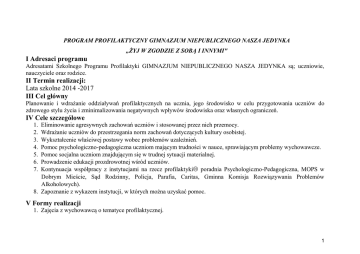 PROGRAM PROFILAKTYCZNY GIMNAZJUM NIEPUBLICZNEGO NASZA JEDYNKA „ŻYJ W ZGODZIE Z SOBĄ I INNYMI" I Adresaci programu Adresatami Szkolnego Programu Profilaktyki GIMNAZJUM NIEPUBLICZNEGO NASZA JEDYNKA są; uczniowie, nauczyciele oraz rodzice. II Termin realizacji: Lata szkolne 2014 -2017 III Cel główny Planowanie i wdrażanie oddziaływań profilaktycznych na ucznia, jego środowisko w celu przygotowania uczniów do zdrowego stylu życia i zminimalizowania negatywnych wpływów środowiska oraz własnych ograniczeń. IV Cele szczegółowe Eliminowanie agresywnych zachowań uczniów i stosowanej przez nich przemocy. Wdrażanie uczniów do przestrzegania norm zachowań dotyczących kultury osobistej. Wykształcenie właściwej postawy wobec problemów uzależnień. Pomoc psychologiczno-pedagogiczna uczniom mającym trudności w nauce, sprawiającym problemy wychowawcze. Pomoc socjalna uczniom znajdującym się w trudnej sytuacji materialnej. Prowadzenie edukacji prozdrowotnej wśród uczniów. Kontynuacja współpracy z instytucjami na rzecz profilaktyki poradnia Psychologiczno-Pedagogiczna, MOPS w Dobrym Mieście, Sąd Rodzinny, Policja, Parafia, Caritas, Gminna Komisja Rozwiązywania Problemów Alkoholowych). 8. Zapoznanie z wykazem instytucji, w których można uzyskać pomoc. 1. 2. 3. 4. 5. 6. 7. V Formy realizacji 1. Zajęcia z wychowawcą o tematyce profilaktycznej. 1 2. 3. 4. 5. 6. Programy profilaktyczne (spektakle, konkursy, gazetki, plakaty, zajęcia warsztatowe, prezentacje). Współpraca z innymi szkołami. Indywidualne spotkania z uczniami. Spotkania z rodzicami. Gry i zabawy integracyjne, sportowe, wyjazdy krajoznawcze. VI Oczekiwane efekty 1. Zmniejszenie przypadków zachowań agresywnych, łamania kodeksu ucznia, ulegania negatywnym wpływom środowiska. 2. Zmniejszenie zagrożeń sięgania przez uczniów po używki oraz środki odurzające. 3. Wzrost zainteresowań sportem, kulturą, alternatywnymi sposobami spędzania wolnego czasu. 4. Uczestniczenie w zdrowym stylu życia. 5. Poprawa relacji z rówieśnikami, rodzicami, nauczycielami. 6. Wzbogacenie wiedzy uczniów z zakresu profilaktyki. 7. Korzystanie przez rodziców oraz uczniów ze wsparcia profesjonalnych instytucji. VII Ewaluacja 1. Ankiety 2. Obserwacje 3. Rozmowy 2 VIII. Szczegółowy rozkład działań ZADANIA SPOSÓB REALIZACJI CEL 1: Kształtowanie świadomości negatywnego działania środków psychoaktywnych 1. Ukazanie prawnych i moralnych spotkania dla uczniów i pedagogizacja rodziców z udziałem zaproszonych skutków posiadania, używania i specjalistów (np. prawnik, policjant, lekarz, pielęgniarka, psycholog, pracownik rozprowadzania środków ośrodka terapii uzależnień) psychoaktywnych, tj. narkotyków, akcja plakatowa UZALEŻNIENIOM STOP alkoholu, papierosów, leków, używek, lekcje wychowawcze, gazetki tematyczne środków dopingujących warsztaty profilaktyczne UZALEŻNIENIOM STOP 2. Zapobieganie uzależnieniom spektakle o tematyce profilaktycznej, np. „Sąd nad papierosem", filmy edukacyjne kontrola boiska, toalet, okolic szkoły w przypadku stwierdzenia posiadania lub używania środków psychoaktywnych szybka interwencja i natychmiastowe powiadomienie rodziców lub prawnych opiekunów , wzmacnianie w uczniach umiejętności odmawiania - warsztaty asertywności 3 CEL 2: Kształtowanie postaw akceptowanych społecznie 1. Szczegółowa kontrola frekwencji uczniów bieżąca kontrola obecności uczniów na lekcjach przestrzeganie strategii postępowania z uczniami wykazującymi wysoką absencję na zajęciach lekcyjnych obowiązkowe wypełnianie strony w dzienniku FREKWENCJA bieżące informowanie rodziców o nieobecnościach młodzieży na lekcjach i wynikających z tego konsekwencjach współpraca z instytucjami: Policja, Kuratorzy sądowi, Sad dla nieletnich 2. Promowanie postaw akceptowanych społecznie przestrzeganie statutu szkoły (system nagród i kar) apele szkolne kształtowanie osobowości uczniów opartej na systemie wartości określonej w WIZJI ABSOLWENTA GIMNAZJUM 3. Uwrażliwianie na piękno języka. Walka z wulgaryzmami. reagowanie na wszelkie przejawy niekulturalnego wysławiania się wdrażanie uczniów do zajmowania prawidłowej postawy wobec tych, którzy używają wulgaryzmów, akcja plakatowa STOP WULGARYZMOM. 4 CEL 3: Budowanie poczucia bezpieczeństwa w szkole 1. Zapobieganie agresji i przemocy dyskusja w klasach na temat agresji słownej i fizycznej organizacja zajęć warsztatowych na temat radzenia sobie z przemocą i agresją konsekwentne i systematyczne reagowanie na każdy przejaw agresji i przemocy spotkania z pracownikami policji w celu ukazania odpowiedzialności uczniów za swoje czyny w świetle prawa katechezy dotyczące dekalogu bieżące informowanie rodziców o przejawach agresywnego zachowania dziecka pogadanki dla rodziców na temat przyczyn i skutków agresji słownej i fizycznej trening umiejętności negocjowania i rozwiązywania konfliktów uczeń - uczeń, uczeń - nauczyciel 2. Tworzenie atmosfery bezpieczeństwa w szkole informowanie uczniów o celu istnienia i sposobie funkcjonowania monitoringu w szkole przedstawienie młodzieży procedur postępowania w przypadku łamania zasad bezpieczeństwa (zasad BHP, zasad p-poż, statutu szkoły) integracja uczniów na poziomie klas i międzyklasowym (imprezy szkolne, uroczystości, warsztaty) budowanie relacji opartych na zaufaniu między uczniem, a pracownikiem szkoły uczenie umiejętnego zachowania się w sytuacjach zagrażających zdrowiu i życiu 5 (pierwsza pomoc przedmedyczna) walka z mobbingiem: budowanie poczucia własnej wartości kreowanie postaw asertywnych doskonalenie umiejętności szukania i udzielania pomocy zapoznanie gimnazjalistów i ich rodziców ze strategiami postępowania wobec uczniów przejawiających negatywne zachowania 3. Zapobieganie kradzieżom w szkole przestrzeganie uczniów przed przynoszeniem cennych przedmiotów do szkoły w razie zaistnienia kradzieży natychmias