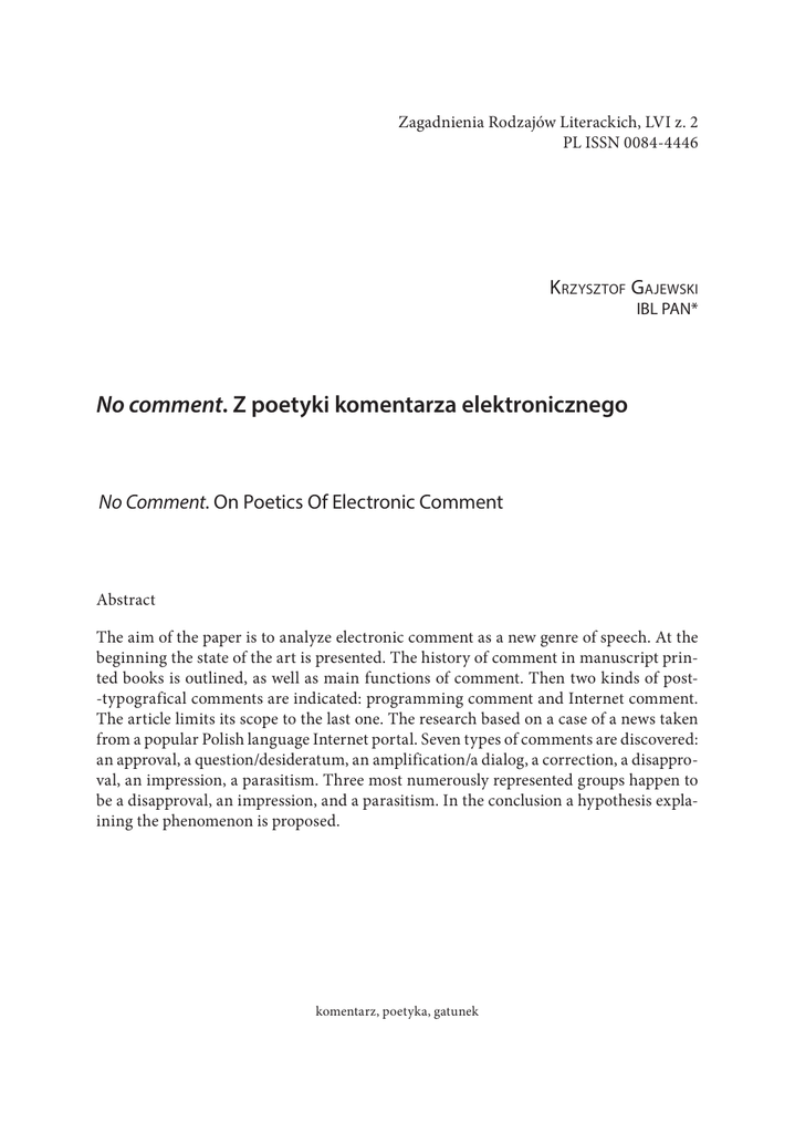 Zagadnienia Rodzajów Literackich, LVI z. 2 PL ISSN 0084-4446 Krzysztof Gajewski IBL PAN* No comment. Z poetyki komentarza elektronicznego No Comment. On Poetics Of Electronic Comment Abstract The aim of the paper is to analyze electronic comment as a new genre of speech. At the beginning the state of the art is presented. The history of comment in manuscript printed books is outlined, as well as main functions of comment. Then two kinds of post-typografical comments are indicated: programming comment and Internet comment. The article limits its scope to the last one. The research based on a case of a news taken from a popular Polish language Internet portal. Seven types of comments are discovered: an approval, a question/desideratum, an amplification/a dialog, a correction, a disapproval, an impression, a parasitism. Three most numerously represented groups happen to be a disapproval, an impression, and a parasitism. In the conclusion a hypothesis explaining the phenomenon is proposed. komentarz, poetyka, gatunek *Instytut Badań Literackich PAN ul. Nowy Świat 72, 00-330 Warszawa e-mail: [email protected] Stan badań Komentarz, jeden z najstarszych intertekstualnych gatunków mowy, znany jest niemal od początków piśmiennictwa. Starożytność przekazała nam bogatą komentatorską twórczość myślicieli z epoki hellenistycznej, na wieki średnie przypadł rozkwit tego gatunku. Epoka nowożytna w mniejszym stopniu sprzyjała działalności komentatorskiej, co wiąże się być może z umacnianiem się przekonania o wartości oryginalności i indywidualnego autorstwa tekstu literackiego czy filozoficznego. Nasza współczesność wydaje się przynosić renesans komentarza, gdyż można zaryzykować tezę, że jeszcze nigdy komentowanie nie było tak popularne jak dziś — w epoce rozwoju mediów elektronicznych i ufundowanej na nich formacji zwanej kulturą uczestnictwa, która udostępnia na skalę masową narzędzia umożliwiające łatwe dzielenie się nią, organizowanie jej i komentowanie właśnie (Jenkins 2009: 8). Komentarz w świecie posttypograficznym, pojawiający się pod artykułem na portalu informacyjnym, pod wpisem na blogu, pod postem na forum internetowym czy w serwisie społecznościowym zyskuje niekiedy rangę autonomicznej wypowiedzi, bywa cytowany, staje się zarzewiem publicznej dysputy. Niniejszy artykuł przedstawia próbę teoretycznego ujęcia zagadnienia morfologii i funkcji komentarza internetowego. Etymologia słowa „komentarz” odsłania jego dwuznaczność. W łacinie odnajdujemy bowiem dwa podobnie brzmiące, ale znaczeniowo nietożsame czasowniki: commentor oraz comminiscor (zob. Korpanty 2001). Ten pierwszy znaczy tyle, co „myśleć, badać, omawiać, pisać, obmyślać”, stąd formy rzeczownikowe: commentor (wynalazca, sprawca) oraz commentator (wynalazca, autor, komentator), commentatio (myślenie, rozumowanie, opis, interpretacja) oraz commentarius (notatnik, sprawozdanie, zapiski, traktat, notatki). Z kolei czasownik comminiscor odsyła do słów „wymyślać, zmyślać, stwierdzać fałszywie”. Pochodzi odeń forma przymiotnikowo-rzeczownikowa commentus (udawany; pomysł, wymysł, dowodzenie). W obu jednak tych formach widoczna pozostaje struktura złożenia: ‚com’ (czyli cum, tzn. ‚z’) oraz ‚mens’ (myśl)1. Widać tu strukturalne podobieństwo do słowa ‚komunikacja’, w którego sensie Yves Winkin dostrzega wpisaną ideę wymiany daru (Winkin 2007: 206). Pojawia się tu dwoistość semantyczna, której polszczyzna — w odróżnieniu od angielszczyzny — po łacinie nie odziedziczyła. Język angielski dysponuje dwowa słowami: commentary i comment. Commentary to transmitowana przez media relacja z dziejącego się właśnie wydarzenia albo książka lub artykuł objaśniające inną książkę, utwór literacki lub koncepcję. Comment zaś to wyrażone przekonanie na temat kogoś lub czegoś, 1 Co kieruje nas w polszczyźnie dość nieoczekiwanie ku słowu „zmysł”. 114 Krzysztof Gajewski krytyka albo dyskusja czegoś, co ktoś powiedział lub zrobił (Summers 2003)2. W polszczyźnie napotykamy tylko jedno słowo: ‚komentarz’. Szymczak notuje następujące znaczenia: przypisy do tekstu; wypowiedź omawiająca aktualne zdarzenia; krytyczne uwagi o kimś lub o czymś (Szymczak 1982). Warto dodać, że w najnowszej polszczyźnie elektronicznej upowszechnia się słowo ‚koment’ w znaczeniu komentarza do artykułu opublikowanego na portalu internetowym (zob. np. Miejski słownik slangu i mowy potocznej, 03.07.2013). Słownik terminów literackich notuje dwa sensy: komentarz edytorski (filologiczny), czyli aparat krytyczny dołączony do edycji tekstu literackiego, oraz komentarz autorski —element dyskursu narratora auktorialnego, wyrażający przekonania odnośnie do świata przedstawionego i fabuły (zob. Głowiński i in. 1998). Słownik rodzajów i gatunków literackich dorzuca jeszcze komentarz prasowy, czyli artykuł lub innego typu wypowiedź o charakterze publicystycznym (Gawron 2006). Autorzy haseł z przywoływanych słowników wymieniają następujące funkcje komentarza filologicznego (por. Markiewicz 2000): 1. wyjaśnianie form językowych 2. dostarczanie informacji faktograficznych 3. objaśnianie aluzji 4. objaśnianie miejsc, do których zrozumienia wymagana jest specjalistyczna wiedza 5. wskazanie miejsc niezrozumiałych dla komentatora. Komentarz autorski natomiast miałby służyć: 1. ocenie 2. wartościowaniu 3. wyjaśnieniu przedstawionych w utworze literackim zdarzeń, postaw i sytuacji (por. Bogdanowska 2003). Danuta Ulicka wyróżnia dwa typy komentarzy: oficjalny oraz zastępczy. Ten pierwszy wspiera legitymizację panującej władzy i sankcjonuje interpretację kanoniczną, drugi umożliwia oddolne działanie subwersywne, co czyni poprzez ukrywanie mowy autonomicznej pod postacią komentarza i przemycanie w ten sposób treści wywrotowych (Ulicka 2011: 18). Użyteczną charaktery