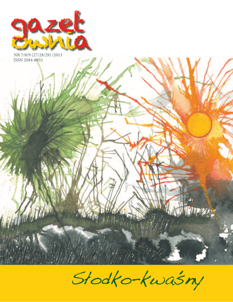 NR 7/8/9 (27/28/29) /2013 Słodko–kwaśny 012 038 004 048 026 046 NA PAPIERZE NA ZDROWIE Bez tytułu Kasia Bartsch-Cielebon Smaki słodko-kwaśne 030 048 DROGOWSKAZY CHOPIN WIECZNIE ŻYWY Finał konkursu Przemoc w związkach nastolatków Cierpienia młodego Chopina Agnieszka Czapczyńska Piotr Mysłakowski 012 038 OD REDAKTORA Jolanta Wroczyńska 006 056 BEZKRESY PIRUETY... GUZIK Baku Taniec na słodko czy na kwaśno? Kolory w modzie słodko-kwaśny Waldemar Ławecki Agnieszka Kaczorowska Klaudia Ofiara 019 040 060 BEZKRESY WYWIAD ZAKŁADKA Nineczka - Krzemieńczanka na tle epoki Spotkanie na Półpiętrze? Oko w oko ze sobą. Helena Haskiewicz Kasia Bożyk Zamiecie wszystko, zawieje Agata Wiśniewska Gazetownia PIstacja Media 2013 062 Wydawca PIstacja Media Katarzyna Bogucka 078 Stowarzyszenie Pi-stacja [email protected] [email protected] www.pi-stacja.org www.gazetownia.eu Biuro reklamy [email protected] Zespół Redakcyjny Katarzyna Bogucka Joanna Dudek- Ławecka Joanna Wroczyńska Jolanta Wroczyńska 062 076 Bajki nowe SZORT MAT Ucho igielne Dualizm (...) Michał Lewandowski Janina Kądziołka-Filip 064 078 WIEDŹMA BABEL powieść w odcinkach cz. XXI My Travels Jerusalem. The Earth was Shaken part I MOJE PODRÓŻE Jerozolima. Zatrzęsła się ziemia częćś I Agnieszka Thomassen Kasia Bartsch-Cielebon 070 MYŚLI Z ŻYCIA Słodko-Kwaśny. Kwaśno-słodki. Anna Ciemniecka 074 ŻAK W pięciu smakach Paweł Radźko Foto Katarzyna Bogucka Waldemar Ławecki Agnieszka Thomassen Artur Radźko Ilustracje Aleksander Bogucki (pingwin) Mintoft (okładka, logo Chopin) Paweł Siwochowicz (wiedźma) Opracowanie graficzne i skład Agnieszka Maślanka Współpraca techniczna Agnieszka Betkier Wydawnictwo zastrzega, iż dalsze rozpowszechnianie materiałów opublikowanych w piśmie Gazetownia bez zgody Wydawcy jest zabronione na podstawie ar t. 25 ust.1 pkt 1b prawa autorskiego. Copyright PIstacja Media 2013 Od redaktora Słodko-kwaśny to nie tylko smak orientalnej kuchni czy posypana cukrem cytryna, czy polany miodem kwaszony ogórek, czy… – to po prostu smak życia. Przekonałam się o tym po lekturze artykułów, które publikujemy w wakacyjnym numerze „Gazetowni”. Zarówno nasi stali autorzy, jak i twórcy opowiadań nadesłanych na słodko-kwaśny konkurs literacki podeszli do tematu „na poważnie”, przedstawiając prawdziwie ludzkie historie, w których mieszają się radość ze smutkiem i przyjemność z cierpieniem. Te różne smaki życia stanowią nieodzowną część naszego człowieczeństwa. To pośród śmiechu przez łzy szukamy sensu życia i staramy się zrozumieć jak smakuje szczęście, do którego wszyscy nieustannie dążymy. A szczęście nie jest przecież nieuchwytną tęczową bańką mydlaną, lecz „na szczęście” jest blisko nas. Szukamy go w dobrych relacjach z innymi ludźmi oraz pożytecznej pracy, czyli pośród różnych smaków życia. Smakujcie razem z nami! Jolanta Wroczyńska Gazetownia PIstacja Media 2013 Twoją myśl przekażemy innym... Na Twoje pytanie poszukamy odpowiedzi przemoc w związkach nastolatków Agnieszka Czapczyńska Gazetownia PIstacja Media 2013 Drogowskazy kierunek EGO Agnieszka Czapczyńska - psychoterapeutka, pracuje metodami terapii przez sztukę i psychologii zorientowanej na proces, specjalistka w zakresie przeciwdziałania przemocy w rodzinie, trenerka warsztatu Polskiego Towarzystwa Psychologicznego. Od kilkunastu lat zajmuje się terapią oraz warsztatami rozwoju osobistego dla kobiet. Współtwórczyni Fundacji Miejsce Kobiet; Nowy Świat Kobiet. Jestem mamą 17-letniej Beaty. Beata jest śliczną dziewczyną, ma chłopaka. Przychodzili razem do nas do domu, cieszyliśmy się z mężem, bo wszystko wydawało się układać jak najlepiej. Paweł był taki opiekuńczy, potrafił przypomnieć Beacie, żeby się cieplej ubrała kiedy wychodzili gdzieś razem. Zawsze przyprowadzał ją do domu punktualnie. Był wobec niej szarmancki, co nas ujmowało. Od pewnego momentu jednak Beata zaczęła się zmieniać. Kilka razy widziałam jak moja córka płacze w ukryciu, nie chce wychodzić z domu, mówi, że nienawidzi swojego życia, przestała chodzić na swoje ulubione zajęcia. Potrafi spać ze swoim telefonem komórkowym pod poduszką, jakby ciągle czekała na jakąś wiadomość. Najpierw pomyślałam, że rozstali się z Pawłem. Potem coś mnie tknęło, córka ma sąsiadkę, przyjaciółkę - wybrałam się do nich i poprosiłam ją o rozmowę. Okazało się, że Paweł jest chorobliwie zazdrosny o swoją dziewczynę. Podobno zabronił jej widywania się z koleżankami i kolegami z klasy, odprowadzał ją na wszystkie zajęcia i rozliczał z każdej minuty spóźnienia, wysyłał dziesiątki sms-ów i wymagał natychmiastowej odpowiedzi. Raz doszło do szarpaniny, kiedy Beata powiedziała, że nie chce tak dalej. To już nie jest dramat zakochanej nastolatki, to jakiś koszmar. Nie wiem co mam robić. Zakazać jej kontaktów z Pawłem? Poinformować szkołę? Boję się, że mojej córce może przyjść coś głupiego do głowy! 007 Przemoc w związkach młodych ludzi przybiera różne formy. Większość ofiar przemocy fizycznej i seksualnej w związkach to dziewczęta, chłopcom zdarza się zwykle doświadczenie przemocy psychicznej ze strony partnerki. Najbardziej widoczną formą nadużycia jest przemoc fizyczna. Ofiary często chronią sprawcę, minimalizują przemoc jakiej doświadczają, biorą na siebie odpowiedzialność za zachowania partnera. Rodzice skazani są na domysły. Niepokojącym sygnałem są ślady przemocy fizycznej, których pochodzenia córka nie umie wyjaśnić np. siniaki, ślady na ciele wyglądające jak od uderzenia dłonią, wyrwane kępy włosów, porwana odzież, oparzenia itp. Równie niepokojące jak brak wyjaśnień czy ukrywanie obrażeń, są wyjaśnienia, które nie pasują do rodzaju albo rozmiaru śladów lub powtarzające się urazy. Przemocą jest degradowanie psychiczne pa