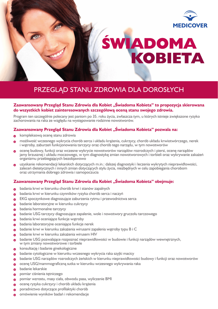 PRZEGLĄD STANU ZDROWIA DLA DOROSŁYCH Zaawansowany Przegląd Stanu Zdrowia dla Kobiet „Świadoma Kobieta” to propozycja skierowana do wszystkich kobiet zainteresowanych szczegółową oceną stanu swojego zdrowia. Program ten szczególnie polecany jest paniom po 35. roku życia, zwłaszcza tym, u których istnieje zwiększone ryzyko zachorowania na raka ze względu na występowanie rodzinne nowotworów. Zaawansowany Przegląd Stanu Zdrowia dla Kobiet „Świadoma Kobieta” pozwala na: k ompleksową ocenę stanu zdrowia m ożliwość wczesnego wykrycia chorób serca i układu krążenia, cukrzycy, chorób układu krwiotwórczego, nerek i wątroby, zaburzeń funkcjonowania tarczycy oraz chorób tego narządu, w tym nowotworów ocenę budowy, funkcji oraz wczesne wykrycie nowotworów narządów rozrodczych i piersi, ocenę narządów jamy brzusznej i układu moczowego, w tym diagnostykę zmian nowotworowych i torbieli oraz wykrywanie zakażeń organizmu przebiegających bezobjawowo u zyskanie rekomendacji lekarskich dotyczących m.in.: dalszej diagnostyki i leczenia wykrytych nieprawidłowości, zaleceń dietetycznych i innych zmian dotyczących stylu życia, niezbędnych w celu zapobiegania chorobom oraz utrzymania dobrego zdrowia i samopoczucia Zaawansowany Przegląd Stanu Zdrowia dla Kobiet „Świadoma Kobieta” obejmuje: badania krwi w kierunku chorób krwi i stanów zapalnych b adania krwi w kierunku czynników ryzyka chorób serca i naczyń EKG spoczynkowe diagnozujące zaburzenia rytmu i przewodnictwa serca b adanie laboratoryjne w kierunku cukrzycy badania hormonalne tarczycy b adanie USG tarczycy diagnozujące zapalenie, wole i nowotwory gruczołu tarczowego badania krwi oceniające funkcje wątroby b adania laboratoryjne oceniające funkcje nerek badanie krwi w kierunku zakażenia wirusami zapalenia wątroby typu B i C badanie krwi w kierunku zakażenia wirusem HIV b adanie USG pozwalające rozpoznać nieprawidłowości w budowie i funkcji narządów wewnętrznych, w tym zmiany nowotworowe i torbiele konsultację i badanie ginekologiczne b adanie cytologiczne w kierunku wczesnego wykrycia raka szyjki macicy badanie USG narządów rozrodczych żeńskich w kierunku nieprawidłowości budowy i funkcji oraz nowotworów o cenę USG/mammograficzną sutka w kierunku wczesnego wykrywania raka b adanie lekarskie pomiar ciśnienia tętniczego p omiar wzrostu, masy ciała, obwodu pasa, wyliczenie BMI ocenę ryzyka cukrzycy i chorób układu krążenia p oradnictwo dotyczące profilaktyki chorób omówienie wyników badań i rekomendacje PRZEGLĄDY STANÓW ZDROWIA – PORÓWNANIE PROGRAMÓW Dbam o Siebie Świadoma Kobieta Świadomy Mężczyzna Zdrowy Uczeń Moc Zdrowia badania krwi w kierunku chorób krwi i stanów zapalnych ✓ ✓ ✓ ✓ ✓ badania krwi w kierunku czynników ryzyka chorób serca i naczyń ✓ ✓ ✓ ✓ ✓ EKG spoczynkowe diagnozujące zaburzenia rytmu i przewodnictwa serca ✓ ✓ ✓ Zakres usług Ocena układu krwiotwórczego Ocena układu sercowonaczyniowego Ocena metabolizmu USG tętnic szyjnych oceniające stopień zwężenia i zagrożenie udarem mózgu ✓ test wysiłkowy EKG diagnozujący niedokrwienie serca ✓ Echo serca wykrywające wady serca i nieprawidłowości w funkcji mięśnia sercowego ✓ tomografia komputerowa naczyn wieńcowych wykrywająca obecność zmian miażdżycowych ✓ badanie laboratoryjne w kierunku cukrzycy ✓ ✓ ✓ ✓ ✓ badania hormonalne tarczycy ✓ ✓ ✓ ✓ ✓ ✓ ✓ badanie USG tarczycy diagnozujące zapalenie, wole i nowotwory gruczołu tarczowego Ocena wątroby i funkcji nerek ✓ badania krwi oceniające funkcje wątroby ✓ ✓ ✓ badania laboratoryjne oceniające funkcje nerek ✓ ✓ ✓ ✓ ✓ badanie mikroalbuminurii w kierunku wczesnego uszkodzenia nerek Wykrywanie zakażeń bezobjawowych ✓ badanie krwi w kierunku zakażenia wirusami zapalenia wątroby typu B i C ✓ ✓ ✓ ✓ badanie krwi w kierunku zakażenia wirusem HIV ✓ ✓ ✓ ✓ badanie krwi w kierunku boreliozy Ocena narządów jamy brzusznej i układu moczowego Ocena narządów rozrodczych żeńskich i piersi ✓ badanie USG pozwalające rozpoznać nieprawidłowości w budowie i funkcji narządów wewnętrznych, w tym zmiany nowotworowe i torbiele ✓ ✓ ✓ badanie laboratoryjne w kierunku raka jelita grubego ✓ ✓ konsultacja i badanie ginekologiczne ✓ ✓ badanie cytologiczne w kierunku wczesnego wykrycia raka szyjki macicy ✓ ✓ badanie USG narządów rozrodczych żeńskich w kierunku nieprawidłowości budowy i funkcji oraz nowotworów ✓ ✓ ocena USG/mammograficzna sutka w kierunku wczesnego wykrywania raka ✓ ✓ badania laboratoryjne w kierunku predyspozycji do wystąpienia raka sutka, jajnika i szyjki macicy Ocena narządów rozrodczych męskich ✓ ✓ ocena USG gruczołu krokowego przez powłoki brzuszne w kierunku przerostu ✓ ✓ badania krwi w kierunku raka gruczołu krokowego ✓ ✓ badanie USG gruczołu krokowego i jąder w kierunku przerostu i nowotworów ✓ Diagnostyka przewlekłych chorób układu oddechowego spirometria w kierunku wykrycia m.in. astmy, przewlekłej obturacyjnej choroby płuc ✓ RTG klatki piersiowej w kierunku stanów zapalnych, nowotworów ✓ Ocena całego organizmu rezonans magnetyczny całego ciała wykrywający wady rozwojowe, nowotwory, procesy zapalne, zmiany niedokrwienne, degeneracyjne i pourazowe ✓ Konsultacja internisty lub pediatry lub lekarza medycyny rodzinnej badanie lekarskie ✓ ✓ ✓ ✓ ✓ pomiar ciśnienia tętniczego ✓ ✓ ✓ ✓ ✓ pomiar wzrostu, masy ciała, obwodu pasa, wyliczenie BMI ✓ ✓ ✓ ✓ ✓ ocena ryzyka cukrzycy i chorób układu krążenia ✓ ✓ ✓ ✓ ✓ poradnictwo dotyczące profilaktyki chorób ✓ ✓ ✓ ✓ ✓ omówienie wyników badań i rekomendacje ✓ ✓ ✓ ✓ ✓