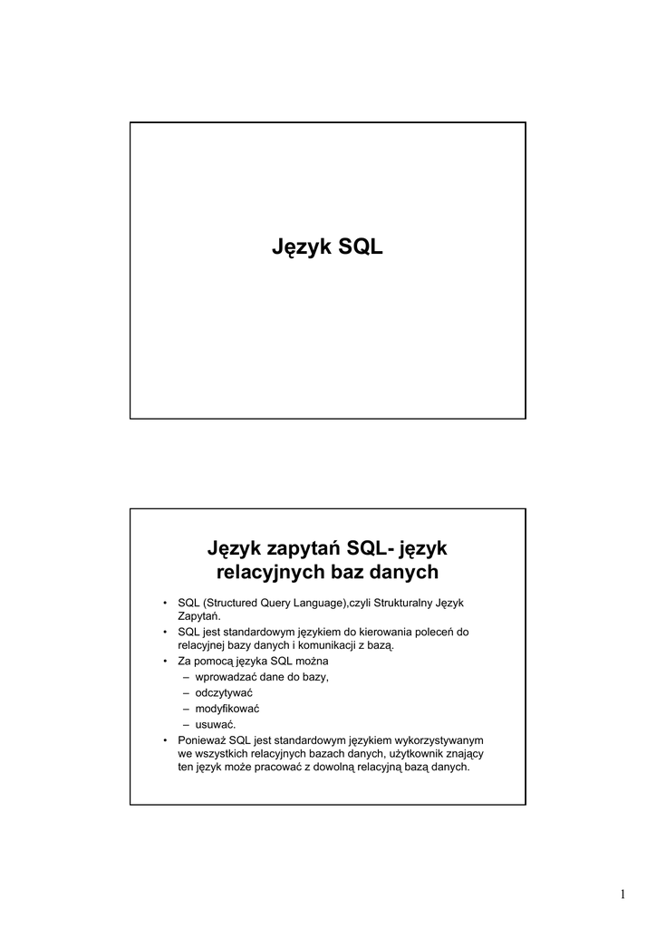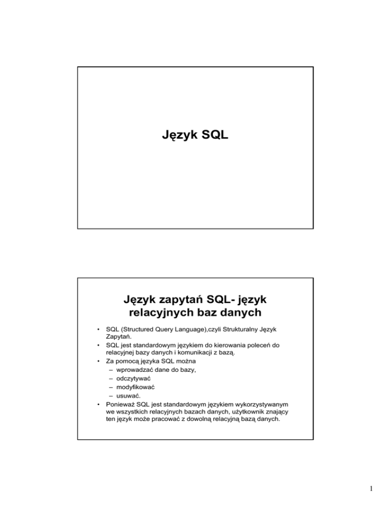 Język SQL Język zapytań SQL- język relacyjnych baz danych • SQL (Structured Query Language),czyli Strukturalny Język Zapytań. • SQL jest standardowym językiem do kierowania poleceń do relacyjnej bazy danych i komunikacji z bazą. • Za pomocą języka SQL można – wprowadzać dane do bazy, – odczytywać – modyfikować – usuwać. • Ponieważ SQL jest standardowym językiem wykorzystywanym we wszystkich relacyjnych bazach danych, użytkownik znający ten język może pracować z dowolną relacyjną bazą danych. 1 Język zapytań SQL- język relacyjnych baz danych • Wariacje SQL w zależności od producenta bazy danych Oracle, IBM, Sybase, Microsoft, mySQL • PDQ (Parallel Data Query), czyli SQL na wiele procesorów Relacyjne bazy danych standardy SQL • Stworzono standardowy język zapytań (SQL), służący do operowania danymi w bazach relacyjnych. • Standardy dotyczące relacyjnych baz danych są dobrze zdefiniowane przez takie organizacje, jak Międzynarodowa Organizacja Normalizacyjna (ISO) i Narodowy Amerykański Instytut Standaryzacyjny (ang. American National Standards Institute - ANSI). • • • • SQL SQL SQL SQL - 89 - 92 - SQL 2 - 92 - rozszerzony o ODBC w 1995 roku - 99 - SQL 3 wzbogacony o rozszerzenia obiektowe 2 Język definicji i manipulacji danymi • Język SQL składa się z trzech języków podrzędnych, pozwalających wykonywać praktycznie dowolne operacje w relacyjnej bazie danych • Do projektowania, definiowania logicznej struktury danych używany jest język definicji danych (ang. DDL - Data Definition Language). – do tworzenia tabel, usuwania ich, – definiowania perspektyw, – indeksów, – ograniczeń itd • Do modyfikowania danych w systemu służy język manipulacji danymi (ang. DML - Data Manipulation Language). • Język zapytań o dane (odczytywać dane) (ang. DQL - Data Query Language) Informacje o widokach w słowniku Oracle • Możemy uzyskać listę tabel w słowniku Oracle stosując zapytanie do następującego widoku. SELECT * FROM dictionary ORDER BY table_name; 3 Tworzenie tabeli poprzez polecenia CREATE TABLE CREATE TABLE user.STUDENT ( ID_STUDENT INTEGER NOT NULL, IMIE VARCHAR2(25) NOT NULL, NAZWISKO VARCHAR2(30) NOT NULL, PESEL INTEGER NOT NULL, ADRES_E_MAIL VARCHAR2(100), CONSTRAINT PK_STUDENT PRIMARY KEY (ID_STUDENT )) Stawianie komentarzy do tabeli COMMENT ON COLUMN user.STUDENT.ID_STUDENT IS 'IDENTYFIKATOR STUDENTA'; COMMENT ON COLUMN user.STUDENT.IMIE IS 'IMIE STUDENTA'; COMMENT ON COLUMN user.STUDENT.NAZWISKO IS 'NAZWISKO STUDENTA'; COMMENT ON COLUMN user.STUDENT.PESEL IS 'NUMER PESELU'; COMMENT ON COLUMN user.STUDENT.ADRES_E_MAIL IS 'ADRES E_MAIL STUDENTA'; 4 Sposoby wprowadzania danych do bazy danych Oracle - - Wprowadzić za pomocą formularza (Oracle Forms) Pobrać dane z innej bazy Oracle poprzez db_link Wprowadzić za pomocą narzędzi typu TOAD Wprowadzić z pliku tekstowego używając opcję External Tables Wprowadzić z Arkusza Kalkulacyjnego za pomocą HTML_DB Wprowadzić za pomocą ODBC (Open Data Base Connection) na przykład dane przechowywane w Ms Acces lub bazę danych Open Office, DB2, SQL Server, mySQL Wprowadzić za pomocą HTML_DB Wprowadzić dane z pliku eksportowego używając narzędzi IMPORT Wprowadzić dane z pliku używając narzędzi LOADER Wprowadzić dane z użyciem narzędzi Oracle DATA POMP Wprowadzić dane z użyciem funkcji TABLE FUNCTION (PL/SQL) Wprowadzić bezpośrednio do tabeli z użyciem instrukcji INSERT Instrukcja INSERT • Instrukcja INSERT jest bardzo prosta. INSERT INTO table_name[(field_names)] VALUES(field_values); • gdzie (field_names) parametr nie jest obowiązkowy ale jest bardzo ważny, pomocny, należy go używać w celu czytelności kodu. INSERT INTO table_name VALUES (list_of_values); 5 Instrukcja INSERT • Tabela do której chcemy wprowadzać, dodawać dane musi istnieć! • Jeżeli tabela nie istnieje Oracle wyświeli nam „błąd”: ORA-00942: tabela lub perspektywa nie istnieje • W takiej sytuacji należy najpierw utworzyć tabelę i następne wprowadzić dane. Wprowadzanie danych do tabeli za pomocą INSERT INSERT INTO user.STUDENT (ID_STUDENT, IMIE, NAZWISKO, PESEL, ADRES_E_MAIL) VALUES (1, 'PIOTR', 'ILCZEW', 62092211111, '[email protected]'); INSERT INTO user.STUDENT (ID_STUDENT, IMIE, NAZWISKO, PESEL, ADRES_E_MAIL) VALUES (2, 'ADAM', 'GALEWSKI', 710209211111, '[email protected]'); select * from user.STUDENT; 6 Tworzenie tabeli poprzez polecenia CREATE TABLE CREATE TABLE user.PIOSENKI (WYKONAWCA_ID INTEGER NOT NULL, PIOSENKA VARCHAR2(100), CONSTRAINT PK_PIOSENKI PRIMARY KEY (WYKONAWCA_ID )); COMMENT ON COLUMN user.PIOSENKI.WYKONAWCA_ID IS 'IDENTYFIKATOR WYKONAWCY’; COMMENT ON COLUMN user.PIOSENKI.PIOSENKA IS 'TYTUL PIOSENKI’; Tworzenie tabeli poprzez polecenia CREATE TABLE CREATE TABLE user.WYKONAWCA ( WYKOANWCA_ID INTEGER NOT NULL, IMIE_NAZWISKO VARCHAR2(80), CONSTRAINT PK_WYKONAWCA PRIMARY KEY (WYKOANWCA_ID )); COMMENT ON COLUMN user.WYKONAWCA.WYKOANWCA_ID IS 'IDENTYFIKATOR WYKONAWCY’; COMMENT ON COLUMN user.WYKONAWCA.IMIE_NAZWISKO IS 'IMIE i NAZWISKO WYKONAWCY’; 7 Zmiana nazwy kolumn po utworzeniu tabeli Jeżeli po utworzeniu tabeli chcemy zmienić nazwy kolumn możemy usunąć tabelę i ponownie ją utworzyć. W celu nie utracenia wprowadzonych do tabeli danych należy użyć tymczasowej tabeli. Druga metoda jest użycie polecenia ALTER TABLE RENAME COLUMN ALTER TABLE PIL.WYKONAWCA RENAME COLUMN WYKOANWCA_ID to WYKONAWCA_ID Usuwanie klucza z kolumny tabeli ALTER TABLE user.PIOSENKI DROP (WYKONAWCA_ID); ALTER TABLE user.PIOSENKI ADD WYKONAWCA_ID INTEGER NOT NULL; ORA-01758: aby dodać obowiązkową kolumnę (NOT NULL) tabela musi być pusta DELETE from user.PIOSENKI; 8 Wprowadzanie danych do tabeli za pomocą INSERT INSERT INTO PIOSENKI ('LATO',1); ORA-00928:brak słowa kluczowego SELECT Brakuje słowa kluczowego VALUES INSERT INTO PIOSENKI VALUES('LATO',1); ORA-01722 niepoprawna liczba To oznacza, że dane, które wpr