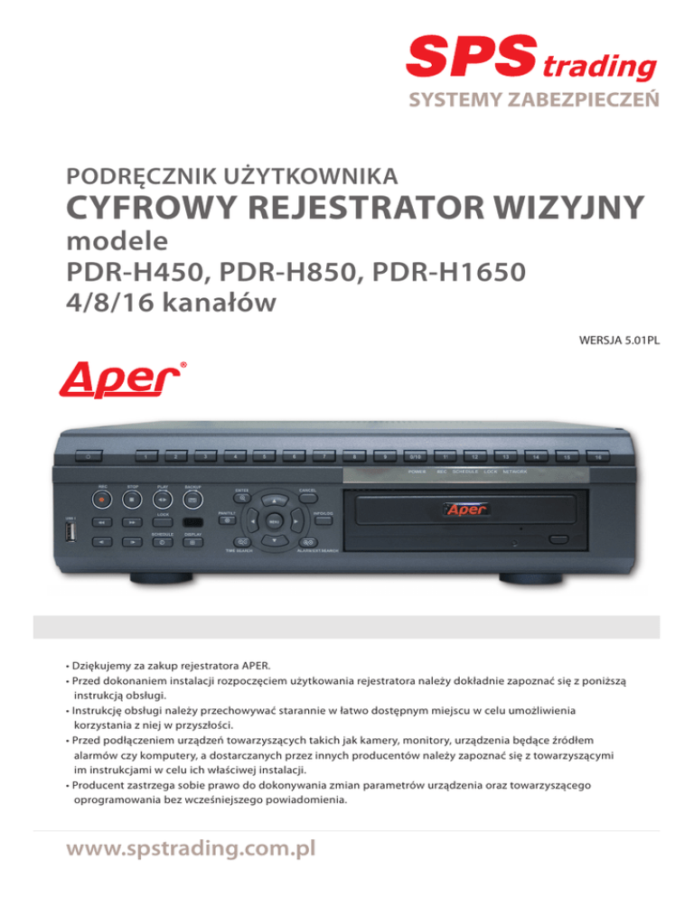 SYSTEMY ZABEZPIECZEŃ PODRĘCZNIK UŻYTKOWNIKA CYFROWY REJESTRATOR WIZYJNY modele PDR-H450, PDR-H850, PDR-H1650 4/8/16 kanałów WERSJA 5.01PL • Dziękujemy za zakup rejestratora APER. • Przed dokonaniem instalacji rozpoczęciem użytkowania rejestratora należy dokładnie zapoznać się z poniższą instrukcją obsługi. • Instrukcję obsługi należy przechowywać starannie w łatwo dostępnym miejscu w celu umożliwienia korzystania z niej w przyszłości. • Przed podłączeniem urządzeń towarzyszących takich jak kamery, monitory, urządzenia będące źródłem alarmów czy komputery, a dostarczanych przez innych producentów należy zapoznać się z towarzyszącymi im instrukcjami w celu ich właściwej instalacji. • Producent zastrzega sobie prawo do dokonywania zmian parametrów urządzenia oraz towarzyszącego oprogramowania bez wcześniejszego powiadomienia. www.spstrading.com.pl ŚRODKI OSTROŻNOŚCI UWAGA RYZYKO PORAŻENIA PRĄDEM NIE OTWIERAĆ OBUDOWY UWAGA: W CELU OGRANICZENIA RYZYKA PORAŻENIA PRĄDEM NIE NALEŻY OTWIERAĆ OBUDOWY. WEWNĄTRZ UMIESZCZONE SĄ SPECJALIZOWANE OBWODY ELEKTRONICZNE. NAPRAWY MOGĄ BYĆ DOKONYWAĆ WYŁĄCZNIE PRZEZ WYKWALIFIKOWANY PERSONEL. Znak błyskawicy umieszczony w trójkącie ma na celu ostrzeżenie użytkownika o obecności wewnątrz obudowy nieizolowanych źródeł napięcia, które mogą stanowić zagrożenie porażenia prądem elektrycznym dla człowieka. Znak wykrzyknika umieszczony w trójkącie ma na celu zwrócenie uwagi użytkownika na konieczność zachowania właściwej ostrożności podczas obsługi, konserwacji i serwisowania urządzenia zgodnie z towarzyszącą mu instrukcją i dokumentacją. Utylizacja zużytego sprzętu przez użytkowników domowych w Unii Europejskiej Symbol ten umieszczony na produkcie lub opakowaniu oznacza, że tego produktu nie należy wyrzucać razem z innymi odpadami domowymi. Użytkownik jest odpowiedzialny za dostarczenie zużytego sprzętu do wyznaczonego punktu gromadzenia zużytych urządzeń elektrycznych i elektronicznych. Gromadzenie osobno i recykling tego typu odpadów przyczynia się do ochrony zasobów naturalnych i jest bezpieczny dla zdrowia i środowiska naturalnego. Dalsze informacje na temat sposobu utylizacji zużytych urządzeń można uzyskać u odpowiednich władz lokalnych, w przedsiębiorstwie zajmującym się usuwaniem odpadów lub w miejscu zakupu produktu. 2 CYFROWY REJESTRATOR WIZYJNY OSTRZEŻENIE: W CELU PRZECIWDZIAŁANIA PRZYPADKOM POWSTANIA POŻARU ORAZ PORAŻENIA PRĄDEM ELEKTRYCZNYM NALEŻY CHRONIĆ URZĄDZENIE PRZED BEZPOŚREDNIM ODDZIAŁYWANIEM DESZCZU I WILGOCI. Spis treści ■ ŚRODKI OSTROŻNOŚCI ……………………………………………………………………………… 2 ……………………………………………………………………………………………… 3 ■ Środki bezpieczeństwa ………………………………………………………………………………… 5 ■ Obsługa ………………………………………………………………………………………………… 7 1. Panel przedni ……………………………………………………………………………………… 7 ……………………………………………………………………………………… 9 ■ Spis treści 2. Panel tylny 3. Pilot zdalnego sterowania ■ Instalacja i podłączenia ……………………………………………………………………… ……………………………………………………………………………… 11 12 a) Kamera, monitor, mikrofon, czujniki alarmowe i przewód zasilający b) Wejścia i wyjścia alarmowe c) Podłączenie zewnętrznych urządzeń archiwizacyjnych d) Podłączenie kamer obrotowych e) Wymagania systemu PC dla przyłączenia sieci ■ Eksploatacja 1. Ustawienia czasu i daty ……………………………………………………………………… 15 2. Ustawienia pozycji ekranu 3. Podgląd bieżący ………………………………………………………………… 16 ……………………………………………………………………………… 16 1) Przełączanie trybu wyświetlania 2) Ustawienia nazw kamer 3) Automatyczna sekwencja (szybkość sekwencji przełączania kamer) 4) Wybór protokołu sterowania kamerą obrotową 5) Ustawienia jasności, kontrastu i nasycenia barw 6) Tryb maskowania 4. Zapis podstawowy 5. Zapis alarmowy ……………………………………………………………………… 25 …………………………………………………………………………… 30 …………………………………… 33 6. Zapis wywoływany detekcją aktywności w obrazie 7. Zapis programowany czasowo …………………………………………………………… 8. Odtwarzanie ………………………………………………………………………………… 38 3 36 CYFROWY REJESTRATOR WIZYJNY 1) Podstawowy tryb odtwarzania 2) Odtwarzanie wstecz 3) Odtwarzanie klatka po klatce 4) Ustawianie szybkości odtwarzania 5) Odtwarzanie dźwięku 9. Wyszukiwanie daty i czasu …………………………………………………………………… 41 10. Wyszukiwanie zdarzeń alarmowych ………………………………………………………… 43 11. Ustawienia systemowe ……………………………………………………………………… 44 12. Ustawienia sieci ……………………………………………………………………………… 49 13. Informacje systemowe i lista logowania …………………………………………………… 53 14. Powiększanie kadru ……………………………………………………………………… 54 ………………………………………………… 55 15. Sterowanie ruchem kamer obrotowych 16. Obsługa urządzeń archiwizujących ■ Podłączen