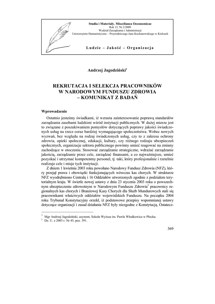 Studia i Materiały. Miscellanea Oeconomicae Rok 13, Nr 2/2009 Wydział Zarządzania i Administracji Uniwersytetu Humanistyczno – Przyrodniczego Jana Kochanowskiego w Kielcach Ludzie – Jakość – Organizacja Andrzej Jagodziński1 REKRUTACJA I SELEKCJA PRACOWNIKÓW W NARODOWYM FUNDUSZU ZDROWIA – KOMUNIKAT Z BADAŃ Wprowadzenie Ostatnio jesteśmy świadkami, iŜ wzrasta zainteresowanie poprawą standardów zarządzania zasobami ludzkimi wśród instytucji publicznych. W duŜej mierze jest to związane z poszukiwaniem pomysłów dotyczących poprawy jakości świadczonych usług na rzecz coraz bardziej wymagającego społeczeństwa. Wobec nowych wyzwań, bez względu na rodzaj świadczonych usług, czy to z zakresu ochrony zdrowia, opieki społecznej, edukacji, kultury, czy róŜnego rodzaju ubezpieczeń społecznych, organizacje sektora publicznego powinny umieć reagować na zmiany zachodzące w otoczeniu. Stosować zarządzanie strategiczne, wdraŜać zarządzanie jakością, zarządzanie przez cele, zarządzać finansami, a co najwaŜniejsze, umieć pozyskać i utrzymać kompetentny personel, tj. taki, który profesjonalnie i rzetelnie realizuje cele i misje tych instytucji. Z dniem 1 kwietnia 2003 roku powołano Narodowy Fundusz Zdrowia (NFZ), który przejął prawa i obowiązki funkcjonujących wówczas kas chorych. W strukturze NFZ wyodrębniono Centralę i 16 Oddziałów utworzonych zgodnie z podziałem terytorialnym kraju. W świetle nowej ustawy z dnia 23 stycznia 2003 roku o powszechnym ubezpieczeniu zdrowotnym w Narodowym Funduszu Zdrowia2 pracownicy regionalnych kas chorych i BranŜowej Kasy Chorych dla SłuŜb Mundurowych stali się pracownikami właściwych oddziałów wojewódzkich Funduszu. Na początku 2004 roku Trybunał Konstytucyjny orzekł, iŜ podstawowe przepisy wspomnianej ustawy dotyczące organizacji i zasad działania NFZ były niezgodne z Konstytucją. Ostatecz1 2 Mgr Andrzej Jagodziński, asystent, Szkoła WyŜsza im. Pawła Włodkowica w Płocku. Dz. U. z 2003 r. Nr 45, poz. 391. 369 nie nowe uregulowania znalazły się w ustawie z dnia 27 sierpnia 2004 roku o świadczeniach opieki zdrowotnej finansowanych ze środków publicznych3. ZałoŜenia i metoda badań Niniejszy artykuł jest fragmentem badań przeprowadzonych przez autora w instytucjach ubezpieczenia zdrowotnego, tj. w kasach chorych i w NFZ w latach 1999–2009, w ramach pisania rozprawy doktorskiej pn. Zmiany zarządzania zasobami ludzkimi w instytucjach ubezpieczenia zdrowotnego. Głównym celem rozprawy jest identyfikacja zarządzania zasobami ludzkimi w podmiotach ubezpieczenia zdrowotnego, tj. w kasach chorych i w NFZ w ujęciu funkcjonalnym, instytucjonalnym i instrumentalnym oraz wskazanie najwaŜniejszych zmian w tym zakresie. Prezentowana praca dotyczy rekrutacji i selekcji pracowników do NFZ i określenia zmian w tym obszarze w porównaniu z kasami chorych. Na koniec zostaną sformułowane wnioski i rekomendacje, które mogą być wykorzystane do doskonalenia procedur i procesów zarządzania ludźmi w organizacjach publicznych. Do zebrania materiałów empirycznych zastosowano metodę ankietową. Za pośrednictwem Szefa komórki personalnej Centrali NFZ kwestionariusz ankiety został skierowany drogą elektroniczną do poszczególnych oddziałów Funduszu. Dla potrzeb tej pracy przyjęto, iŜ proces rekrutacji i selekcji pracowników polega na poszukiwaniu i przyciąganiu w określonym czasie i miejscu niezbędnej liczby osób o odpowiednich kwalifikacjach oraz przyporządkowanie ich do poszczególnych komórek organizacyjnych i stanowisk pracy4. Omówienie wyników badań Rodzaj stosowanych metod i techniki rekrutacji pracowników w jednostkach organizacyjnych NFZ prezentuje tabela 1. Wskazane osoby mogły dokonać wyboru dowolnej ich liczby, tak jak w przypadku badań prowadzonych w kasach chorych. Na podstawie zebranych informacji – w porównaniu z kasami chorych – zwiększyła się liczba rekrutacji: zarówno wewnętrznej, w stosunku do kierownictwa liniowego i zewnętrznej, w stosunku do pozyskania osób z konkretnego segmentu rynku pracy, posiadających określone umiejętności i kwalifikacje z dziedziny medycznej. W pierwszym przypadku jest to zjawisko prawidłowe. Pracownicy po kilku latach wspólnej pracy dobrze się znają, potrafią sprecyzować swoje plany i moŜliwości zawodowe. Dlatego jako sprawdzeni pracownicy otrzymują coraz bardziej odpowiedzialne i samodzielne stanowiska pracy, awansując na głównych specjalistów, tzn. na stanowiska o charakterze opiniodawczym, doradczym, koordynacyjnym lub kierowników operacyjnych. Jednak w przypadku jednostek organizacyjnych Funduszu, które nie posiadają sformalizowanych analiz wewnętrznego rynku pracy czy opisu stanowisk, taka metoda rekrutacji moŜe równieŜ ograniczyć obiektywny wybór kandydata, szczególnie na stanowisko kierownicze. 3 4 Dz. U. z 2004 r. Nr 210, poz. 2135. Por. W.L. French, Human Resources Management, Boston, Houghton Mifflin Company 1994, s. 10. 370 Tabela1. Metody i techniki rekrutacji pracowników stosowane w NFZ. Metoda / technika rekrutacji Pracownicy fizyczni Pracownicy administracyjno – biurowi Kierownicy niŜszego szczebla Pracownicy z wykształceniem medycznym Kierownicy wyŜszego szczebla Liczba podmiotów NFZ stosujących daną technikę / metodę Własne bazy danych Osoby polecane przez pracowników Ogłoszenia w prasie Rekrutacja wewnętrzna Akcje „otwarte drzwi” Targi pracy Internet Kontakty ze szkołami 0 2 2 1 0 2 3 2 5 0 0 0 0 0 2 0 6 10 0 2 5 4 6 12 0 1 5 2 12 5 0 7 5 2 4 6 0 0 3 0 Źródło: opracowanie własne na podstawie badań ankietowych. Natomiast poszukiwanie specjalistów medycznych w drodze ogłoszeń prasowych i targów pracy, wynika przede wszystkim z faktu, iŜ są to w tej chwili zawody „wysoko” deficytowe, charakteryzujące się stosunkowo rzadkimi predyspozycjami zawodowymi. Zatrudnienie pracowników medycznych w instytucjach ubezpieczenia zdrowo