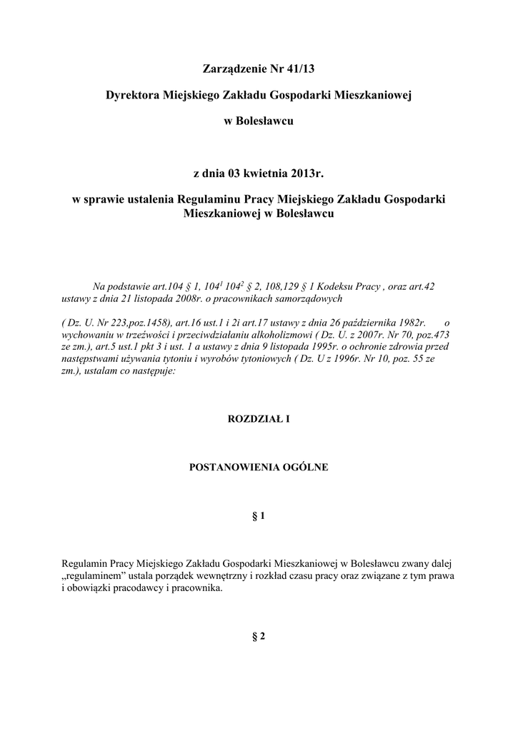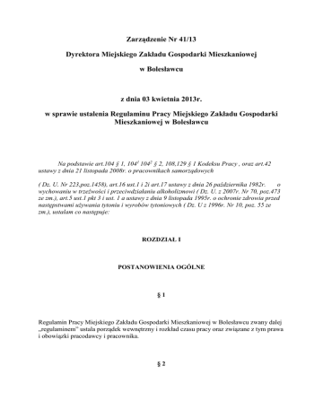 Zarządzenie Nr 41/13 Dyrektora Miejskiego Zakładu Gospodarki Mieszkaniowej w Bolesławcu z dnia 03 kwietnia 2013r. w sprawie ustalenia Regulaminu Pracy Miejskiego Zakładu Gospodarki Mieszkaniowej w Bolesławcu Na podstawie art.104 § 1, 1041 1042 § 2, 108,129 § 1 Kodeksu Pracy , oraz art.42 ustawy z dnia 21 listopada 2008r. o pracownikach samorządowych ( Dz. U. Nr 223,poz.1458), art.16 ust.1 i 2i art.17 ustawy z dnia 26 października 1982r. o wychowaniu w trzeźwości i przeciwdziałaniu alkoholizmowi ( Dz. U. z 2007r. Nr 70, poz.473 ze zm.), art.5 ust.1 pkt 3 i ust. 1 a ustawy z dnia 9 listopada 1995r. o ochronie zdrowia przed następstwami używania tytoniu i wyrobów tytoniowych ( Dz. U z 1996r. Nr 10, poz. 55 ze zm.), ustalam co następuje: ROZDZIAŁ I POSTANOWIENIA OGÓLNE §1 Regulamin Pracy Miejskiego Zakładu Gospodarki Mieszkaniowej w Bolesławcu zwany dalej „regulaminem” ustala porządek wewnętrzny i rozkład czasu pracy oraz związane z tym prawa i obowiązki pracodawcy i pracownika. §2 Regulamin obowiązuje wszystkich pracowników Miejskiego Zakładu Gospodarki Mieszkaniowej w Bolesławcu bez względu na formę nawiązania stosunku pracy, zajmowane stanowisko, system , rozkład i wymiar czasu pracy. §3 Ilekroć w regulaminie jest mowa o : 1. 1)bezpośrednim przełożonym – oznacza to, pracownika zatrudnionego na stanowisku związanym z kierowaniem zespołem , któremu pracownik bezpośrednio podlega, 1. 2)kierowniku – oznacza to, kierownika działu w rozumieniu Regulaminu Organizacyjnego Miejskiego Zakładu Gospodarki Mieszkaniowej w Bolesławcu, 1. 3)komórkach organizacyjnych MZGM – oznacza dział i samodzielne stanowiska MZGM ; Dział Eksploatacyjny ( TE), Dział Lokalowy (DL), Dział Gospodarki Komunalnej (DGK), Dział Gospodarki Odpadami (DGO), Dział Finansowo-Czynszowy ( FC), Dział Organizacyjny ( DP) , Główna Księgowa ( DF), Zastępca Dyrektora ( DZ). 1. 4)pracodawcy – oznacza to, Miejski Zakład Gospodarki Mieszkaniowej w Bolesławcu , jako podmiot zatrudniający pracowników , reprezentowany przez Dyrektora Miejskiego Zakładu Gospodarki Mieszkaniowej w Bolesławcu lub upoważnioną przez niego osobę, 1. 5)pracowniku na stanowisku urzędniczym – oznacza to, osobę zatrudnioną w zakładzie na stanowisku urzędniczym, w tym kierowniczym urzęw rozumieniu rozporządzenia Rady Ministrów z dnia 18 marca 2009r. w sprawie wynagradzania pracowników samorządowych ( Dz. U. Nr 50,poz.398), 1. 6)przepisach bez bliższego określenia – oznacza to przepisy prawa pracy, 1. 7)przepisach wewnętrznych – oznacza to Regulamin Organizacyjny Miejskiego Zakładu Gospodarki Mieszkaniowej w Bolesławcu oraz inne zarządzenia Dyrektora MZGM, 1. 8)regulaminie – oznacza to regulamin pracy Miejskiego Zakładu Gospodarki Mieszkaniowej w Bolesławcu, 1. 9)zakładzie – oznacza to Miejski Zakład Gospodarki Mieszkaniowej w Bolesławcu, 1. 10)ustawie – oznacza to ustawę z dnia 21 listopada 2008r. o pracownikach samorządowych ( Dz. U. Nr 223, poz.1458), 1. 11)kodeksie pracy – oznacza to ustawę z dnia 26 czerwca 1974r. Kodeks Pracy (Dz. U. Nr 21,poz.94 ze zm.). ROZDZIAŁ 2 OBOWIĄZKI PRACODAWCY §4 1. Pracodawca jest obowiązany zapewnić pracownikom właściwe warunki do wykonywania obowiązków służbowych , a w szczególności: 1. 1)zapewnić bezpieczne i higieniczne warunki pracy oraz prowadzić systematycznie szkolenie pracowników w zakresie bezpieczeństwa i higieny pracy, 2. 2)terminowo i prawidłowo wypłacać wynagrodzenie, 3. 3)ułatwić pracownikom podnoszenie kwalifikacji zawodowych, 4. 4)zaspokoić w miarę posiadanych środków , socjalne potrzeby pracowników, 5. 5)stosować obiektywne i sprawiedliwe kryteria oceny pracownikóoraz wyników ich pracy, 6. 6)przeciwdziałać dyskryminacji w zatrudnieniu, w szczególności ze wzglęna płeć, wiek , niepełnosprawność , religię , narodowość, przekonania polityczne przynależność związkową , pochodzenie etniczne, wyznanie, orientację seksualną i udostępnić pracownikom tekst przepisów dotyczących równego traktowania w zatrudnieniu , 7. 7)przeciwdziałać mobbingowi , (art.94 3 § 2 k.p.), 8. 8)prowadzić dokumentację w sprawach związanych ze stosunkiemoraz akta osobowe pracowników, 9. 9)zapewnić pracownikom odzież i obuwie robocze, środki ochrony indywidualnej oraz środki higieny osobistej, zgodnie z przepisami wewnętrznymi. 2. Szczegółowe zasady i warunki udzielania świadczeń socjalnych regulują odrębne przepisy wewnętrzne. §5 1. Pracodawca powinien zawrzeć z pracownikiem umowę o pracę na piśmie, wskazując jej rodzaj oraz warunki. 2. Postanowienia ust.1 stosuje się odpowiednio do innych dokumentów, na podstawie których pracownicy świadczą pracę. 3. Umowę o pracę lub dokument o którym mowa w ust.2 należy wręczyć pracownikowi najpóźniej w dniu rozpoczęcia pracy przez pracownika. §6 Pracodawca informuje pracownika na piśmie, nie później niż w ciągu 7 dni od dnia zawarcia umowy o pracę : 1. 2. 3. 4. 5. 1)obowiązującej pracownika dobowej i tygodniowej normie czasu pracy, 2)częstotliwości wypłat wynagrodzenia za prace, 3)wymiarze przysługującego pracownikowi urlopu wypoczynkowego, 4)obowiązującej pracownika długości okresu wypowiedzenia umowy o pracę, 5)regulaminie wynagradzania. §7 Kierownicy działów i samodzielne stanowiska realizują obowiązki pracodawcy w zakresie prawidłowej organizacji pracy w kierowanych przez nich komórkach organizacyjnych zakładu, a w szczególności obowiązani są : 1. 1)ustalić zakres obowiązków i uprawnień pracownika i podać je do wiadomości zainteresowanego, 2. 2)zaznajomić pracownika ze sposobem wykonywania pracy na wyznaczonym stanowisku, 3. 3)organizować pracę w sposób zapewniający pełne wykorzystanie czasu pracy , 4. 4)organizować pracę w sposób zapewniający zmniejszenie jej uciążliwości. ROZDZIAŁ 3 OBOWIĄZKI PRACOWNIKÓW §8 Do podstawowych obowiązków pracownika n