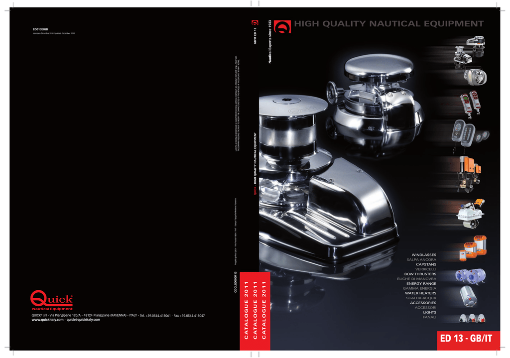 QUICK® srl - Via Piangipane 120/A - 48124 Piangipane (RAVENNA) - ITALY - Tel. +39.0544.415061 - Fax +39.0544.415047 www.quickitaly.com - [email protected] C ATA L O G U E 2 0 1 1 ® Progetto grafico Quick - Foto Fausto Fabbri / Forli’ - Stampa Tipografia Moderna / Ravenna QUICK - HIGH QUALITY NAUTICAL EQUIPMENT GB/IT ED 13 Nautical Experts since 1983 LA DITTA SI RISERVA DI MODIFICARE LE CARATTERISTICHE DEGLI ARTICOLI CONTENUTI NEL PRESENTE DEPLIANT SENZA PREAVVISO. THE COMPANY RESERVES THE RIGHT TO MODIFY THE CHARACTERISTICS OF THE ARTICLES IN THIS DEPLIANT WITHOUT NOTICE. stampato Dicembre 2010 / printed December 2010 C ATA L O G U E 2 0 1 1 C ATA L O G U E 2 0 1 1 CDCLG0000R13 ED013bIGB WINDLASSES SALPA ANCORA CAPSTANS VERRICELLI BOW THRUSTERS ELICHE DI MANOVRA ENERGY RANGE GAMMA ENERGIA WATER HEATERS SCALDA ACQUA ACCESSORIES ACCESSORI LIGHTS FANALI ED 13 - GB/IT High Quality Quick® s.r.l. è portata alla ribalta nel settore nautico da Michele Marzucco e Alfonso Peduto nel 1992. Già fondatori della società PM, Marzucco e Peduto iniziano la loro collaborazione nel 1983, con la vendita e l’installazione di accessori e strumenti nautici. Da questa esperienza nasce l’idea di progettare e costruire una propria gamma di prodotti che si concretizza con l’acquisizione di Quick® 17 anni fa. Oggi l’azienda italiana vanta una varietà di articoli difficilmente paragonabile ad altre ditte del settore ed è garanzia di qualità e professionalità sia sul territorio nazionale che negli oltre 50 paesi del mondo nei quali distribuisce. Quick® s.r.l. successfully enters the nautical sector thanks to Michele Marzucco and Alfonso Peduto in 1992. Already founders of the company PM, Marzucco and Peduto started their collaboration in 1983 selling and installing nautical instruments and accessories. It is from this experience that the idea of designing and building their own range of products originated and, with the acquisition of Quick ® 17 years ago, became real. Today the company distinguishes itself in the sector for a wide variety of items, and it is a guarantee of quality and professionalism both in Italy and in the over 50 countries in the world where it QUICK® srl - Via Piangipane 120/A - 48124 Piangipane (RAVENNA) - ITALY - Tel. +39.0544.415061 - Fax +39.0544.415047 www.quickitaly.com - [email protected] C ATA L O G U E 2 0 1 1 ® Progetto grafico Quick - Foto Fausto Fabbri / Forli’ - Stampa Tipografia Moderna / Ravenna QUICK - HIGH QUALITY NAUTICAL EQUIPMENT GB/IT ED 13 Nautical Experts since 1983 LA DITTA SI RISERVA DI MODIFICARE LE CARATTERISTICHE DEGLI ARTICOLI CONTENUTI NEL PRESENTE DEPLIANT SENZA PREAVVISO. THE COMPANY RESERVES THE RIGHT TO MODIFY THE CHARACTERISTICS OF THE ARTICLES IN THIS DEPLIANT WITHOUT NOTICE. stampato Dicembre 2010 / printed December 2010 C ATA L O G U E 2 0 1 1 C ATA L O G U E 2 0 1 1 CDCLG0000R13 ED013bIGB WINDLASSES SALPA ANCORA CAPSTANS VERRICELLI BOW THRUSTERS ELICHE DI MANOVRA ENERGY RANGE GAMMA ENERGIA WATER HEATERS SCALDA ACQUA ACCESSORIES ACCESSORI LIGHTS FANALI ED 13 - GB/IT Nautical Equipment Le principali linee della gamma Quick® sono oggi rappresentate da salpa ancora, bow thruster, boiler, carica batterie, comandi remoti, accessori elettrici e luci da interni ed esterni con la nuova divisione Quick Marine Lighting. Lo stabilimento, con sede a Ravenna, è distribuito su una superficie di 12.000 m2 e comprende 7 reparti di produzione, 3 laboratori di ricerca e progettazione, le sale di collaudo e prova dei prodotti e naturalmente i diversi uffici che costituiscono la direzione, l’organizzazione commerciale, gli acquisti ed il settore logistica. Nautical Experts since 1983 Today, the main lines of Quick® range are as follows: windlasses, bow thrusters, water heaters, battery chargers, remote controls, electrical accessories and lights for internal and external applications with the new division Quick Marine Lighting. The plant, located in Ravenna, occupies an area of 12,000 m2 and includes 7 production departments, 3 research and development laboratories, product test benches and of course the offices including management, commercial department, purchasing and logistics. Qualità in continua evoluzione Quality in constant evolution L'innovazione, la ricerca ed il continuo sviluppo delle tecnologie sono i principali punti di forza dell'azienda Quick®. Gli obiettivi sono diretti a soddisfare le diverse esigenze del settore nautico mondiale con prodotti di qualità e sempre più competitivi. Gli uffici di progettazione, impegnati costantemente ad ottenere i migliori risultati, si avvalgono di software e apparecchiature all'avanguardia che permettono di sviluppare progetti complessi e di realizzarne rapidamente i prototipi preliminari. I diversi laboratori dove si effettuano rigorose prove e test di valutazione, sono attrezzati con strumentazioni avanzate per ottenere il reale rendimento del prodotto ed offrire la massima garanzia dei dati dichiarati. Il servizio di assistenza clienti, qualificato ed efficiente, è parte fondamentale dell'organizzazione dell'azienda Quick® e contribuisce alla fidelizzazione della clientela tuttora in continua espansione. Innovation, research and constant development of technology are the main strong points of Quick®. The objectives are aimed at satisfying the different requirements of the world nautical sector with quality products that are increasingly more competitive. The design department, always striving for better results, is provided with cutting edge software and equipment allowing the development of complex projects and the creation of preliminary prototypes within short timeframes. The various laboratories, where rigorous assessment tests are carried out, are equipped with modern instrumentation in order to obtain the real performance of the product and therefore guarantee the data declared. A qualified and efficient customer service is a fundamental component in the organization of Quick® an