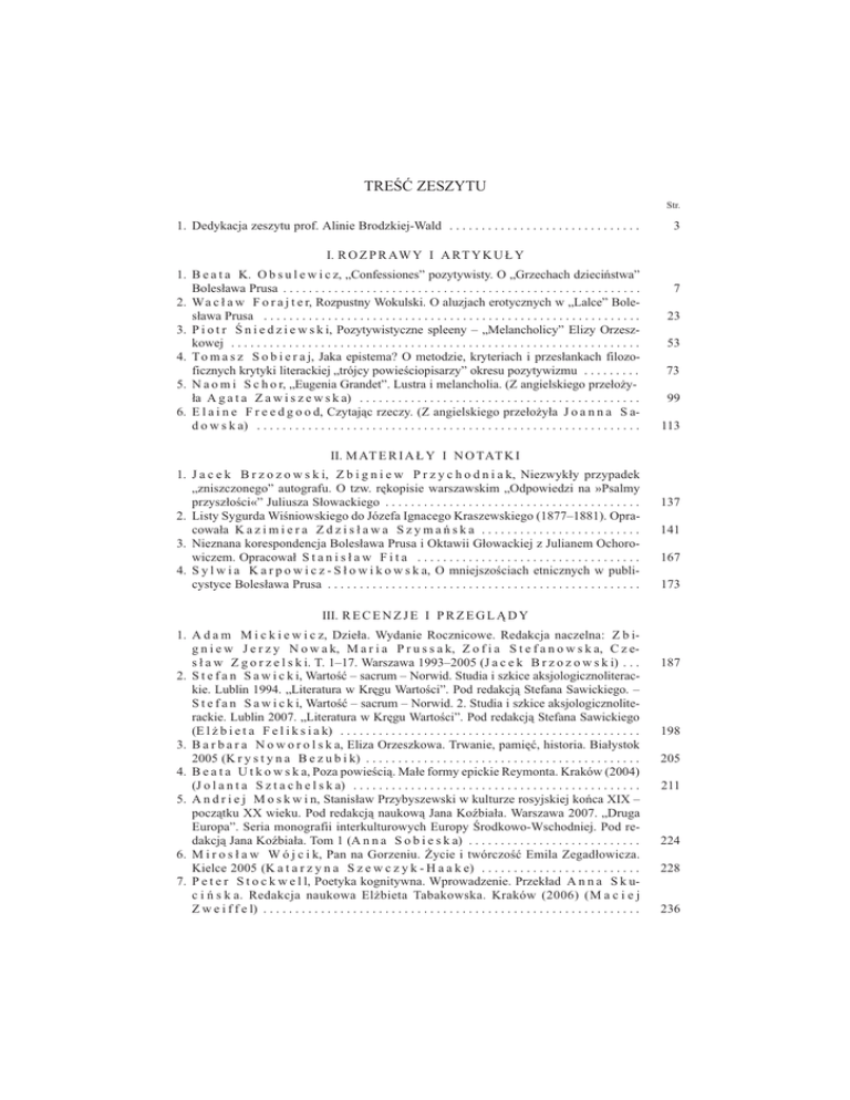5 TREÆ ZESZYTU Str. 1. Dedykacja zeszytu prof. Alinie Brodzkiej-Wald . . . . . . . . . . . . . . . . . . . . . . . . . . . . . . 3 I. R O Z P R AW Y I A RT Y K U £ Y 1. B e a t a K. O b s u l e w i c z, Confessiones pozytywisty. O Grzechach dzieciñstwa Boles³awa Prusa . . . . . . . . . . . . . . . . . . . . . . . . . . . . . . . . . . . . . . . . . . . . . . . . . . . . . . . . 2. Wa c ³ a w F o r a j t e r, Rozpustny Wokulski. O aluzjach erotycznych w Lalce Boles³awa Prusa . . . . . . . . . . . . . . . . . . . . . . . . . . . . . . . . . . . . . . . . . . . . . . . . . . . . . . . . . . . 3. P i o t r n i e d z i e w s k i, Pozytywistyczne spleeny Melancholicy Elizy Orzeszkowej . . . . . . . . . . . . . . . . . . . . . . . . . . . . . . . . . . . . . . . . . . . . . . . . . . . . . . . . . . . . . . . . 4. T o m a s z S o b i e r a j, Jaka epistema? O metodzie, kryteriach i przes³ankach filozoficznych krytyki literackiej trójcy powieciopisarzy okresu pozytywizmu . . . . . . . . . 5. N a o m i S c h o r, Eugenia Grandet. Lustra i melancholia. (Z angielskiego prze³o¿y³a A g a t a Z a w i s z e w s k a) . . . . . . . . . . . . . . . . . . . . . . . . . . . . . . . . . . . . . . . . . . . . 6. E l a i n e F r e e d g o o d, Czytaj¹c rzeczy. (Z angielskiego prze³o¿y³a J o a n n a S ad o w s k a) . . . . . . . . . . . . . . . . . . . . . . . . . . . . . . . . . . . . . . . . . . . . . . . . . . . . . . . . . . . . 7 23 53 73 99 113 II. M AT E R I A £ Y I N O TAT K I 1. J a c e k B r z o z o w s k i, Z b i g n i e w P r z y c h o d n i a k, Niezwyk³y przypadek zniszczonego autografu. O tzw. rêkopisie warszawskim Odpowiedzi na »Psalmy przysz³oci« Juliusza S³owackiego . . . . . . . . . . . . . . . . . . . . . . . . . . . . . . . . . . . . . . . . 2. Listy Sygurda Winiowskiego do Józefa Ignacego Kraszewskiego (18771881). Opracowa³a K a z i m i e r a Z d z i s ³ a w a S z y m a ñ s k a . . . . . . . . . . . . . . . . . . . . . . . . . 3. Nieznana korespondencja Boles³awa Prusa i Oktawii G³owackiej z Julianem Ochorowiczem. Opracowa³ S t a n i s ³ a w F i t a . . . . . . . . . . . . . . . . . . . . . . . . . . . . . . . . . . . 4. S y l w i a K a r p o w i c z - S ³ o w i k o w s k a, O mniejszociach etnicznych w publicystyce Boles³awa Prusa . . . . . . . . . . . . . . . . . . . . . . . . . . . . . . . . . . . . . . . . . . . . . . . . . 137 141 167 173 III. R E C E N Z J E I P R Z E G L ¥ D Y 1. A d a m M i c k i e w i c z, Dzie³a. Wydanie Rocznicowe. Redakcja naczelna: Z b ig n i e w J e r z y N o w a k, M a r i a P r u s s a k, Z o f i a S t e f a n o w s k a, C z es ³ a w Z g o r z e l s k i. T. 117. Warszawa 19932005 (J a c e k B r z o z o w s k i) . . . 2. S t e f a n S a w i c k i, Wartoæ sacrum Norwid. Studia i szkice aksjologicznoliterackie. Lublin 1994. Literatura w Krêgu Wartoci. Pod redakcj¹ Stefana Sawickiego. S t e f a n S a w i c k i, Wartoæ sacrum Norwid. 2. Studia i szkice aksjologicznoliterackie. Lublin 2007. Literatura w Krêgu Wartoci. Pod redakcj¹ Stefana Sawickiego (E l ¿ b i e t a F e l i k s i a k) . . . . . . . . . . . . . . . . . . . . . . . . . . . . . . . . . . . . . . . . . . . . . . . 3. B a r b a r a N o w o r o l s k a, Eliza Orzeszkowa. Trwanie, pamiêæ, historia. Bia³ystok 2005 (K r y s t y n a B e z u b i k) . . . . . . . . . . . . . . . . . . . . . . . . . . . . . . . . . . . . . . . . . . . 4. B e a t a U t k o w s k a, Poza powieci¹. Ma³e formy epickie Reymonta. Kraków (2004) (J o l a n t a S z t a c h e l s k a) . . . . . . . . . . . . . . . . . . . . . . . . . . . . . . . . . . . . . . . . . . . . . 5. A n d r i e j M o s k w i n, Stanis³aw Przybyszewski w kulturze rosyjskiej koñca XIX pocz¹tku XX wieku. Pod redakcj¹ naukow¹ Jana Kobia³a. Warszawa 2007. Druga Europa. Seria monografii interkulturowych Europy rodkowo-Wschodniej. Pod redakcj¹ Jana Kobia³a. Tom 1 (A n n a S o b i e s k a) . . . . . . . . . . . . . . . . . . . . . . . . . . . 6. M i r o s ³ a w W ó j c i k, Pan na Gorzeniu. ¯ycie i twórczoæ Emila Zegad³owicza. Kielce 2005 (K a t a r z y n a S z e w c z y k - H a a k e) . . . . . . . . . . . . . . . . . . . . . . . . . 7. P e t e r S t o c k w e l l, Poetyka kognitywna. Wprowadzenie. Przek³ad A n n a S k uc i ñ s k a. Redakcja naukowa El¿bieta Tabakowska. Kraków (2006) (M a c i e j Z w e i f f e l) . . . . . . . . . . . . . . . . . . . . . . . . . . . . . . . . . . . . . . . . . . . . . . . . . . . . . . . . . . . 187 198 205 211 224 228 236 6 IV. K R O N I K A Zmarli 1. Mieczys³aw Klimowicz (14 grudnia 1919 26 sierpnia 2008) (J u s t y n a £ u k as z e w i c z) . . . . . . . . . . . . . . . . . . . . . . . . . . . . . . . . . . . . . . . . . . . . . . . . . . . . . . . . . . . . 2. Eligiusz Szymanis (11 czerwca 1955 17 sierpnia 2009) (M a r i a M a k a r u k) . . . . 243 249 V. D Y S K U S J E K O R E S P O N D E N C J A 1. J a n u s z G o l i ñ s k i, List do Redakcji . . . . . . . . . . . . . . . . . . . . . . . . . . . . . . . . . . . . 253 CONTENTS OF THE FASCICLE Page 1. Dedication to Professor Alina Brodzka-Wald . . . . . . . . . . . . . . . . . . . . . . . . . . . . . . . . 3 I. T R E AT I S E S A N D A RT I C L E S 1. B e a t a K. O b s u l e w i c z, Confessions of a Positivist. On Boles³aw Pruss Sins of Childhood . . . . . . . . . . . . . . . . . . . . . . . . . . . . . . . . . . . . . . . . . . . . . . . . . . . . . . . . . 2. Wa c ³ a w F o r a j t e r, Licentious Wokulski. On the Erotic Allusions in Boles³aw Prus The Doll . . . . . . . . . . . . . . . . . . . . . . . . . . . . . . . . . . . . . . . . . . . . . . . . . . . . . . . . . . . . 3. P i o t r n i e d z i e w s k i, Positivistic Spleens Eliza Orzeszkowas Melancholy Ones . . . . . . . . . . . . . . . . . . . . . . . . . . . . . . . . . . . . . . . . . . . . . . . . . . . . . . . . . . . . . . . . 4. T o m a s z S o b i e r a j, Which Episteme? On the Method, Criteria, and Philosophical Factors of Literary Cri