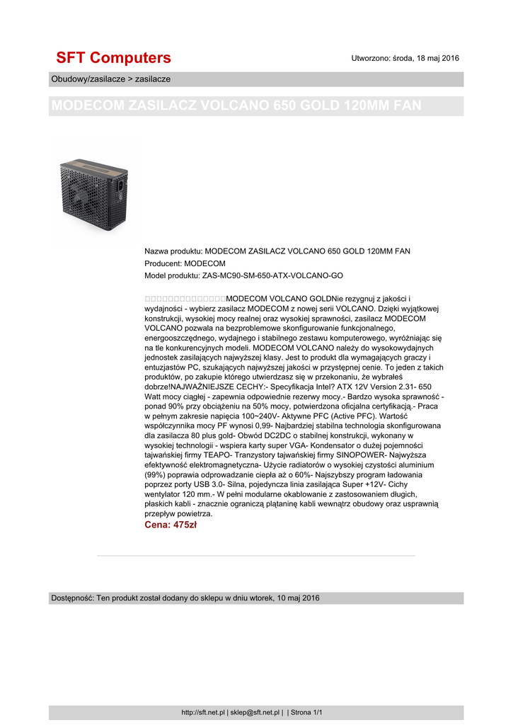 SFT Computers Utworzono: środa, 18 maj 2016 Obudowy/zasilacze > zasilacze MODECOM ZASILACZ VOLCANO 650 GOLD 120MM FAN Nazwa produktu: MODECOM ZASILACZ VOLCANO 650 GOLD 120MM FAN Producent: MODECOM Model produktu: ZAS-MC90-SM-650-ATX-VOLCANO-GO MODECOM VOLCANO GOLDNie rezygnuj z jakości i wydajności - wybierz zasilacz MODECOM z nowej serii VOLCANO. Dzięki wyjątkowej konstrukcji, wysokiej mocy realnej oraz wysokiej sprawności, zasilacz MODECOM VOLCANO pozwala na bezproblemowe skonfigurowanie funkcjonalnego, energooszczędnego, wydajnego i stabilnego zestawu komputerowego, wyróżniając się na tle konkurencyjnych modeli. MODECOM VOLCANO należy do wysokowydajnych jednostek zasilających najwyższej klasy. Jest to produkt dla wymagających graczy i entuzjastów PC, szukających najwyższej jakości w przystępnej cenie. To jeden z takich produktów, po zakupie którego utwierdzasz się w przekonaniu, że wybrałeś dobrze!NAJWAŻNIEJSZE CECHY:- Specyfikacja Intel? ATX 12V Version 2.31- 650 Watt mocy ciągłej - zapewnia odpowiednie rezerwy mocy.- Bardzo wysoka sprawność ponad 90% przy obciążeniu na 50% mocy, potwierdzona oficjalna certyfikacją.- Praca w pełnym zakresie napięcia 100~240V- Aktywne PFC (Active PFC). Wartość współczynnika mocy PF wynosi 0,99- Najbardziej stabilna technologia skonfigurowana dla zasilacza 80 plus gold- Obwód DC2DC o stabilnej konstrukcji, wykonany w wysokiej technologii - wspiera karty super VGA- Kondensator o dużej pojemności tajwańskiej firmy TEAPO- Tranzystory tajwańskiej firmy SINOPOWER- Najwyższa efektywność elektromagnetyczna- Użycie radiatorów o wysokiej czystości aluminium (99%) poprawia odprowadzanie ciepła aż o 60%- Najszybszy program ładowania poprzez porty USB 3.0- Silna, pojedyncza linia zasilająca Super +12V- Cichy wentylator 120 mm.- W pełni modularne okablowanie z zastosowaniem długich, płaskich kabli - znacznie ograniczą plątaninę kabli wewnątrz obudowy oraz usprawnią przepływ powietrza. Cena: 475zł Dostępność: Ten produkt został dodany do sklepu w dniu wtorek, 10 maj 2016 http://sft.net.pl | [email protected] | | Strona 1/1