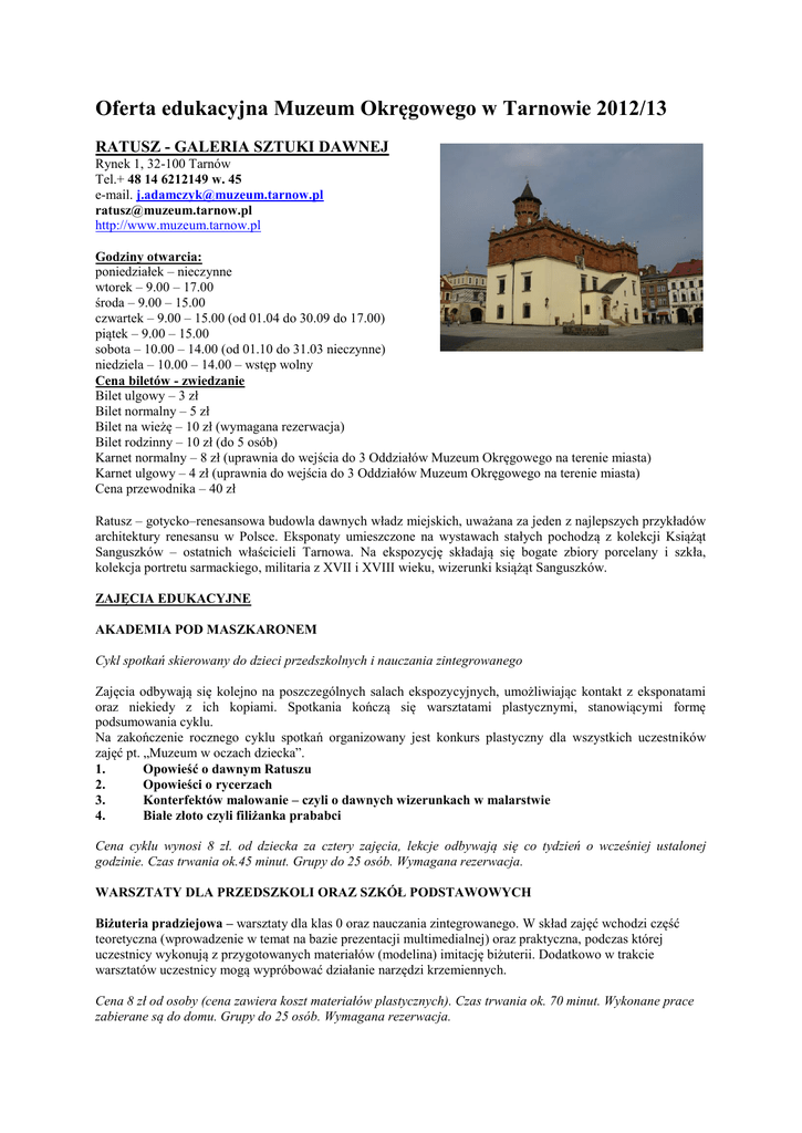 Oferta edukacyjna Muzeum Okręgowego w Tarnowie 2012/13 RATUSZ - GALERIA SZTUKI DAWNEJ Rynek 1, 32-100 Tarnów Tel.+ 48 14 6212149 w. 45 e-mail. [email protected] [email protected] http://www.muzeum.tarnow.pl Godziny otwarcia: poniedziałek – nieczynne wtorek – 9.00 – 17.00 środa – 9.00 – 15.00 czwartek – 9.00 – 15.00 (od 01.04 do 30.09 do 17.00) piątek – 9.00 – 15.00 sobota – 10.00 – 14.00 (od 01.10 do 31.03 nieczynne) niedziela – 10.00 – 14.00 – wstęp wolny Cena biletów - zwiedzanie Bilet ulgowy – 3 zł Bilet normalny – 5 zł Bilet na wieżę – 10 zł (wymagana rezerwacja) Bilet rodzinny – 10 zł (do 5 osób) Karnet normalny – 8 zł (uprawnia do wejścia do 3 Oddziałów Muzeum Okręgowego na terenie miasta) Karnet ulgowy – 4 zł (uprawnia do wejścia do 3 Oddziałów Muzeum Okręgowego na terenie miasta) Cena przewodnika – 40 zł Ratusz – gotycko–renesansowa budowla dawnych władz miejskich, uważana za jeden z najlepszych przykładów architektury renesansu w Polsce. Eksponaty umieszczone na wystawach stałych pochodzą z kolekcji Książąt Sanguszków – ostatnich właścicieli Tarnowa. Na ekspozycję składają się bogate zbiory porcelany i szkła, kolekcja portretu sarmackiego, militaria z XVII i XVIII wieku, wizerunki książąt Sanguszków. ZAJĘCIA EDUKACYJNE AKADEMIA POD MASZKARONEM Cykl spotkań skierowany do dzieci przedszkolnych i nauczania zintegrowanego Zajęcia odbywają się kolejno na poszczególnych salach ekspozycyjnych, umożliwiając kontakt z eksponatami oraz niekiedy z ich kopiami. Spotkania kończą się warsztatami plastycznymi, stanowiącymi formę podsumowania cyklu. Na zakończenie rocznego cyklu spotkań organizowany jest konkurs plastyczny dla wszystkich uczestników zajęć pt. „Muzeum w oczach dziecka”. 1. Opowieść o dawnym Ratuszu 2. Opowieści o rycerzach 3. Konterfektów malowanie – czyli o dawnych wizerunkach w malarstwie 4. Białe złoto czyli filiżanka prababci Cena cyklu wynosi 8 zł. od dziecka za cztery zajęcia, lekcje odbywają się co tydzień o wcześniej ustalonej godzinie. Czas trwania ok.45 minut. Grupy do 25 osób. Wymagana rezerwacja. WARSZTATY DLA PRZEDSZKOLI ORAZ SZKÓŁ PODSTAWOWYCH Biżuteria pradziejowa – warsztaty dla klas 0 oraz nauczania zintegrowanego. W skład zajęć wchodzi część teoretyczna (wprowadzenie w temat na bazie prezentacji multimedialnej) oraz praktyczna, podczas której uczestnicy wykonują z przygotowanych materiałów (modelina) imitację biżuterii. Dodatkowo w trakcie warsztatów uczestnicy mogą wypróbować działanie narzędzi krzemiennych. Cena 8 zł od osoby (cena zawiera koszt materiałów plastycznych). Czas trwania ok. 70 minut. Wykonane prace zabierane są do domu. Grupy do 25 osób. Wymagana rezerwacja. Savoir-vivre - warsztaty dotyczą dobrych manier i bogactwa obyczajów, które niegdyś panowały na szlacheckich stołach. Poruszane są także współczesne zasady dobrego zachowania, które obowiązują podczas zasiadania do stołu. Z uczestnikami warsztatów są omawiane również cechy polskiej gościnności, smaki staropolskiej kuchni i zastawa stołowa, która była używana przez naszych przodków, a którą dzieci podczas zajęć mogą zobaczyć na ekspozycji w Ratuszu. Natomiast w sali edukacyjnej, czeka na dzieci zabawa pt.:”Niezbędne kiedyś i dziś”, gdzie przy użyciu tablicy multimedialnej uczniowie muszą przyporządkować ilustracje związane z jedzeniem i zastawa stołową do odpowiednich epok. Na koniec zajęć uczestnicy przygotowują stół do współczesnego przyjęcia urodzinowego dla dziecka. Cena warsztatów 6 zł od osoby. Czas trwania ok. 60 minut. Grupy do 25 osób. Wymagana rezerwacja. Koszałek Opałek – czyli sztuka kaligrafii - warsztaty kaligraficzne które otworzą przed uczestnikami magiczny świat skryptorium, przybliżą średniowieczne rękopisy, piękno kaligrafii, misterne zdobienie i wszystkie tajniki związane z tą dziedziną. Warsztaty skierowane są dla dwóch grup wiekowych: klasy od 1-3 , 4-6. Zajęcia podzielone są na dwie części: część teoretyczna na której dzieci za pomocą tablicy multimedialnej będą mogły obejrzeć materiały związane z tematem i usłyszeć historię dotyczącą np.: gęsiego pióra, pergaminu, atramentu itd. Druga część zajęć to część praktyczna na której same będą mogły się przekonać czy sztuka pisania na ręcznie czerpanym papierze to łatwa sprawa. Młodsze dzieci wykonają dekoracyjny inicjał. Cena warsztatów 6 zł od osoby. Czas trwania ok. 60 minut. Grupy do 20 osób. Wymagana rezerwacja. ZAJĘCIA DLA SZKÓŁ PODSTAWOWYCH I PONADPODSTAWOWYCH 1. Historia Tarnowa – blok tematów poświęconych historii i kulturze, wybitnym postaciom, ważnym wydarzeniom w dziejach miasta. Lekcje prowadzone są w oparciu o znajdujące się w zbiorach muzealia, kopie zabytkowych przedmiotów oraz prezentacje multimedialne. Proponowane tematy: Lokacja miasta – jak Tarnów zakładano Renesansowy Tarnów – architektura i rzeźba renesansu Hetman Jan Tarnowski – wódz, mecenas sztuki, właściciel miasta Józef Bem – generał niespełnionych nadziei 2. Krajobraz sarmacki – portret i kultura staropolska – w oparciu o bogate zbiory zbrojowni i jednej z najlepszych w Polsce kolekcji portretu staropolskiego omawiana jest barwna kultura doby sarmatyzmu. 3. Świata starożytnego opisanie – zajęcia poświęcone sztuce najstarszych cywilizacji. Lekcje prowadzone są w oparciu o pokazy multimedialne. Proponowane tematy: Sztuka starożytnej Mezopotamii Sztuka starożytnego Egiptu Sztuka starożytnej Grecji Sztuka starożytnego Rzymu 4. Historia sztuki dla każdego – zajęcia poświęcone poszczególnym stylom w sztuce europejskiej i polskiej prowadzone w oparciu o pokazy multimedialne. Poszczególne zajęcia prezentują na wybranych przykładach najwybitniejsze osiągnięcia w architekturze, malarstwie i rzeźbie począwszy od sztuki wczesnoc