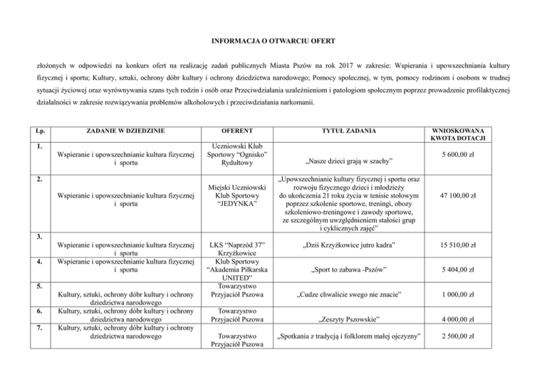 INFORMACJA O OTWARCIU OFERT złożonych w odpowiedzi na konkurs ofert na realizację zadań publicznych Miasta Pszów na rok 2017 w zakresie: Wspierania i upowszechniania kultury fizycznej i sportu; Kultury, sztuki, ochrony dóbr kultury i ochrony dziedzictwa narodowego; Pomocy społecznej, w tym, pomocy rodzinom i osobom w trudnej sytuacji życiowej oraz wyrównywania szans tych rodzin i osób oraz Przeciwdziałania uzależnieniom i patologiom społecznym poprzez prowadzenie profilaktycznej działalności w zakresie rozwiązywania problemów alkoholowych i przeciwdziałania narkomanii. Lp. ZADANIE W DZIEDZINIE OFERENT TYTUŁ ZADANIA Wspieranie i upowszechnianie kultura fizycznej i sportu Uczniowski Klub Sportowy “Ognisko” Rydułtowy „Nasze dzieci grają w szachy” Wspieranie i upowszechnianie kultura fizycznej i sportu Miejski Uczniowski Klub Sportowy “JEDYNKA” 1. 2. „Upowszechnianie kultury fizycznej i sportu oraz rozwoju fizycznego dzieci i młodzieży do ukończenia 21 roku życia w tenisie stołowym poprzez szkolenie sportowe, treningi, obozy szkoleniowo-treningowe i zawody sportowe, ze szczególnym uwzględnieniem stałości grup i cyklicznych zajęć” WNIOSKOWANA KWOTA DOTACJI 5 600,00 zł 47 100,00 zł 3. 4. Wspieranie i upowszechnianie kultura fizycznej i sportu Wspieranie i upowszechnianie kultura fizycznej i sportu 5. 6. 7. Kultury, sztuki, ochrony dóbr kultury i ochrony dziedzictwa narodowego Kultury, sztuki, ochrony dóbr kultury i ochrony dziedzictwa narodowego Kultury, sztuki, ochrony dóbr kultury i ochrony dziedzictwa narodowego LKS “Naprzód 37” Krzyżkowice Klub Sportowy “Akademia Piłkarska UNITED” Towarzystwo Przyjaciół Pszowa Towarzystwo Przyjaciół Pszowa Towarzystwo Przyjaciół Pszowa „Dziś Krzyżkowice jutro kadra” 15 510,00 zł „Sport to zabawa -Pszów” 5 404,00 zł „Cudze chwalicie swego nie znacie” 1 000,00 zł „Zeszyty Pszowskie” 4 000,00 zł „Spotkania z tradycją i folklorem małej ojczyzny” 2 500,00 zł 8. 9. 10. 11. Kultury, sztuki, ochrony dóbr kultury i ochrony dziedzictwa narodowego Stowarzyszenie Paramilitarne „Prochownia 1910” Pomocy społecznej, w tym pomocy rodzinom i osobom w trudnej sytuacji życiowej oraz wyrównania szans tych rodzin i osób Pomocy społecznej, w tym pomocy rodzinom i osobom w trudnej sytuacji życiowej oraz wyrównania szans tych rodzin i osób Przeciwdziałanie uzależnieniom i patologiom społecznym poprzez prowadzenie profilaktycznej działalności w zakresie rozwiązywania problemów alkoholowych i przeciwdziałania narkomanii Towarzystwo Przyjaciół Pszowa Stowarzyszenie Pomóżmy Sobie „Radość życia” 15 600,00 zł Przeciwdziałanie uzależnieniom i zapobieganie patologiom społecznym Fundacja Nowe Horyzonty „Na dobrej drodze ku dorosłości” 15 600,00 zł Stowarzyszenie Pomóżmy Sobie “Świadectwo historii i pomnik architektury militarnej oraz przemysłowej – Pruska Prochownia w Pszowie” 6 510,00 zł „WSZYSCY RAZEM – prowadzenie świetlicy Radość Życia dla osób niepełnosprawnych w Pszowie” „Mogę więcej…” 17 000,00 zł 35 992,75 zł 12.