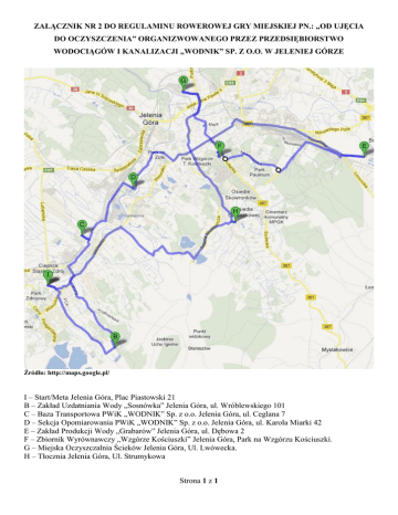 ZAŁĄCZNIK NR 2 DO REGULAMINU ROWEROWEJ GRY MIEJSKIEJ PN.: „OD UJĘCIA DO OCZYSZCZENIA” ORGANIZWOWANEGO PRZEZ PRZEDSIĘBIORSTWO WODOCIĄGÓW I KANALIZACJI „WODNIK” SP. Z O.O. W JELENIEJ GÓRZE Źródło: http://maps.google.pl/ I – Start/Meta Jelenia Góra, Plac Piastowski 21 B – Zakład Uzdatniania Wody „Sosnówka” Jelenia Góra, ul. Wróblewskiego 101 C – Baza Transportowa PWiK „WODNIK” Sp. z o.o. Jelenia Góra, ul. Ceglana 7 D – Sekcja Opomiarowania PWiK „WODNIK” Sp. z o.o. Jelenia Góra, ul. Karola Miarki 42 E – Zakład Produkcji Wody „Grabarów” Jelenia Góra, ul. Dębowa 2 F – Zbiornik Wyrównawczy „Wzgórze Kościuszki” Jelenia Góra, Park na Wzgórzu Kościuszki. G – Miejska Oczyszczalnia Ścieków Jelenia Góra, Ul. Lwówecka. H – Tłocznia Jelenia Góra, Ul. Strumykowa Strona 1 z 1