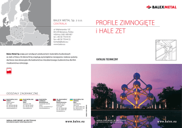 PROFILE ZIMNOGIĘTE i HALE ZET balex metal sp. z o.o. CENTRALA ul. Wejherowska 12C 84-239 Bolszewo, Polska Infolinia: 0 801 000 807 tel. +48 58 778 44 44 fax +48 58 778 44 55 [email protected] www.balex.eu Balex Metal sp. z o.o. jest wiodącym producentem materiałów budowlanych ze stali w Polsce. W ofercie firmy znajdują się kompletne rozwiązania i stalowe systemy KATALOG TECHNICZNY dachowe oraz elewacyjne dla budownictwa mieszkaniowego, budownictwa dla firm i budownictwa rolniczego. BALEX METAL S.R.O. CZECHY Hradec Králové Vázní 1097 tel. +420 495 482 683 fax +420 495 482 683 [email protected] BALEX METAL UAB LITWA Wilno Savanoriu 174A tel. +370 527 30 299 fax +370 527 30 295 [email protected] Infolinia: 0 801 000 807, tel: 058 778 44 44 koszt połączenia zgodny z taryfą Twojego operatora BALEX METAL SŁOWACJA Banská Bystrica Partizánska cesta 94, 974 01 tel./fax + 421 48 419 75 27 [email protected] SIA „BALEX METAL” ŁOTWA Ražotne Brocēnos Liepnieku iela 10, Brocēni, Saldus raj. LV-3851 tel. +371 638 65 886 fax +371 638 07 401 [email protected] BALEX METAL TOV UKRAINA Kijów 30 Vasilkovska, office 4-03 tel. +380 44 39 07 144 fax +380 44 39 07 145 [email protected] w w w.b alex.e u Indeks 15-05-2009 02 ODDZIAŁY ZAGRANICZNE Infolinia: 0 801 000 807, tel: 058 778 44 44 koszt połączenia zgodny z taryfą Twojego operatora w w w. ba l ex . e u PROFILE ZIMNOGIĘTE I HALE ZET Maj 2009 Zawartość niniejszego folderu nie stanowi oferty handlowej w rozumieniu przepisów Kodeksu cywilnego. Informacje zawarte w niniejszym opracowaniu stanowią jedynie rozwiązania przykładowe, które dla potrzeb poszczególnych klientów wymagają konsultacji i doprecyzowania przez projektanta danego obiektu. Balex Metal nie ponosi odpowiedzialności w przypadku zaistnienia jakichkolwiek nieprawidłowości natury technicznej lub błędów wynikających z niewłaściwego wykorzystania informacji zawartych w niniejszym opracowaniu. BELKI_ZETOWE_maj_2009.indd 1 Podstawowy czarny 2009-06-17 12:31:07 BELKI_ZETOWE_maj_2009.indd 2 Podstawowy czarny 2009-06-17 12:31:08 SPIS TREŚCI I. PROFILE ZIMNOGIĘTE – ZETOWNIKI, CEOWNIKI, PROFILE INDYWIDUALNE 1. Dane techniczne zetowników ......................................................................................................................................................................6 2. Nomogramy wytrzymałościowe zetowników ........................................................................................................................................7 2.1. Kształtownik zetowy Z 150 ...................................................................................................................................................................8 2.2. Kształtownik zetowy Z 175 ...................................................................................................................................................................9 2.3. Kształtownik zetowy Z 200 ................................................................................................................................................................ 10 2.4. Kształtownik zetowy Z 225 ................................................................................................................................................................ 11 2.5. Kształtownik zetowy Z 250 ................................................................................................................................................................ 12 2.6. Kształtownik zetowy Z 300 ................................................................................................................................................................ 13 3. Zetowniki otworowane ............................................................................................................................................................................... 14 3.1. Otworowanie kształtowników zetowych...................................................................................................................................... 14 3.2. Schematy otworowania kształtowników zetowych ................................................................................................................. 14 4. Profile indywidualne ..................................................................................................................................................................................... 15 5. Karty zamówień profili zimnogiętych .................................................................................................................................................... 16 II. HALE ZET 1. Typoszereg hal ................................................................................................................................................................................................ 20 2. Schemat ideowy konstrukcji ..................................................................................................................................................................... 20 3. Wymiary hal ..................................................................................................................................................................................................... 21 4. Charakterystyka konstrukcji ...................................................................................................................................................................... 22 4.1. Podstawowe elementy konstrukcji hal............................................................................................................................................... 23 4.2. Detal naroża ramy ...................................................................................................................................................................................... 24 4.3. Stopa słupa ...................................................