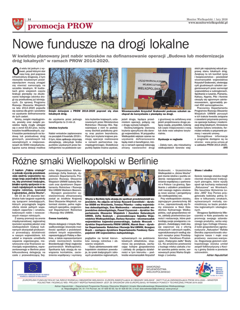 14 Monitor Wielkopolski | luty 2016 www.monitorwielkopolski.pl promocja PROW Nowe fundusze na drogi lokalne W kwietniu planowany jest nabór wniosków na dofinansowanie operacji „Budowa lub modernizacja dróg lokalnych” w ramach PROW 2014-2020. d wielu lat jednym z wyzwań, przed którymi stoi nasz kraj, jest poprawa infrastruktury drogowej. Z tym niezwykle kosztownym przedsięwzięciem muszą zmagać się również samorządy na szczeblu lokalnym. W budżetach gmin wiejskich często brakuje pieniędzy na zbudowanie kolejnego odcinka drogi czy przebudowę już istniejących. Za sprawą Programu Rozwoju Obszarów Wiejskich na lata 2014-2020 pojawiła się szansa dla gmin i powiatów na uzyskanie dofinansowania do tych zadań. Gminy, związki międzygminne, powiaty oraz związki powiatów będą mogły ubiegać się o zwrot 63,63 proc. kwoty kosztów kwalifikowalnych, czyli kosztów poniesionych na budowę lub przebudowę dróg gminnych, powiatowych lub wewnętrznych w miejscowościach do 5000 mieszkańców. Łączna suma dotacji możliwa FOT. ARCHIWUM DOW UMWW O Dzięki dotacjom z PROW 2014-2020 poprawi się stan lokalnych dróg. Wicemarszałek Krzysztof Grabowski podczas szkoleń zachęcał do korzystania z pieniędzy na drogi. do uzyskania przez jednego beneficjenta to 3 mln zł. jeżeli droga, będąca przedmiotem operacji, połączy się z drogą wyższej kategorii. Osobną kategorię stanowią kryteria specyficzne dla danego województwa. W przypadku Wielkopolski większe szanse na uzyskanie dofinansowania będą mieli ci beneficjenci, którzy w ramach operacji dokonają zmiany nawierzchni drogi Istotne kryteria Nabór wniosków zaplanowano na początek II kwartału 2016 r. O tym, które aplikacje otrzymają akceptację, zdecyduje liczba punktów uzyskanych przez beneficjentów na podstawie sze- ściu kryteriów krajowych, ustanowionych przez Ministerstwo Rolnictwa i Rozwoju Wsi. Najważniejsze z nich to podstawowy dochód podatkowy gminy oraz poziom bezrobocia. Poza tym kryteria krajowe premiują operacje realizowane w ramach partnerstwa (np. międzygminnego). Dodatkowe punkty będzie można uzyskać, z gruntowej na asfaltową oraz jeżeli projektowana droga połączy osadę, przysiółek, kolonię lub część miejscowości z wsią lub dwie wsie odrębne terytorialnie. Dyskusje w regionie – Zależy nam, aby mieszkańcy wielkopolskich terenów wiej- skich jak najszybciej odczuli poprawę stanu lokalnych dróg. Zwiększy to ich komfort życia i bezpieczeństwo – powiedział wicemarszałek województwa Krzysztof Grabowski, otwierając cykl grudniowych szkoleń zorganizowanych przez samorząd województwa w subregionach. Spotkania w Lesznie, Poznaniu, Kaliszu, Kępnie, Pile i Koninie cieszyły się ogromnym zainteresowaniem, zgromadziły ponad 450 samorządowców. Pracownicy Departamentu Programów Rozwoju Obszarów Wiejskich UMWW poruszyli w ich trakcie kwestie związane z zasadami przyznania pomocy na operacje budowy i modernizacji dróg lokalnych. Omówiono kryteria wyboru wniosków, formularz wniosku o przyznanie pomocy i warunki umowy. Szczegółowe informacje o programie dostępne są na stronie: www.prow.umww.pl w zakładce PROW 2014-2020. AKA Z hasłem „Polska smakuje” w połowie stycznia przedstawiciele siedmiu województw naszego kraju pojechali do Berlina, aby promować tradycyjne, lokalne wyroby spożywcze w ramach największych na świecie targów rolnictwa, żywności i ogrodnictwa „Grüne Woche”. Od 15 do 24 stycznia berlińskie hale targowe wypełniły się tysiącami zwiedzających, których przyciągnęła bogata oferta stoisk pełnych wspaniałych zapachów i smaków, kolorowych roślin i nowoczesnych maszyn rolniczych. Z szansy promocji na arenie międzynarodowej regionalnej żywności wysokiej jakości oraz wielkopolskich tradycji kulinarnych skorzystali producenci prowadzący działalność w naszym województwie. Ich udział w imprezie umożliwiło wsparcie organizacyjne, merytoryczne oraz finansowe samorządu województwa, reprezentowanego w Berlinie przez kilkuosobową delegację na czele z przewodniczącą Sej- miku Województwa Wielkopolskiego Zofią Szalczyk, dyrektorem Departamentu Programów Rozwoju Obszarów Wiejskich UMWW Izabelą Mroczek oraz dyrektorem Departamentu Rolnictwa i Rozwoju Wsi UMWW Markiem Beerem. Wynajem powierzchni wystawienniczej sfinansowany został ze środków Krajowej Sieci Obszarów Wiejskich, natomiast stoisko, pełne regionalnych specjałów, zorganizował Departament Rolnictwa i Rozwoju Wsi UMWW. Cenne kontakty Wizyta delegacji z Urzędu Marszałkowskiego stworzyła możliwość spotkań z przedstawicielami innych województw, reprezentujących Polskę w Berlinie, a także reprezentantami władz niemieckich landów Brandenburgii i Hesji (regionów partnerskich Wielkopolski). Spotkania były okazją do nawiązania kontaktów, zacieśnienia współpracy i wymiany ŹRÓDŁO: ARCHIWUM DOW UMWW Różne smaki Wielkopolski w Berlinie Wizyta w Berlinie była okazją do spotkań przedstawicieli województw. Na zdjęciu od lewej: Ryszard Czerwiński – dyrektor DODR we Wrocławiu, Tomasz Pilawka – radny województwa dolnośląskiego, Ewa Mańkowska – wicemarszałek województwa dolnośląskiego, Paweł Czyszczoń – dyrektor Departamentu Obszarów Wiejskich i Zasobów Naturalnych UMWD, Zofia Szalczyk – przewodnicząca Sejmiku Województwa Wielkopolskiego, Dariusz Kurzawa – wicemarszałek województwa kujawsko-pomorskiego, Izabela Mroczek – dyrektor Departamentu PROW UMWW, Marek Beer – dyrektor Departamentu Rolnictwa i Rozwoju Wsi UMWW, Grzegorz Brach – zastępca dyrektora Departamentu Funduszy Europejskich UM województwa małopolskiego. poglądów na temat kierunków rozwoju rolnictwa i obszarów wiejskich. – Duże zainteresowanie wielkopolskim stoiskiem powoduje, że rynek tradycyjnych i zdrowych produktów regionalnych, wytwarzanych na podstawie lokalnych składników, stopniowo się powiększa, zachęc