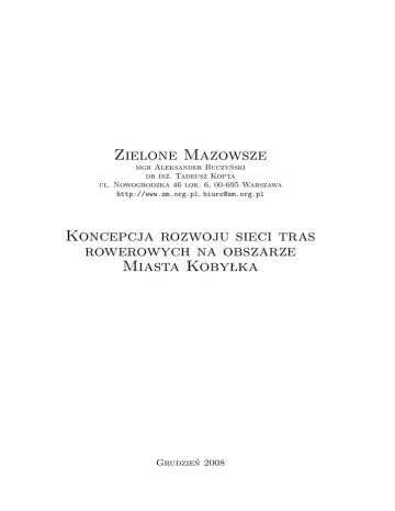 Zielone Mazowsze mgr Aleksander Buczyński dr inż. Tadeusz Kopta ul. Nowogrodzka 46 lok. 6, 00-695 Warszawa http://www.zm.org.pl, [email protected] Koncepcja rozwoju sieci tras rowerowych na obszarze Miasta Kobyłka Grudzień 2008 Spis treści 1. Wprowadzenie . . . . . . . . . . . . . . . . . . . . . . . . . . . . . . . 1.1. Geneza i zawartość koncepcji . . . . . . . . . . . . . . . 1.1.1. Geneza opracowania . . . . . . . . . . . . . . . . 1.1.2. Struktura opracowania . . . . . . . . . . . . . . 1.1.3. Dokumenty związane . . . . . . . . . . . . . . . 1.2. Podstawy planowania tras rowerowych . . . . . . . . . . 1.2.1. Rola roweru w systemie transportowym gminy . 1.2.2. Program 5 wymogów . . . . . . . . . . . . . . . 1.2.3. Składniki systemu rowerowego . . . . . . . . . . 1.2.4. Wybór sposobu prowadzenia ruchu rowerowego . . . . . . . . . . . . . . . . . . . . . . . . . . . . . . . . . . . . . . . . . . . . . 4 4 4 5 5 5 6 6 7 2. Analiza stanu istniejącego i uwarunkowań . . . . . . . . . . . . . . 10 2.1. 2.2. 2.3. 2.4. Istniejąca infrastruktura rowerowa . . . . . . . . . . . . . . . . Natężenie i rozkład ruchu rowerowego . . . . . . . . . . . . . . Zdarzenia drogowe z udziałem rowerzystów . . . . . . . . . . . Uwarunkowania planistyczne . . . . . . . . . . . . . . . . . . . 2.4.1. Plan zagospodarowania przestrzennego województwa mazowieckiego . . . . . . . . . . . . . . . . . . . . . . . 2.4.2. Studium uwarunkowań i kierunków zagospodarowania przestrzennego . . . . . . . . . . . . . . . . . . . . . . . 2.4.3. Miejscowe plany zagospodarowania przestrzennego . . . 2.5. Inne uwarunkowania . . . . . . . . . . . . . . . . . . . . . . . . 2.5.1. Warunki techniczne dla dróg publicznych . . . . . . . . 2.5.2. Planowane inwestycje . . . . . . . . . . . . . . . . . . . 2.5.3. Główne przeszkody terenowe . . . . . . . . . . . . . . . . . . . . . . . . 4 . . . . 10 10 13 14 . . 14 . . . . . . . . . . . . 14 14 16 16 17 18 3. Sieć tras rowerowych . . . . . . . . . . . . . . . . . . . . . . . . . . . 19 3.1. Ogólna charakterystyka sieci . . . . . . . . . . . . . . . . . . 3.1.1. Przyjęte założenia . . . . . . . . . . . . . . . . . . . . 3.1.2. Hierarchia tras rowerowych . . . . . . . . . . . . . . . 3.2. Podział według sposobu prowadzenia . . . . . . . . . . . . . 3.2.1. Drogi rowerowe w pasie drogowym . . . . . . . . . . . 3.2.2. Drogi rowerowe w ulicach projektowanych . . . . . . 3.2.3. Pasy rowerowe w jezdni . . . . . . . . . . . . . . . . . 3.2.4. Drogi rowerowe poza pasem drogowym . . . . . . . . 3.2.5. Drogi rowerowe poza pasem drogowym, nawierzchnia gruntowa . . . . . . . . . . . . . . . . . . . . . . . . . 3.2.6. Uspokojenie ruchu w ulicach istniejących . . . . . . . 3.2.7. Uspokojenie ruchu w ulicach projektowanych . . . . . 3.2.8. Małe i mini- ronda . . . . . . . . . . . . . . . . . . . 3.3. Opis tras . . . . . . . . . . . . . . . . . . . . . . . . . . . . . 3.3.1. Ul. Brzozowa . . . . . . . . . . . . . . . . . . . . . . . 3.3.2. Ul. Dworkowa . . . . . . . . . . . . . . . . . . . . . . . . . . . . . . . . . . . . . . . . . . . . . . . . . . 19 19 19 21 21 21 22 22 . . . . . . . . . . . . . . . . . . . . . 22 22 22 23 23 23 23 3.3.3. 3.3.4. 3.3.5. 3.3.6. 3.3.7. 3.3.8. 3.3.9. 3.3.10. 3.3.11. 3.3.12. 3.3.13. 3.3.14. 3.3.15. 3.3.16. 3.3.17. 3.3.18. 3.3.19. 3.3.20. 3.3.21. 3.3.22. Ul. Jana Pawła II, Pieniążka, Marmo . . . . . Ul. Kościelna, Kraszewska . . . . . . . . . . . Ul. Kościuszki, Paschalisa . . . . . . . . . . . Ul. Nadarzyńska . . . . . . . . . . . . . . . . . Ul. Nadarzyn . . . . . . . . . . . . . . . . . . Ul. Napoleona, Poniatowskiego . . . . . . . . . Ul. Norweska, Graniczna, Nowa . . . . . . . . Ul. Orląt Lwowskich . . . . . . . . . . . . . . Ul. Orszagha . . . . . . . . . . . . . . . . . . . Ul. Orzeszkowej . . . . . . . . . . . . . . . . . Ul. Przyjacielska . . . . . . . . . . . . . . . . . Ul. Ręczajska . . . . . . . . . . . . . . . . . . Ul. Reja . . . . . . . . . . . . . . . . . . . . . Ul. Serwitucka . . . . . . . . . . . . . . . . . . Ul. Szeroka, Marecka, Zagańczyka, Załuskiego Ul. Warszawska, Turowska . . . . . . . . . . . Ul. Wołomińska . . . . . . . . . . . . . . . . . Ul. Wygonowa . . . . . . . . . . . . . . . . . . Ul. Żymirskiego . . . . . . . . . . . . . . . . . Rezerwat Grabicz . . . . . . . . . . . . . . . . . . . . . . . . . . . . . . . . . . . . . . . . . . . . . . . . . . . . . . . . . . . . . . . . . . . . . . . . . . . . . . . . . . . . . . . . . . . . . . . . . . . . . . . . . . . . . . . . . . . . . . . . . . . . . . . . . . . . . . . . . . . . . . . . . . . . . . . . . . . . 23 24 24 25 26 26 26 27 27 27 28 28 28 29 29 30 31 31 31 31 4. Etapowanie i oszacowanie kosztów realizacji koncepcji 4.1. Przyjęte zasady etapowania . . . . . . . . . . . . . . . . 4.2. Przyjęte wskaźniki kosztów . . . . . . . . . . . . . . . . 4.3. Etap I . . . . . . . . . . . . . . . . . . . . . . . . . . . . 4.3.1. Drogi dla rowerów . . . . . . . . . . . . . . . . . 4.3.2. Pasy dla rowerów . . . . . . . . . . . . . . . . . 4.3.3. Adaptacja dróg leśnych . . . . . . . . . . . . . . 4.3.4. Uspokojenie ruchu . . . . . . . . . . . . . . . . . 4.3.5. Podsumowanie etapu . . . . . . . . . . . . . . . 4.4. Etap II . . . . . . . . . . . . . . . . . . . . . . . . . . . 4.4.1. Drogi dla rowerów . . . . . . . . . . . . . . . . . 4.4.2. Pasy dla rowerów . . . . . . . . . . . . . . . . . 4.4.3. Adaptacja dróg leśnych . . . . . . . . . . . . . . 4.4.4. Podsumowanie etapu . . . . . . . . . . . . . . . 4.5. Podsumowanie kosztów . . . . . . . . . . . . . . . . . . . . . . . . . . . . . . . . . . . . . . . . . . . . . . . . . . . . . . . . . . . . . . . . . . . . . . . . . . . . . . . . . . . . . . . . . . . . . . . . . . . . . . . . . . . . 32 32 34 36 36 36 36 37 37 38 38 38 38 39 39 Bibliografia . . . . . . . . . . . . . . . . . . . . . . . . . . . . . . . . . . . 40 A. Raport z konsultacji społecznych . . . . . . . . A.1. Wprowadzenie . . . . .