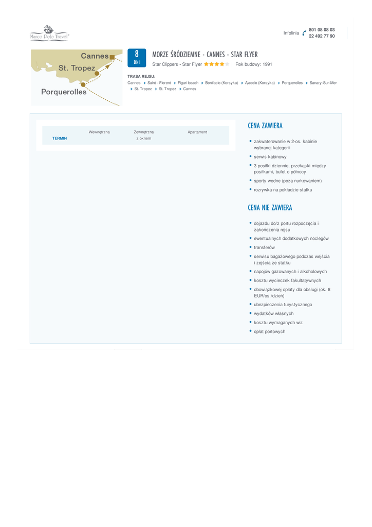 Infolinia 8 MORZE ŚRÓDZIEMNE - CANNES - STAR FLYER DNI Star Clippers - Star Flyer 801 08 08 03 22 492 77 90 | Rok budowy: 1991 TRASA REJSU: Cannes Saint - Florent St. Tropez Wewnętrzna TERMIN Zewnętrzna z oknem St. Tropez Figari beach Bonifacio (Korsyka) Ajaccio (Korsyka) Porquerolles Sanary-Sur-Mer Cannes Apartament CENA ZAWIERA zakwaterowanie w 2-os. kabinie wybranej kategorii serwis kabinowy 3 posiłki dziennie, przekąski między posiłkami, bufet o północy sporty wodne (poza nurkowaniem) rozrywka na pokładzie statku CENA NIE ZAWIERA dojazdu do/z portu rozpoczęcia i zakończenia rejsu ewentualnych dodatkowych noclegów transferów serwisu bagażowego podczas wejścia i zejścia ze statku napojów gazowanych i alkoholowych kosztu wycieczek fakultatywnych obowiązkowej opłaty dla obsługi (ok. 8 EUR/os./dzień) ubezpieczenia turystycznego wydatków własnych kosztu wymaganych wiz opłat portowych