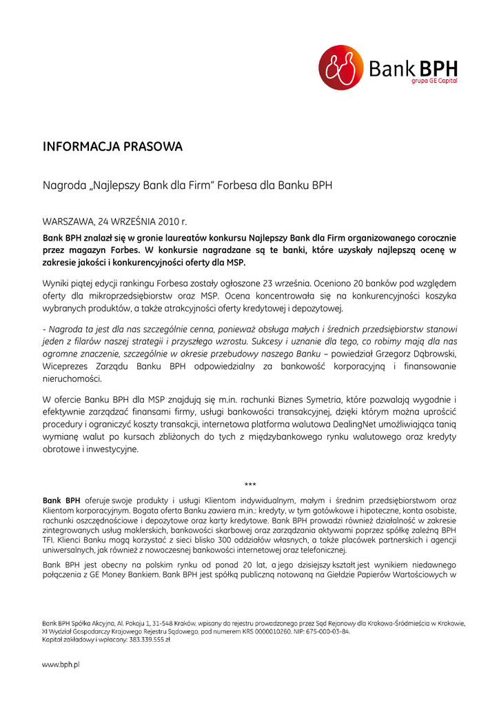 INFORMACJA PRASOWA Nagroda „Najlepszy Bank dla Firm” Forbesa dla Banku BPH WARSZAWA, 24 WRZEŚNIA 2010 r. Bank BPH znalazł się w gronie laureatów konkursu Najlepszy Bank dla Firm organizowanego corocznie przez magazyn Forbes. W konkursie nagradzane są te banki, które uzyskały najlepszą ocenę w zakresie jakości i konkurencyjności oferty dla MSP. Wyniki piątej edycji rankingu Forbesa zostały ogłoszone 23 września. Oceniono 20 banków pod względem oferty dla mikroprzedsiębiorstw oraz MSP. Ocena koncentrowała się na konkurencyjności koszyka wybranych produktów, a także atrakcyjności oferty kredytowej i depozytowej. - Nagroda ta jest dla nas szczególnie cenna, ponieważ obsługa małych i średnich przedsiębiorstw stanowi jeden z filarów naszej strategii i przyszłego wzrostu. Sukcesy i uznanie dla tego, co robimy mają dla nas ogromne znaczenie, szczególnie w okresie przebudowy naszego Banku – powiedział Grzegorz Dąbrowski, Wiceprezes Zarządu Banku BPH odpowiedzialny za bankowość korporacyjną i finansowanie nieruchomości. W ofercie Banku BPH dla MSP znajdują się m.in. rachunki Biznes Symetria, które pozwalają wygodnie i efektywnie zarządzać finansami firmy, usługi bankowości transakcyjnej, dzięki którym można uprościć procedury i ograniczyć koszty transakcji, internetowa platforma walutowa DealingNet umożliwiająca tanią wymianę walut po kursach zbliżonych do tych z międzybankowego rynku walutowego oraz kredyty obrotowe i inwestycyjne. *** Bank BPH oferuje swoje produkty i usługi Klientom indywidualnym, małym i średnim przedsiębiorstwom oraz Klientom korporacyjnym. Bogata oferta Banku zawiera m.in.: kredyty, w tym gotówkowe i hipoteczne, konta osobiste, rachunki oszczędnościowe i depozytowe oraz karty kredytowe. Bank BPH prowadzi również działalność w zakresie zintegrowanych usług maklerskich, bankowości skarbowej oraz zarządzania aktywami poprzez spółkę zależną BPH TFI. Klienci Banku mogą korzystać z sieci blisko 300 oddziałów własnych, a także placówek partnerskich i agencji uniwersalnych, jak również z nowoczesnej bankowości internetowej oraz telefonicznej. Bank BPH jest obecny na polskim rynku od ponad 20 lat, a jego dzisiejszy kształt jest wynikiem niedawnego połączenia z GE Money Bankiem. Bank BPH jest spółką publiczną notowaną na Giełdzie Papierów Wartościowych w Warszawie. Siedzibą prawną Banku BPH jest Kraków, biuro centrali znajduje się w Warszawie, a główne centra operacyjne w Gdańsku i Krakowie. Bank BPH wchodzi w skład grupy kapitałowej GE, jednej z największych korporacji na świecie. Aleksandra Kwiatkowska Rzecznik prasowy Bank BPH e-mail: [email protected]
