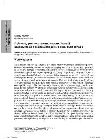 PONOWOCZESNY SYSTEM TWORZENIA POLITYKI PUBLICZNEJ Iwona Macek Uniwersytet Wrocławski Dylematy ponowoczesnej rzeczywistości na przykładzie środowiska jako dobra publicznego Słowa kluczowe: dobra publiczne, środowisko naturalne, zarządzanie publiczne (public governance), dylematy polityki ochrony środowiska Wprowadzenie Przedmiotem niniejszego artykułu jest próba analizy wybranych problemów polityki ochrony środowiska. Główna oś rozważań dotyczy kwestii środowiska jako globalnego dobra publicznego w kontekście analizy procesów zachodzących we współczesnym świecie oraz dylematów niejako wynikających z niego, czyli władzy i legitymizacji oraz deficytu demokracji. Dylemat to sytuacja, w której decydent ma do wyboru dwie równie niekorzystne decyzje (lub równie korzystne) oraz co do której nie ma ustalonych (lub są one nierozpoznane) sposobów postępowania. Dylemat środowiska jako globalnego dobra publicznego polega na tym, że to państwa narodowe określają kształt i treść tego dobra publicznego i tylko one dysponują skutecznymi, bo opartymi na przymusie środkami do jego ochrony. W globalnej przestrzeni państwa narodowe konfrontują ze sobą swoje wizje ochrony środowiska oraz swoje interesy polityczne i ekonomiczne. Interesy państw stoją też w sprzeczności do interesów globalnych podmiotów ekonomicznych, które dysponują olbrzymimi możliwościami działania wynikającymi z ich zasobów finansowych. Ich decyzje w istotny sposób wpływają na stan środowiska. Państwom przypada obecnie rola pośrednika czy też swoistego mediatora, którego zadaniem jest godzenie zewnętrznych interesów rozmaitych podmiotów, w tym swojej polityki zagranicznej z wewnętrznymi potrzebami społecznymi. Ale to państwa ponoszą odpowiedzialność za decyzje dotyczące środowiska, gdyż to ich zadaniem jest zapewnienie obywatelom stosownego stanu środowiska. Byłoby to możliwe tylko przy odpowiedniej współpracy na arenie międzynarodowej państw i innych podmiotów, lecz mnogość regulacji prawnych, zasad i reguł skutecznie to utrudnia, jeśli nie uniemożliwia. Celem artykułu jest analiza procesów, które prowadzą do tego, że w coraz bardziej skomplikowanym układzie sił WROCŁAWSKIE STUDIA POLITOLOGICZNE 17/2014 Wrocławskie Studia Politologiczne 17, 2014 © for this edition by CNS WSP17_Ksiega.indb 112 2015-02-27 14:50:11 Dylematy ponowoczesnej rzeczywistości na przykładzie środowiska 113 Dobra publiczne w systemie governance i global governance Kategoria dóbr publicznych jest stosunkowo nieostra i budzi wiele kontrowersji. Ekonomiści próbują ją zanalizować, używając kategorii popytu, podaży, rynku, własności, konkurencyjności. W efekcie takiej analizy najczęściej wyodrębniają trzy rodzaje dóbr: publiczne, mieszane i prywatne1. Dobra publiczne (tzw. „czyste”) cechują się nierywalizacyjnym charakterem oraz niewyłączalnością2. Do tak zdefiniowanych dóbr publicznych można zaliczyć jedynie obronę narodową, ewentualnie bezpieczeństwo, czasem będą to dobra typu powietrze, wody oceanów, kosmos itd.3 Pozostałe to dobra mieszane, gdzie istnieje możliwość porcjowania, wykluczania lub ograniczania, mogą też być świadczone przez sektor prywatny. Problemów związanych z dostarczaniem dóbr publicznych jest wiele i są one zróżnicowane. Będą to: kwestia ich jakości i dostępności, sposobu podziału środków na poszczególne dobra, źródeł i wysokości ich finansowania i związana z tym strategia gapowicza, problemy zarządzania, konfliktogenność uruchamiająca trudne przetargi polityczne, kwestie efektów zewnętrznych itd. Problemy owe potęgują się w przypadku globalnych dóbr publicznych, które J. Stiglitz określa jako te, z których korzyści przypadają wszystkim w ramach globalnego społeczeństwa4. W globalnej przestrzeni krzyżują się bowiem interesy państw narodowych, ponadpaństwowych podmiotów gospodarczych, instytucji i organizacji międzynarodowych. Jednym z najważniejszych globalnych dóbr publicznych jest bez wątpienia środowisko. Również globalne dobro wspólne i jego nadmierna eksploatacja przez kilka podmiotów mogą wywołać negatywne efekty zewnętrzne obciążające inne podmioty lub wszystkich użytkowników. Istota funkcjonowania dóbr publicznych polega na utrzymywaniu pożądanego stanu spraw społecznych i zachowaniu integralności państwa. Oznacza to, że państwo musi określić katalog dóbr koniecznych do optymalnego zaspokojenia potrzeb społecznych. PONOWOCZESNY SYSTEM TWORZENIA POLITYKI PUBLICZNEJ w przestrzeni globalnej trwa proces kształtowania nowej roli państw narodowych polegający na godzeniu wewnętrznej integralności, w której istotną rolę odgrywają dobra publiczne, i zewnętrznych interesów uwikłanych w globalną sieć powiązań. W pracy zawarto też analizę zmieniającej się istoty dobra publicznego na przykładzie środowiska, w zarządzaniu na poziomie państwa narodowego w kontekście procesów globalizacji, kształtowania się społeczeństwa ryzyka, deficytu demokracji oraz braku współistnienia władzy i legitymizacji. W artykule zastosowano metodę opisowo-analityczną, wykorzystując wybraną literaturę przedmiotu. 1 B. Kożuch, Zarządzanie publiczne. W teorii i praktyce polskich organizacji, Warszawa 2004, s. 85; także C. Brown, P., M., Jackson, Public sector economics, Oxford 1990, s. 42. 2 J. Stiglitz, Economics of public sector, New York−London 2000, s. 151. 3 H. Rogall, Ekonomia zrównoważonego rozwoju, przeł. J., Gilewicz, Poznań 2010, s. 60. 4 J. Stiglitz, Wizje sprawiedliwej globalizacji. Propozycje usprawnień, przeł. A. Szeworski, Warszawa 2007, s. 276. Wrocławskie Studia Politologiczne 17, 2014 © for this edition by CNS WSP17_Ksiega.indb 113 2015-02-27 14:50:11 PONOWOCZESNY SYSTEM TWORZENIA POLITYKI PUBLICZNEJ 114 Iwona Macek W procesie decyzyjnym (prawodawczym) rozstrzyga ono, które dobra i w jakim zak