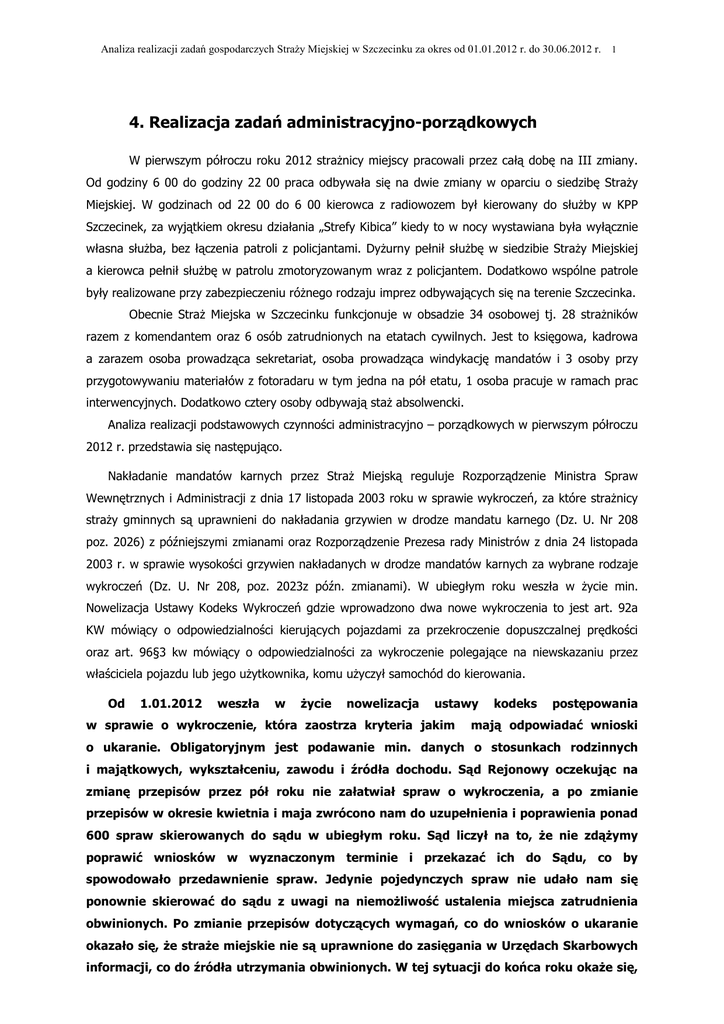 Analiza realizacji zadań gospodarczych StraŜy Miejskiej w Szczecinku za okres od 01.01.2012 r. do 30.06.2012 r. 1 4. Realizacja zadań administracyjno-porządkowych W pierwszym półroczu roku 2012 straŜnicy miejscy pracowali przez całą dobę na III zmiany. Od godziny 6 00 do godziny 22 00 praca odbywała się na dwie zmiany w oparciu o siedzibę StraŜy Miejskiej. W godzinach od 22 00 do 6 00 kierowca z radiowozem był kierowany do słuŜby w KPP Szczecinek, za wyjątkiem okresu działania „Strefy Kibica” kiedy to w nocy wystawiana była wyłącznie własna słuŜba, bez łączenia patroli z policjantami. DyŜurny pełnił słuŜbę w siedzibie StraŜy Miejskiej a kierowca pełnił słuŜbę w patrolu zmotoryzowanym wraz z policjantem. Dodatkowo wspólne patrole były realizowane przy zabezpieczeniu róŜnego rodzaju imprez odbywających się na terenie Szczecinka. Obecnie StraŜ Miejska w Szczecinku funkcjonuje w obsadzie 34 osobowej tj. 28 straŜników razem z komendantem oraz 6 osób zatrudnionych na etatach cywilnych. Jest to księgowa, kadrowa a zarazem osoba prowadząca sekretariat, osoba prowadząca windykację mandatów i 3 osoby przy przygotowywaniu materiałów z fotoradaru w tym jedna na pół etatu, 1 osoba pracuje w ramach prac interwencyjnych. Dodatkowo cztery osoby odbywają staŜ absolwencki. Analiza realizacji podstawowych czynności administracyjno – porządkowych w pierwszym półroczu 2012 r. przedstawia się następująco. Nakładanie mandatów karnych przez StraŜ Miejską reguluje Rozporządzenie Ministra Spraw Wewnętrznych i Administracji z dnia 17 listopada 2003 roku w sprawie wykroczeń, za które straŜnicy straŜy gminnych są uprawnieni do nakładania grzywien w drodze mandatu karnego (Dz. U. Nr 208 poz. 2026) z późniejszymi zmianami oraz Rozporządzenie Prezesa rady Ministrów z dnia 24 listopada 2003 r. w sprawie wysokości grzywien nakładanych w drodze mandatów karnych za wybrane rodzaje wykroczeń (Dz. U. Nr 208, poz. 2023z późn. zmianami). W ubiegłym roku weszła w Ŝycie min. Nowelizacja Ustawy Kodeks Wykroczeń gdzie wprowadzono dwa nowe wykroczenia to jest art. 92a KW mówiący o odpowiedzialności kierujących pojazdami za przekroczenie dopuszczalnej prędkości oraz art. 96§3 kw mówiący o odpowiedzialności za wykroczenie polegające na niewskazaniu przez właściciela pojazdu lub jego uŜytkownika, komu uŜyczył samochód do kierowania. Od 1.01.2012 weszła w Ŝycie nowelizacja ustawy w sprawie o wykroczenie, która zaostrza kryteria jakim kodeks postępowania mają odpowiadać wnioski o ukaranie. Obligatoryjnym jest podawanie min. danych o stosunkach rodzinnych i majątkowych, wykształceniu, zawodu i źródła dochodu. Sąd Rejonowy oczekując na zmianę przepisów przez pół roku nie załatwiał spraw o wykroczenia, a po zmianie przepisów w okresie kwietnia i maja zwrócono nam do uzupełnienia i poprawienia ponad 600 spraw skierowanych do sądu w ubiegłym roku. Sąd liczył na to, Ŝe nie zdąŜymy poprawić wniosków w wyznaczonym terminie i przekazać ich do Sądu, co by spowodowało przedawnienie spraw. Jedynie pojedynczych spraw nie udało nam się ponownie skierować do sądu z uwagi na niemoŜliwość ustalenia miejsca zatrudnienia obwinionych. Po zmianie przepisów dotyczących wymagań, co do wniosków o ukaranie okazało się, Ŝe straŜe miejskie nie są uprawnione do zasięgania w Urzędach Skarbowych informacji, co do źródła utrzymania obwinionych. W tej sytuacji do końca roku okaŜe się, Analiza realizacji zadań gospodarczych StraŜy Miejskiej w Szczecinku za okres od 01.01.2012 r. do 30.06.2012 r. 2 Ŝe nie będziemy mogli skierować do sądu kilkuset spraw. W pierwszym półroczu musieliśmy odstąpić od skierowania do sądu 98 spraw z uwagi na brak informacji o miejscu zatrudnienia lub odmowie udzielenia pomocy przez StraŜe Miejskie lub Policję. W okresie pierwszego półrocza 2012 r. straŜnicy miejscy ujawnili 12 060 wykroczeń, z tego w 4 058 przypadkach zastosowali pouczenia, w 6 436 przypadkach nałoŜono mandaty karne na kwotę 798 950 zł, w 1 532 przypadkach zostały skierowane wnioski o ukaranie do Sądu Rejonowego w Szczecinku II Wydział Karny a 34 sprawy zostały przekazane innym instytucjom. Tabela nr 5 Ilość wykroczeń w pierwszych półroczach lat 2010, 2011 i 2012 2010 2011 2012 Liczba ujawnionych wykroczeń 13 512 8 046 12 060 Pouczenia 5 268 4 409 4 058 Postępowanie mandatowe 6 151 2 498 6 436 MK na kwotę 769 400 299 450 798 950 Wnioski o ukaranie 2 093 1 141 1 532 Analiza realizacji zadań gospodarczych StraŜy Miejskiej w Szczecinku za okres od 01.01.2012 r. do 30.06.2012 r. 3 Tabela nr 6 EWIDENCJA WYNIKÓW DZIAŁAŃ STRAśY MIEJSKIEJ W SZCZECINKU W PIERWSZYM PÓŁROCZU ROKU 2012 L.p. 1. Rodzaje wykroczeń zawartych w: Kodeks wykroczeń Środki oddziaływani a wychowawcz ego (art. 41 k.w.) Mandaty Liczba Kwota Wnioski do sądu Sprawy przekaza ne innym organom Razem lub instytucjo m 3 087 6 091 767 650 1 526 18 10 722 876 18 2 300 176 6 1 076 a) Wykroczenia przeciwko porządkowi · i spokojowi publicznemu b) Wykroczenia przeciwko instytucjom państwowym, samorządowym i społecznym 2 1 500 - - 3 c) Wykroczenia przeciwko bezpieczeństwu osób i mienia 81 6 700 7 3 97 d) Wykroczenia przeciwko bezpieczeństwu i porządkowi w komunikacji 1125 5967 757 400 1286 - 8 378 e) Wykroczenia przeciwko osobie - - - - - - f) Wykroczenia przeciwko zdrowiu 5 - - - - 5 g) Wykroczenia przeciwko mieniu 12 - - 1 7 20 h) Wykroczenia przeciwko interesom konsumentów - - - - - - i) Wykroczenia przeciwko obyczajności publicznej 662 45 3 500 50 1 758 j) Wykroczenia przeciwko urządzeniom uŜytku publicznego 324 54 3 250 6 1 385 k) Szkodnictwo leśne, polne i ogrodowe - - - - - - 2. Przepisy wprowadzające kodeks pracy - - - - - - 690 233 21 250 - 2 925 199 92 7 000 5 - 296 81 20 3 050 - 13 114 3. 4. 5. Ustawa o wychowaniu w trzeźwości i przeciwdziałaniu alkoholizmowi Ustawa o ochronie zdrowia