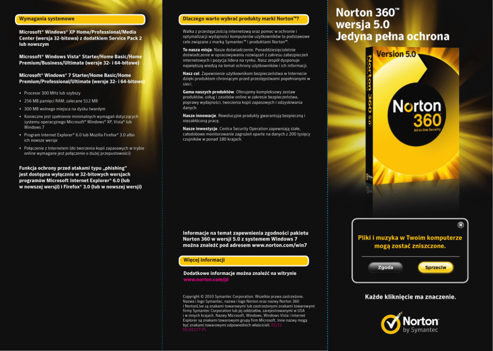 Wymagania systemowe Dlaczego warto wybrać produkty marki Norton™? Microsoft® Windows® XP Home/Professional/Media Center (wersja 32-bitowa) z dodatkiem Service Pack 2 lub nowszym Walka z przestępczością internetową oraz pomoc w ochronie i optymalizacji wydajności komputerów użytkowników to podstawowe cele związane z marką Symantec™ i produktami Norton™. Microsoft® Windows Vista® Starter/Home Basic/Home Premium/Business/Ultimate (wersje 32- i 64-bitowe) To nasza misja: Nasze doświadczenie. Ponaddziesięcioletnie doświadczenie w opracowywaniu rozwiązań z zakresu zabezpieczeń internetowych i pozycja lidera na rynku. Nasz zespół dysponuje największą wiedzą na temat ochrony użytkowników i ich informacji. Microsoft® Windows® 7 Starter/Home Basic/Home Premium/Professional/Ultimate (wersje 32- i 64-bitowe) Nasz cel. Zapewnienie użytkownikom bezpieczeństwa w Internecie dzięki produktom chroniącym przed przestępstwami popełnianymi w sieci. • Procesor 300 MHz lub szybszy Gama naszych produktów. Oferujemy kompleksowy zestaw produktów, usług i zasobów online w zakresie bezpieczeństwa, poprawy wydajności, tworzenia kopii zapasowych i odzyskiwania danych. • 256 MB pamięci RAM; zalecane 512 MB • 300 MB wolnego miejsca na dysku twardym • Konieczne jest spełnienie minimalnych wymagań dotyczących systemu operacyjnego Microsoft® Windows® XP, Vista® lub Windows 7 • Program Internet Explorer® 6.0 lub Mozilla Firefox® 3.0 albo ich nowsze wersje Norton 360™ wersja 5.0 Jedyna pełna ochrona Nasze innowacje. Rewolucyjne produkty gwarantują bezpieczną i niezakłóconą pracę. Nasze inwestycje. Centra Security Operation zapewniają stałe, całodobowe monitorowanie zagrożeń oparte na danych z 200 tysięcy czujników w ponad 180 krajach. • Połączenie z Internetem (do tworzenia kopii zapasowych w trybie online wymagane jest połączenie o dużej przepustowości) Funkcja ochrony przed atakami typu „phishing” jest dostępna wyłącznie w 32-bitowych wersjach programów Microsoft Internet Explorer® 6.0 (lub w nowszej wersji) i Firefox® 3.0 (lub w nowszej wersji) Informacje na temat zapewnienia zgodności pakietu Norton 360 w wersji 5.0 z systemem Windows 7 można znaleźć pod adresem www.norton.com/win7 Pliki i muzyka w Twoim komputerze mogą zostać zniszczone. Więcej informacji Dodatkowe informacje można znaleźć na witrynie www.norton.com/pl Copyright © 2010 Symantec Corporation. Wszelkie prawa zastrzeżone. Nazwa i logo Symantec, nazwa i logo Norton oraz nazwy Norton 360 i NortonLive są znakami towarowymi lub zastrzeżonymi znakami towarowymi firmy Symantec Corporation lub jej oddziałów, zarejestrowanymi w USA i w innych krajach. Nazwy Microsoft, Windows, Windows Vista i Internet Explorer są znakami towarowymi grupy firm Microsoft. Inne nazwy mogą być znakami towarowymi odpowiednich właścicieli. 01/11 DS-01177-PL Każde kliknięcie ma znaczenie. Program Norton 360™ zapewnia kompleksową, łatwą w obsłudze ochronę tożsamości, komputera i plików przed wszelkimi zagrożeniami. Dostępna w programie Norton 360 funkcja optymalizacji wydajności komputera poprawia ogólną sprawność systemu i pozwala utrzymać go w najlepszej kondycji. Automatyczne tworzenie kopii zapasowych lokalnie lub online zabezpiecza przed utratą ważnych plików i zdjęć. Co więcej, wyjątkowa technologia Insight blokuje nowe wirusy, a skaner treści społecznościowych (Social Media Scanner) ostrzega przed niebezpiecznymi witrynami i łączami w serwisie Facebook, dzięki czemu można udostępniać adresy stron www bez obaw o przekazanie lub odebranie zagrożeń. Zalety produktu Jedyna pełna ochrona Twojego komputera Bezpieczeństwo dzięki kompleksowej, łatwej w obsłudze ochronie przed wszelkimi zagrożeniami. Utrzymanie optymalnej wydajności komputera. Ochrona zdjęć, muzyki i innych ważnych plików przed utratą. Kompleksowe, wielowarstwowe technologie programu Norton 360 pozwalają skutecznie blokować najnowsze zagrożenia pochodzące z sieci! Dzięki temu komputer i zgromadzone w nim i cenne dane, takie jak zdjęcia i muzyka, będą bezpieczne. Pakiet Norton 360 oferuje również jest wiele innych przydatnych funkcji: Zapobieganie kradzieży tożsamości i pieniędzy przez przestępców internetowych podczas korzystania z sieci, robienia zakupów online i korzystania z bankowości internetowej. Kompleksowa, łatwa w obsłudze, szybka i wydajna ochrona zabezpiecza użytkowników przed działaniami przestępców internetowych, oraz innymi zagrożeniami z sieci. Ochrona przed zagrożeniami rozpowszechnianymi za pośrednictwem poczty e-mail, komunikatorów i pobieranych plików, atakami przestępców i oszustwami w Internecie. Technologia Insight pozwala natychmiast sprawdzać pochodzenie plików i czas ich istnienia, aby jak najszybciej wykrywać i powstrzymywać oprogramowanie typu „crimeware”. TYLKO W PROGRAMACH NORTON Ochrona dzieci przed zagrożeniami pochodzącymi z Internetu za pomocą funkcji zarządzania kontrolą rodzicielską. Optymalizacja wydajności komputera przyspiesza jego działanie i ułatwia utrzymanie odpowiedniej kondycji systemu. ULEPSZENIE Łatwe w obsłudze, automatyczne tworzenie kopii zapasowych umożliwia bezpieczną archiwizację rodzinnych zdjęć i filmów, pobranej muzyki, dokumentów finansowych i innych ważnych plików. Funkcja zarządzania kontrolą rodzicielską pozwala na monitorowanie działań dzieci w Internecie oraz ich ochronę przed zagrożeniami pochodzącymi z sieci. TYLKO W PROGRAMACH NORTON Najważniejsze technologie ULEPSZENIE TYLKO W PROGRAMACH NORTON Insight TYLKO W PROGRAMACH NORTON Zarządzanie kontrolą rodzicielską NOWOŚĆ MIEJSCE NA IKONY NAGRÓD Skaner treści społecznościowych Norton Safe Web TYLKO W PROGRAMACH NORTON / ULEPSZENIE MIEJSCE NA IKONY NAGRÓD Norton Identity Safe NOWOŚĆ Skaner treści społecznościowych Norton Safe Web umożliwia sprawdzanie bezpośredn