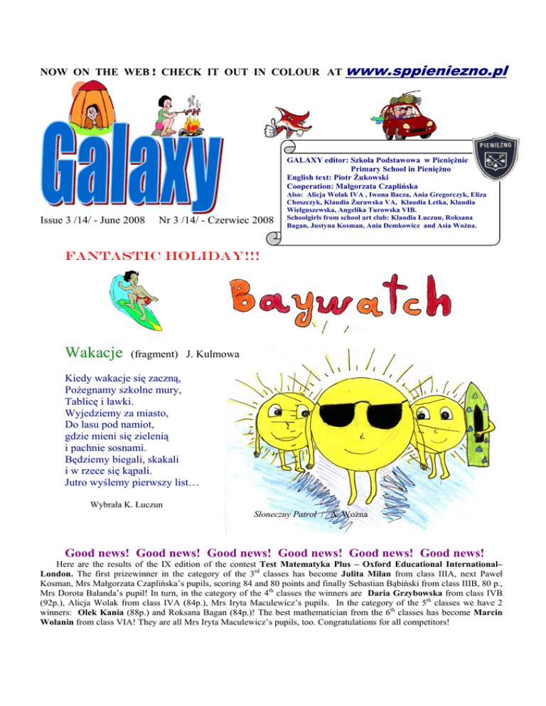 NOW ON THE WEB ! CHECK IT OUT IN COLOUR AT www.sppieniezno.pl GALAXY editor: Szkoła Podstawowa w Pieniężnie Primary School in Pieniężno English text: Piotr Żukowski Cooperation: Małgorzata Czaplińska Issue 3 /14/ - June 2008 Nr 3 /14/ - Czerwiec 2008 Also: Alicja Wolak IVA , Iwona Bacza, Ania Gregorczyk, Eliza Choszczyk, Klaudia Żurawska VA, Klaudia Letka, Klaudia Wielguszewska, Angelika Turowska VIB. Schoolgirls from school art club: Klaudia Łuczun, Roksana Bagan, Justyna Kosman, Ania Demkowicz and Asia Wożna. FANTASTIC HOLIDAY!!! Wakacje (fragment) J. Kulmowa Kiedy wakacje się zaczną, Pożegnamy szkolne mury, Tablicę i ławki. Wyjedziemy za miasto, Do lasu pod namiot, gdzie mieni się zielenią i pachnie sosnami. Będziemy biegali, skakali i w rzece się kąpali. Jutro wyślemy pierwszy list… Wybrała K. Łuczun Słoneczny Patrol / A. Wożna Good news! Good news! Good news! Good news! Good news! Good news! Here are the results of the IX edition of the contest Test Matematyka Plus – Oxford Educational International– London. The first prizewinner in the category of the 3rd classes has become Julita Milan from class IIIA, next Paweł Kosman, Mrs Małgorzata Czaplińska’s pupils, scoring 84 and 80 points and finally Sebastian Bąbiński from class IIIB, 80 p., Mrs Dorota Bałanda’s pupil! In turn, in the category of the 4th classes the winners are Daria Grzybowska from class IVB (92p.), Alicja Wolak from class IVA (84p.), Mrs Iryta Maculewicz’s pupils. In the category of the 5th classes we have 2 winners: Olek Kania (88p.) and Roksana Bagan (84p.)! The best mathematician from the 6th classes has become Marcin Wolanin from class VIA! They are all Mrs Iryta Maculewicz’s pupils, too. Congratulations for all competitors! BEZPIECZNIE W CZASIE WAKACJI Bezpiecznie w mieście Brak pieniędzy i pomysłu często powoduje, że wiele dzieci spędza wakacje w mieście. Ale pamiętajmy, że w mieście należy zachować szczególną ostrożność. 1. Nie wbiegać nagle na jezdnię. Ulica jest niebezpiecznym miejscem dla dzieci. 2. Podróżując samochodem rodzice powinni umieścić dzieci w specjalnych fotelikach. 3. Nie przebywać na dworze o późnej porze. 4. Uważać na bezpańskie psy, bo mogą cię zaatakować. 5. Jeździć rowerem po ścieżkach rowerowych, a jeśli ich nie ma, to po chodnikach, ale nie przeszkadzając innym. 6. Korzystać z różnych rozrywek i zajęć w świetlicach, zamiast bezinteresownie spędzać czas w nieodpowiednich miejscach. Bezpiecznie w górach i nad wodą 1. Nigdy nie wychodź w góry sam, bo gdybyś potrzebował pomocy, druga osoba Ci jej nie udzieli. 2. Nigdy nie zbaczaj ze szlaku, bo możesz zabłądzić. 3. Kup odpowiedni sprzęt i odzież. 4. Zawsze informuj innych, dokąd idziesz, bo gdyby cos się stało, będą wiedzieć, gdzie szukać. 5. W wodzie nie oddalaj się od brzegu. 6. Nie pływaj po posiłku. 7. Pływaj w dozwolonych miejscach. 8. Gdy zauważysz, jak ktoś się topi, zaalarmuj o tym kogoś dorosłego. 9. Nie wchodź do wody po długim przebywaniu na słońcu. 10. Nie skacz do wody na główkę. 11. Nie pływaj po wypiciu alkoholu. 12. Nie skacz do wody, jeśli nie znasz jej głębokości. Bezpiecznie na wsi 1. 2. 3. Nie podchodż do pracujących maszyn rolniczych. Omijaj odkryte studnie, podmokłe tereny i rowy. Rozpalaj ognisko tylko w obecności dorosłych. Jeśli będziesz przestrzegać przedstawionych zasad, twoje wakacje będą zawsze wyjątkowym i miłym wspomnieniem! 2 Camping / Biwak Our pupils from class III A went camping to Ściborki – The Native American village near Banie Mazurskie, 11-12.06.2008, form tutors Małgorzata Czaplińska and Jadwiga Pilucik (for more see at www.sppieniezno.pl / Galeria-photos / Archiwum/Aktualności - text). Can I shoot? Only don’t hit the barn!!! A bonfire in the evening Kinga Kołacka and Running Wolf shoot – strzelić / hit the barn – trafić w stodołę / Running Wolf - Biegnący Wilk / bonfire - ognisko ::::::::::::::::::::::::::::::::::::::::::::::::::::::::::::::::::::::::::::::::::::: The Loch Ness Monster / Potwór z Loch Ness For years and years people have been talking about a monster or a whole herd of monsters living in Loch Ness. At first only local people talked about it, but then, in 1933, a road was built around Loch Ness and more and more people began to come there. Everybody wanted to see the monster and Loch Ness became one of the most important tourist centres in Scotland. Loch Ness is in Inverness county in the north of Scotland. It is 2.5 miles long and only one mile wide. In some places it is more than 700 feet deep. Some people think that prehistoric animals swam into the bay (which is now the loch) in those days. Then the land slowly formed a block between the bay and the open sea and the animals could not get out of the Loch. The water in Loch Ness is very dark in colour, and this makes it very difficult to see if there is anything in the loch and what it is. In 1962 the Loch Ness Investigation Bureau began to examine the question of the monster very seriously. They wanted an answer to the question which everyone was asking: Is there a herd of prehistoric animals in the loch which has been there for thousands of years? Some people say that the monster lives in a cave under the water. Others say that the monster is a seal. But seals are friendly animals and the Loch Ness Monster does not like meeting people. Glossary: the Loch Ness monster mystery — tajemnica potwora z Loch Ness / loch -/ lake – jezioro / herd — stado / a road was built — zbudowano drogę / the land slowly formed a block between . . . — ziemia powoli zabloko-wała przejście pomiędzy . . . / Many thousands of years ago Loch Ness was joined to the sea – Wiele tysięcy lat temu Loch Ness było połączone z morzem / swam into the bay pływały w zatoce / this makes it difficult to see — to utrudnia zobaczenie / The Loch Ness Investigation Bureau began to examine the 