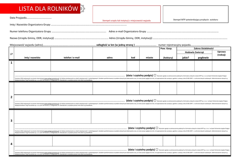LISTA DLA ROLNIKÓW Data Przyjazdu………………………………… Stempel MTP potwierdzający przybycie autokaru Stempel urzędu lub instytucji z miejscowości wyjazdu Imię i Nazwisko Organizatora Grupy ………………………………………………………………………………………………………. Numer telefonu Organizatora Grupy ……………………………….…………….……………….…………. Adres e-mail Organizatora Grupy ……………………………………………….………………………………………………… Nazwa (Urzędu Gminy, ODR, instytucji) ………………………………………………………………………… Adres (Urzędu Gminy, ODR, instytucji) …………………………………………………………………………………………………….. Miejscowość wyjazdu (adres)…………………………………..………………………..………… odległość w km (w jedną stronę ) …………….....……...... numer rejestracyjny pojazdu……………………………………… Pow. Gosp. LP imię i nazwisko telefon i e-mail adres kod miasto (hektary) Zakres Działalności Hodowla Zwierząt jakie? Uprawa (rodzaj) pogłowie 1 ……………………………………………………………………………………………………………………………………………….…….. (data i czytelny podpis) □ Wyrażam zgodę na zamieszczenie podanych w formularzu danych w bazie MTP sp. z o.o.w bazie Partnerów targów Polagra Premiery 2016 wskazanych na stronie internetowej www.polagra-premiery.pl i ich dalsze przetwarzanie w celach statystycznych i marketingowych. Zostałem poinformowany że podanie danych jest dobrowolne oraz, że mam prawo wglądu do nich, ich poprawiania lub usunięcia, zgodnie z ustawą z dnia 29.08.1997 r. o ochronie danych osobowych. Administratorem danych są Międzynarodowe Targi Poznańskie sp. z o.o.,60-734 Poznań, ul. Głogowska 14. Oświadczam, że podane przeze mnie dane są prawidłowe. 2 ……………………………………………………………………………………………………………………………………………….…….. (data i czytelny podpis) □ Wyrażam zgodę na zamieszczenie podanych w formularzu danych w bazie MTP sp. z o.o. i w bazie Partnerów targów Polagra Premiery 2016 wskazanych na stronie internetowej www.polagra-premiery.pl i ich dalsze przetwarzanie w celach statystycznych i marketingowych. Zostałem poinformowany że podanie danych jest dobrowolne oraz, że mam prawo wglądu do nich, ich poprawiania lub usunięcia, zgodnie z ustawą z dnia 29.08.1997 r. o ochronie danych osobowych. Administratorem danych są Międzynarodowe Targi Poznańskie sp. z o.o.,60-734 Poznań, ul. Głogowska 14. Oświadczam, że podane przeze mnie dane są prawidłowe. 3 ………………………………………………………………………………………………………………………………………………….…….. (data i czytelny podpis) □ Wyrażam zgodę na zamieszczenie podanych w formularzu danych w bazie MTP sp. z o.o. i w bazie Partnerów targów Polagra Premiery 2016 wskazanych na stronie internetowej www.polagra-premiery.pl i ich dalsze przetwarzanie w celach statystycznych i marketingowych. Zostałem poinformowany że podanie danych jest dobrowolne oraz, że mam prawo wglądu do nich, ich poprawiania lub usunięcia, zgodnie z ustawą z dnia 29.08.1997 r. o ochronie danych osobowych. Administratorem danych są Międzynarodowe Targi Poznańskie sp. z o.o.,60-734 Poznań, ul. Głogowska 14. Oświadczam, że podane przeze mnie dane są prawidłowe. 4 ………………………………………………………………………………………………………………………………………………….…….. (data i czytelny podpis) □ Wyrażam zgodę na zamieszczenie podanych w formularzu danych w bazie MTP sp. z o.o. i w bazie Partnerów targów Polagra Premiery 2016 wskazanych na stronie internetowej www.polagra-premiery.pl i ich dalsze przetwarzanie w celach statystycznych i marketingowych. Zostałem poinformowany że podanie danych jest dobrowolne oraz, że mam prawo wglądu do nich, ich poprawiania lub usunięcia, zgodnie z ustawą z dnia 29.08.1997 r. o ochronie danych osobowych. Administratorem danych są Międzynarodowe Targi Poznańskie sp. z o.o.,60-734 Poznań, ul. Głogowska 14. Oświadczam, że podane przeze mnie dane są prawidłowe. Pow. Gosp. LP imię i nazwisko telefon i e-mail adres kod (hektary) miasto Zakres Działalności Hodowla Zwierząt Uprawa (rodzaj) jakie? pogłowie 5 ………………………………………………………………………………………………………………………………………………….…….. (data i czytelny podpis) □ Wyrażam zgodę na zamieszczenie podanych w formularzu danych w bazie MTP sp. z o.o. i w bazie Partnerów targów Polagra Premiery 2016 wskazanych na stronie internetowej www.polagra-premiery.pl i ich dalsze przetwarzanie w celach statystycznych i marketingowych. Zostałem poinformowany że podanie danych jest dobrowolne oraz, że mam prawo wglądu do nich, ich poprawiania lub usunięcia, zgodnie z ustawą z dnia 29.08.1997 r. o ochronie danych osobowych. Administratorem danych są Międzynarodowe Targi Poznańskie sp. z o.o.,60-734 Poznań, ul. Głogowska 14. Oświadczam, że podane przeze mnie dane są prawidłowe. 6 ………………………………………………………………………………………………………………………………………………….…….. (data i czytelny podpis) □ Wyrażam zgodę na zamieszczenie podanych w formularzu danych w bazie MTP sp. z o.o. i w bazie Partnerów targów Polagra Premiery 2016 wskazanych na stronie internetowej www.polagra-premiery.pl i ich dalsze przetwarzani