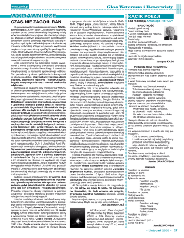 www.gwir.pl G³os Weterana i Rezerwisty wydawnicze CZAS NIE ZAGOIŁ RAN Długo oczekiwałem na ukazanie się książki Alfa Soczyńskiego pt. „Krew i ogień”. Jej obszerne fragmenty czytałem przed ponad dwoma laty i wydawały mi się wówczas nie tylko fascynujące, ale również porażające. Dlatego z pełnym zrozumieniem potraktowałem życzeniem autora, publikacja jego książki stała się integralną częścią obchodów kolejnej rocznicy haniebnej masakry wołyńskiej. Z tego też powodu wystosował on pismo do przewodniczącego Ogólnopolskiego Komitetu Obchodów 65. Rocznicy Mordu Wołyńskiego. Ale, jak to często z politykami bywa, przewodniczący nabrał przysłowiowej wody do ust ustanie zareagował na w pełni uzasadnioną propozycję. Czas oczekiwania na publikację książki wywoływał u mnie autentyczną ciekawość dotyczącą jej ostatecznego kształtu literackiego i zawartości merytorycznej, a następnie społecznego odbioru. Ten ponadroczny okres opóźnienia druku wyszedł jej chyba na dobre, otrzymaliśmy bowiem dzieło dojrzałe, poprawne logicznie i konstrukcyjnie, bogate merytorycznie oraz niemal znakomite edytorsko. Jej treścią są tragiczne losy Polaków na Wołyniu w okresie poprzedzającym bezpośrednio II wojnę światową oraz w czasie jej trwania, mieszkających w bezpośrednim sąsiedztwie z ludnością ukraińską niekiedy zaprzyjaźnioną lub nawet powiązaną rodzinnie. Bohaterem książki jest zniewolona, upokorzona i upodlona ludność polska oraz jej oprawcy, przedstawiciele Organizacji Ukraińskich Nacjonalistów. Ale nie była to bratobójcza walka, jak niekiedy próbuje się uzasadnić te okrutne zbrodnie, gdyż przed wojną Polacy stanowili zaledwie około dziesięciu procent ludności Wołynia, a w czasie wojny proporcje były jeszcze mniej korzystne z racji wyniszczenia polskiej inteligencji zarówno: przez Niemców, jak i przez Rosjan. Ze strony polskiej była to więc tylko próba przetrwania. Opis losów tej ludności jest szczególny, niezwykle dokładny i obrazowy, pozwalając czytelnikowi widzieć, czuć i przeżywać tę gehennę. Również wyjątkowo dokładnie autor nakreślił sylwetki bohaterów negatywnych, czyli reprezentantów OUN i Ukraińskiej Armii Powstańczej i to nie tylko ich wygląd, ale i osobowość. Są to niemal po mistrzowsku wykonane portrety psychologiczne młodych, zdegenerowanych, ambitnych, żądnych krwi i odwetu oprawców i rzezimieszków. Są to postacie tak porażające, a ich działania tak okrutne, że wydawać się mogą nawet nieprawdopodobne. Jakże tragicznie na tym tle wygląda miłość Polaka i Ukrainki oraz przyjaźń Polaka i Ukraińca które pod wpływem zbrodniczej banderowskiej ideologii zmieniają się w nienawiść rodzącą śmierć. Zadanie stojące przed autorem, by wiernie i bez szkody dla żadnej nacji przedstawić te wydarzenia, było niezwykle trudne. Ale sprostał on temu zadaniu, gdyż jako kilkuletnie dziecko był przez dwa lata ich świadkiem i współuczestnikiem. Ponadto tragiczne obrazy zapisane w pamięci uzupełniał dostępną literaturą przede wszystkim relacjami uczestników tej tragedii. Książka została podzielona na kilkadziesiąt zatytułowanych opowieści uszeregowanych w prolog i pięć części obrazujących kolejne etapy losu Polaków na Wołyniu. Część pierwsza „Ostatnie lato w raju” opisuje tę porę roku na wołyńskiej wsi. W części drugiej „Chleb przez radio” autor przedstawił sceny z wkroczenia Rosjan na tereny wschodnie po 17 września 1939 roku. Część trzecia „Krzyżackie obyczaje” to opis wkroczenia Niemców w czerwcu 1941 roku. Część czwarta, chyba najważniejsza w strukturze dzieła, „Krew i ogień” to krwawe obrazy kĄcik poezji z apogeum zbrodni ludobójstwa w latach 19431944. Część piąta „Złota kaczka”, której fabuła stanowi jakby epilog książki, pokazuje wiele interesujących miejsc Wrocławia i Wołynia. Rozgrywa się w czasach współczesnych. Powierzchowna lektura książki może nieuważnemu czytelnikowi sugerować, że zawiera ona niezależne od siebie opowiadania uporządkowane według jakiegoś przypadkowego zamysłu autora. Nic bardziej mylnego. Wnikliwa analiza jej treści, a rzeczywiście zmusza one do ogromnego wysiłku intelektualnego, pozwala dostrzec, że te pozornie nieuporządkowane i niezależne od siebie puzzle układają się w logiczną całość, wielowątkową fabułę, zawierającą bogaty materiał zdarzeniowy, obyczajowy i psychologiczny z wyrazistą ideową koncepcją twórcy, a więc wyborem, hierarchizacją i wartościowaniem opisywanej rzeczywistości oraz założeniami filozoficznymi, moralistycznymi i historiozoficznymi. Wszystkie te czynniki spełniają założenia stendhalowskiej definicji powieści, określającej ją jako „zwierciadło przechadzające się po gościńcu”. Gościńcem jest Wołyń okresu wojny i okupacji, zwierciadłem tragiczne losy Flaków tam mieszkających. Szczególną rolę w tej powieści odważę się nazwać najnowszą książkę Alfa Soczyńskiego, odgrywają listy, które napisał do swego przyjaciela, młodego ukraińskiego poety i pisarza urodzonego i mieszkającego na Wołyniu, Sergija Siniuka. W pierwszym z nich, będącym częścią prologu książki, autor niejako usprawiedliwia się przed swoim przyjacielem, że musiał napisać tę książkę, gdyż tylko ujawnienie prawdy o wspólnej, czasami tragicznej przeszłość, nie pozwoli na powtórkę tego „zła”. W drugim liście wspomina o miejscowości Hurby, którą Sergij opisał jako miejsce śmierci bohaterskich wojaków UPA w 1944 roku. Powstało tam mauzoleum poświęcone ich pamięci. Natomiast miejscowość tę przedstawił A. Soczyński miejsce, w którym, w czerwcu 1943 roku ci sami banderowcy spalili polską wioskę i niemal całkowicie wymordowali jej mieszkańców. „Ty mi mówisz o innych Hurbach niż te, o których ja piszę, chociaż jest to ta sama miejscowo