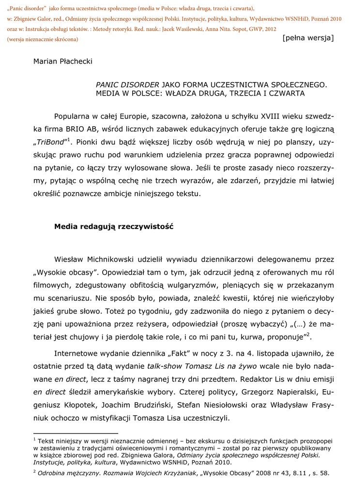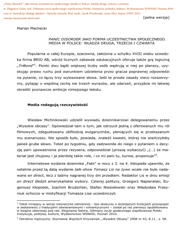 „Panic disorder” jako forma uczestnictwa społecznego (media w Polsce: władza druga, trzecia i czwarta), w: Zbigniew Galor, red., Odmiany życia społecznego współczesnej Polski. Instytucje, polityka, kultura, Wydawnictwo WSNHiD, Poznań 2010 oraz w: Instrukcja obsługi tekstów. : Metody retoryki. Red. nauk.: Jacek Wasilewski, Anna Nita. Sopot, GWP, 2012 [pełna wersja] (wersja nieznacznie skrócona) Marian Płachecki PANIC DISORDER JAKO FORMA UCZESTNICTWA SPOŁECZNEGO. MEDIA W POLSCE: WŁADZA DRUGA, TRZECIA I CZWARTA Popularna w całej Europie, szacowna, założona u schyłku XVIII wieku szwedzka firma BRIO AB, wśród licznych zabawek edukacyjnych oferuje także grę logiczną „TriBond”1. Pionki dwu bądź większej liczby osób wędrują w niej po planszy, uzyskując prawo ruchu pod warunkiem udzielenia przez gracza poprawnej odpowiedzi na pytanie, co łączy trzy wylosowane słowa. Jeśli te proste zasady nieco rozszerzymy, pytając o wspólną cechę nie trzech wyrazów, ale zdarzeń, przyjdzie mi łatwiej określić poznawcze ambicje niniejszego tekstu. Media redagują rzeczywistość Wiesław Michnikowski udzielił wywiadu dziennikarzowi delegowanemu przez „Wysokie obcasy”. Opowiedział tam o tym, jak odrzucił jedną z oferowanych mu ról filmowych, zdegustowany obfitością wulgaryzmów, pleniących się w przekazanym mu scenariuszu. Nie sposób było, powiada, znaleźć kwestii, której nie wieńczyłoby jakieś grube słowo. Toteż po tygodniu, gdy zadzwoniła do niego z pytaniem o decyzję pani upoważniona przez reżysera, odpowiedział (proszę wybaczyć) „(…) że materiał jest chujowy i ja pierdolę takie role, i co mi pani tu, kurwa, proponuje”2. Internetowe wydanie dziennika „Fakt” w nocy z 3. na 4. listopada ujawniło, że ostatnie przed tą datą wydanie talk-show Tomasz Lis na Ŝywo wcale nie było nadawane en direct, lecz z taśmy nagranej trzy dni przedtem. Redaktor Lis w dniu emisji en direct śledził amerykańskie wybory. Czterej politycy, Grzegorz Napieralski, Eugeniusz Kłopotek, Joachim Brudziński, Stefan Niesiołowski oraz Władysław Frasyniuk ochoczo w mistyfikacji Tomasza Lisa uczestniczyli. 1 Tekst niniejszy w wersji nieznacznie odmiennej – bez ekskursu o dzisiejszych funkcjach prozopopei w zestawieniu z tradycjami oświeceniowymi i romantycznymi – został po raz pierwszy opublikowany w książce zbiorowej pod red. Zbigniewa Galora, Odmiany Ŝycia społecznego współczesnej Polski. Instytucje, polityka, kultura, Wydawnictwo WSNHiD, Poznań 2010. 2 Odrobina męŜczyzny. Rozmawia Wojciech KrzyŜaniak, „Wysokie Obcasy” 2008 nr 43, 8.11 , s. 58. 2 Niecałe dwa tygodnie przedtem, bo 22 października „Fakt” w edycji kioskarskiej drukował zdjęcie mężczyzny skutego kajdankami, chowającego głowę głęboko w zielonej kurtce. Zdjęcie od tekstu ciągłego oddziela fotografia noża, powiększona do rozmiaru przekraczającego wzrost mężczyzny. Na klindze ulokowano krótką, rzeczową informację: „Wiesław P. najpierw okładał matkę młotkiem, a potem ugodził ją tym nożem.” Tytuł zaś całego artykułu brzmi Halo, policja? Zabiłem matkę. [Fkt1022_3] Moje uwagi, jak zapowiedziałem, będą zmierzały do wskazania powiązań między tymi trzema wydarzeniami. A mówiąc „wydarzenia” mam na myśli tyleż to, co rzeczywiście się stało w przeszłości dalszej i bliższej, ile współczesne relacje, lokujące owe fakty w bieżącym kontekście wypowiedzi oraz sytuacji mówienia. Na co dzień obracamy się bowiem, jeśli pominąć awantury domowe i inne kataklizmy, w których kładziemy na szalę własne życie, pośród zdarzeń poddanych redakcji werbalnej, przeważnie zaś technologicznie i pod każdym innym względem rozbudowanej, profesjonalnej redakcji medialnej. Kiedy trafi nam się, z rzadka, osobiście uczestniczyć w jakichś wydarzeniach publicznych, to i tak naszą rozproszoną uwagę porządkują gotowe kadry percepcji, niosąc ze sobą poczucie, że uczestniczymy właściwie nie w samym, dajmy na to, święcie państwowym, lecz w telewizyjnej, radiowej, prasowej relacji z miejsca zdarzeń. Podniosła okazja przeminie i rozmyje się w pamięci, zarejestrowane sprawozdanie medialne – zostanie w bibliotekach czy archiwach. Kiedy tytuł chwyta Układanie tytułów prasowych jest prawdziwą sztuką, sztuką ważną, bogatą i trudną. Tytuł spełnia elementarne funkcje nawigacyjne. Ułatwia szybkie zorientowanie się w zawartości całego, nieraz grubego wydania. Jest też swego rodzajem hasłem indeksowym czy też tagiem, ułatwiającym czytelnikowi najpierw preselekcję materiałów dziennikarskich, potem zaś szybki i nieomylny powrót do pozycji uprzednio czy kiedy indziej wybranych. Przede wszystkim jednak tytuł wielorako definiuje najbliższy kontekst znaczący lektury, umożliwiający poprawne, tj. zgodne z intencjami autora i jego redakcji (bądź odwrotnie) zrozumienie samego tekstu. Rozstawianie owego tła, eksponującego pożądane, tłumiącego opaczne konotacje 3 tekstu, przebiega w raczej małej części jawnie. Z reguły o wiele ważniejsze, bo skuteczniejsze, okazują się operacje językowe przeprowadzane pod przykrywką, poniżej progu świadomości odbiorcy. [Fkt081305] 13 sierpnia w „Fakcie” tytuł cover story brzmiał, jak następuje: Prezydent Kaczyński: dominacji Rosji mówimy nie. Dobrze powiedziane. Kwestia inna czy powiedziane, czy tylko napisane i wydrukowane. Do tego pytania wrócę za chwilę. Jeśli na moment zapomnimy o znaczeniu wyrazów, a wsłuchamy się w ich brzmienie, to po dwukropku usłyszymy następstwo sylab akcentowanych i nieakcentowanych: dominacji Rosji mówimy nie Jeśli zaś odsłonięty w ten sposób rytm mowy podkreślimy samym zapisem, otrzymamy trzy wersy o jednolitym wzorcu rytmicznym, potem zaś dwa o wzorcu odwróconym: DOMI NACJI ROSJI MÓWI MYNIE Odwołując się do zapomnianego żargonu wersologii, powiedziałoby się, że po czterech