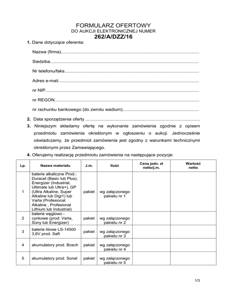 FORMULARZ OFERTOWY DO AUKCJI ELEKTRONICZNEJ NUMER 262/A/DZZ/16 1. Dane dotyczące oferenta: Nazwa (firma)............................................................................................................. Siedziba..................................................................................................................... Nr telefonu/faks.......................................................................................................... Adres e-mail............................................................................................................... nr NIP......................................................................................................................... nr REGON.................................................................................................................. nr rachunku bankowego (do zwrotu wadium)............................................................ 2. Data sporządzenia oferty .......................................................................................... 3. Niniejszym składamy ofertę na wykonanie zamówienia zgodnie z opisem przedmiotu zamówienia określonym w ogłoszeniu o aukcji. Jednocześnie oświadczamy, że przedmiot zamówienia jest zgodny z warunkami technicznymi określonymi przez Zamawiającego. 4. Oferujemy realizację przedmiotu zamówienia na następujące pozycje: Lp. 1 2 Nazwa materiału baterie alkaliczne Prod.: Duracel (Basic lub Plus), Energizer (Industrial, Ultimate lub Ultra+), GP (Ultra Alkaline, Super Alkaline lub Digi1) lub Varta (Profesional Alkaline , Profesional Lithium lub Industrial) baterie węglowo cynkowe (prod: Varta, Sony lub Energizer) J.m. Ilość pakiet wg załączonego pakietu nr 1 pakiet wg załączonego pakietu nr 2 3 baterie litowe LS-14500 3,6V prod. Saft pakiet wg załączonego pakietu nr 3 4 akumulatory prod. Bosch pakiet wg załączonego pakietu nr 4 5 akumulatory prod. Sonel pakiet wg załączonego pakietu nr 5 Cena jedn. zł netto/j.m. Wartość netto 1/3 Lp. Nazwa materiału J.m. Ilość wg załączonego pakietu nr 6 6 akumulatory prod. Hybryd pakiet 7 baterie 3V typ CR (prod. Energizer,GP, Maxell, Panasonic, Duracell lub Varta) pakiet 8 akumulatory Nord Star prod. ZAP pakiet wg załączonego pakietu nr 8 9 akumulatory Truck Evolution prod. ZAP pakiet wg załączonego pakietu nr 9 10 akumulator 12V 55Ah prod. Amper Max szt. 3 11 akumulator 12V 74Ah prod. Oberon szt. 2 12 akumulator RNN4008BR (do Motoroli GP900) szt. 10 13 akumulator 6V 165Ah prod. Amper Max szt. 4 szt. 1 szt. 25 szt. 23 szt. 1 szt. 2 14 15 16 17 18 akumulator blokowy z szybkim zamykaniem Makita 1222 akumulator 12V 5Ah do UPS wym. 90x70x107 prod. MW Power akumulator 12V, 7Ah (do UPS) typ BP 7-12; prod. Alarmtec akumulator BUK 12V (do urządzenia ECHO prod. Carbonex) akumulator 12V 18Ah typ AGM SBL 18-12i prod. SSB Cena jedn. zł netto/j.m. Wartość netto wg załączonego pakietu nr 7 19 akumulator 12V 125Ah prod. Jenox szt. 5 20 akumulator do zapalarek TZ-50 szt. 35 21 akumulator 1,2V/1000 mAh R03/AAA prod. Europower szt. 70 22 akumulator AAA R3 1100 mAh prod. Mint szt. 53 23 akumulator AA R6 2500mAh prod. MartMedia szt. 127 2/3 Lp. 24 25 Nazwa materiału akumulator Ni-MH AA/R6 1,2V 2700series prod. GP akumulator Ni-MH AA 1,2V 2800 mAh prod. Forever J.m. Ilość szt. 180 szt. 22 26 akumulator żelowy 12V 7,2Ah prod. MW Power szt. 20 27 akumulator 6F22 9V 200mAh prod. Acumax szt. 20 28 akumulator 12V 88Ah 640A prod. Agtech szt. 2 29 akumulator 12V 12Ah prod. MeanWell szt. 28 30 akumulator 12V 14Ah prod. Akuell szt. 1 31 akumulator 12V 17Ah prod. Power Max szt. 11 32 bateria Li-Ion DC 3,7V 5600mAh (do kontrolera FC-236/FC-336 Topcon) szt. 1 33 bateria BAKS typu ECHO/AK-P-B szt. 3 34 bateria BZI 07/12 sygnalizatora ZITG szt. 10 35 źródło zasilania IZA07/12-2 szt. 10 36 akumulator bezobsługowy 12V 7,2Ah typ AGM, EP 7,212 prod. Europower szt. Cena jedn. zł netto/j.m. Wartość netto 1 Razem wartość: 5. Niniejszym udzielamy …………. miesięcy gwarancji jakości oferowanych materiałów. ………………………………… Miejscowość, data …………………………… Podpis upoważnionej osoby 3/3