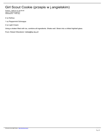 Girl Scout Cookie (przepis w j.angielskim) Dodano: 2000-01-01 00:00:00 Język: English/Angielski Odwiedzono: 1158 razy. 2 oz Kahlua 1 oz Peppermint Schnapps 2 oz Light Cream Using a shaker filled with ice, combine all ingredients. Shake well. Strain into a chilled highball glass. From: Robert Wierzbicki <[email protected]> Wirtualna Kuchni@ Polska - http://kuchnia.now.pl przepis nr 3849, plik wygenerowano 2017.03.02 18:28 1z1