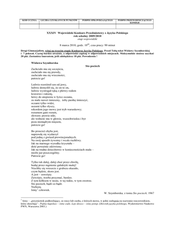 KOD UCZNIA LICZBA UZYSKANYCH PUNKTÓW PODPIS SPRAWDZAJĄCEGO PODPIS PRZEWODNICZĄCEGO KOMISJI XXXIV Wojewódzki Konkurs Przedmiotowy z Języka Polskiego rok szkolny 2009/2010 etap wojewódzki 8 marca 2010, godz. 1000, czas pracy: 90 minut Drogi Gimnazjalisto, witaj na trzecim etapie Konkursu Języka Polskiego. Przed Tobą tekst Wisławy Szymborskiej i 7 poleceń. Czytaj bardzo uważnie, a odpowiedzi zapisuj w odpowiednich miejscach. Maksymalnie możesz uzyskać 20 pkt. Zostaniesz laureatem, jeśli zdobędziesz 18 pkt. Powodzenia ! Wisława Szymborska Sto pociech Zachciało mu się szczęścia, zachciało mu się prawdy, zachciało mu się wieczności, patrzcie go! Ledwie rozróżnił sen od jawy, ledwie domyślił się, że on to on, ledwie wystrugał ręką z płetwy rodem krzesiwo i rakietę, łatwy do utopienia w łyżce oceanu, za mało nawet śmieszny, żeby pustkę śmieszyć, oczami tylko widzi, uszami tylko słyszy, rekordem jego mowy jest tryb warunkowy; rozumem gani rozum, słowem: prawie nikt, ale wolność mu w głowie, wszechwiedza i byt poza niemądrym mięsem, patrzcie go! Bo przecież chyba jest, naprawdę się wydarzył pod jedną z gwiazd prowincjonalnych. Na swój sposób żywotny i wcale ruchliwy. Jak na marnego wyrodka kryształu – dość poważnie zdziwiony. Jak na trudne dzieciństwo w koniecznościach stada – nieźle już poszczególny. Patrzcie go! Tylko tak dalej, dalej choć przez chwilę, bodaj przez mgnienie galaktyki małej! Niechby się wreszcie z grubsza okazało, czym będzie, skoro jest. A jest – zawzięty. Zawzięty, trzeba przyznać, bardzo. Z tym kółkiem w nosie, w tej todze, w tym swetrze. Sto pociech, bądź co bądź. Niebożę. Istny1 człowiek. W. Szymborska, z tomu Sto pociech, 1967 1 Istny – „przymiotnik podkreślający, ze rzecz lub osoba, o których mowa, w pełni zasługują na nazwanie rzeczownikiem, który określają”: Piękny kapelusz – istne cudo. Leje deszcz – istny potop. (Słownik języka polskiego, Wydawnictwo Naukowe PWN, Warszawa 2003.) 1. Wisława Szymborska w wierszu zastosowała słownictwo, które jest charakterystyczne dla dwu stylów językowych. a) Nazwij te style języka i wypisz z utworu po trzy ilustrujące je przykłady. 0 – 2 pkt Nazwa stylu Słownictwo z wiersza – trzy przykłady do każdego stylu b) Określ, jaką funkcję pełni to słownictwo w utworze. 0 – 1 pkt ………………………………………………………………………………………. ………………………………………………………………………………………. 2. Jakie cechy ma bohater wiersza jako istota biologiczna i jako twórca kultury? Podaj po trzy cechy. Następnie napisz, czemu służy w wierszu ukazanie tych cech. 0 – 3 pkt Istota biologiczna Twórca kultury ………………………. ……………………… ……………………. …………………………. …………………………. …………………………. …………………………………………………………………………………….. ……………………………………………………………………………………… 3. Objaśnij metaforę: „wystrugał ręką z płetwy rodem / krzesiwo i rakietę”. 0 – 1 pkt ………………………………………………………………………………………… ………………………………………………………………………………………… 4. Określ, jaką funkcję pełnią w wierszu: a) anafory w 1. i 2. części wiersza, 0 – 2 pkt ………………………………………………………………………………. ………………………………………………………………………………… b) wykrzyknienie w 1., 2. i 3. części wiersza. ………………………………………………………………………………… 5. Jaki jest stosunek osoby mówiącej do bohatera wiersza? 0 – 1 pkt ……………………………………………………………………………………….. 6. Jaka jest wymowa tego wiersza – optymistyczna czy pesymistyczna? Zajmij stanowisko w tej sprawie i uzasadnij je. 0 – 2 pkt ………………………………………………………………………………………….. …………………………………………………………………………………………. 7. Objaśnij w krótkiej wypowiedzi, jaki, według Ciebie, jest „istny człowiek”. 0 – 8 pkt Model odpowiedzi: Np. 1. a) Przykładowe odpowiedzi Nazwa stylu Słownictwo z wiersza – trzy przykłady do każdego stylu potoczny Np.: zachciało się, patrzcie, ledwie, wystrugał, utopienia, niemądrym, mgnienie, wyrodka, zawzięty Np.: szczęścia, prawdy, wieczności, krzesiwo, rakieta, tryb warunkowy, wolność, wszechwiedza, byt, gwiazd naukowy b) Istotą poprawnej odpowiedzi jest zwrócenie uwagi na to, że kontrast w doborze słownictwa np.: - uwydatnia sprzeczności charakteryzujące człowieka i jego egzystencję, - zderza wiedzę potoczną z erudycyjną na temat człowieka, - nadaje wypowiedzi charakter ironiczny, - stwarza dystans osoby mówiącej wobec bohatera wiersza. Punktacja 3 punkty za pełną odpowiedź - 1 pkt za poprawne nazwanie i podanie przykładów charakterystycznych dla stylu potocznego - 1 pkt za nazwanie i podanie przykładów charakterystycznych dla stylu naukowego - 1 punkt za określenie funkcji słownictwa Uwaga: wystarczy jedna odpowiedź. 2. Istota biologiczna, np.: - słabszy od sił przyrody (łatwy do utopienia), -fizyczny, materialny (niemądre mięso), - obdarzony zmysłami (widzi, słyszy), - będący w ruchu (ruchliwy), - obdarzony energią (jest żywotny), - prowadzi stadny tryb życia (w koniecznościach stada). Twórca kultury, np.: - refleksyjny, myślący (rozumem gani rozum, odróżnił sen od jawy, domyślił się, że on to on), - posługuje się językiem (rekordem jego mowy jest try