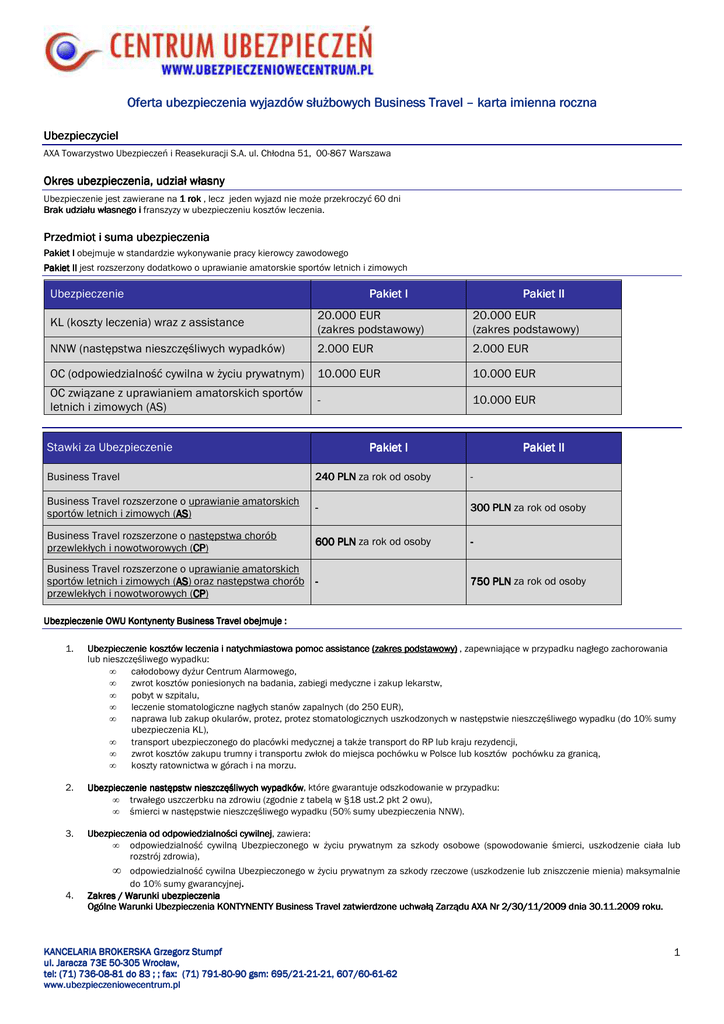 Oferta ubezpieczenia wyjazdów służ służbowych Business Travel – karta imienna roczna Ubezpieczyciel AXA Towarzystwo Ubezpieczeń i Reasekuracji S.A. ul. Chłodna 51, 00-867 Warszawa Okres ubezpieczenia, ubezpieczenia, udział własny Ubezpieczenie jest zawierane na 1 rok , lecz jeden wyjazd nie może przekroczyć 60 dni Brak udziału własnego i franszyzy w ubezpieczeniu kosztów leczenia. Przedmiot i suma ubezpieczenia Pakiet I obejmuje w standardzie wykonywanie pracy kierowcy zawodowego Pakiet II jest rozszerzony dodatkowo o uprawianie amatorskie sportów letnich i zimowych Ubezpieczenie Pakiet I Pakiet II KL (koszty leczenia) wraz z assistance 20.000 EUR (zakres podstawowy) 20.000 EUR (zakres podstawowy) NNW (następstwa nieszczęśliwych wypadków) 2.000 EUR 2.000 EUR OC (odpowiedzialność cywilna w życiu prywatnym) 10.000 EUR 10.000 EUR OC związane z uprawianiem amatorskich sportów letnich i zimowych (AS) - 10.000 EUR Stawki za Ubezpieczenie Pakiet I Pakiet II Business Travel 240 PLN za rok od osoby - Business Travel rozszerzone o uprawianie amatorskich sportów letnich i zimowych (AS AS) AS - 300 PLN za rok od osoby Business Travel rozszerzone o następstwa chorób przewlekłych i nowotworowych (CP CP) CP 600 PLN za rok od osoby - Business Travel rozszerzone o uprawianie amatorskich sportów letnich i zimowych (AS AS) AS oraz następstwa chorób przewlekłych i nowotworowych (CP CP) CP 750 PLN za rok od osoby Ubezpieczenie OWU Kontynenty Business Travel obejmuje : 1. Ubezpieczenie kosztów leczenia i natychmiastowa pomoc assistance (zakres podstawowy) podstawowy) , zapewniające w przypadku nagłego zachorowania lub nieszczęśliwego wypadku: • całodobowy dyżur Centrum Alarmowego, • zwrot kosztów poniesionych na badania, zabiegi medyczne i zakup lekarstw, • pobyt w szpitalu, • leczenie stomatologiczne nagłych stanów zapalnych (do 250 EUR), • naprawa lub zakup okularów, protez, protez stomatologicznych uszkodzonych w następstwie nieszczęśliwego wypadku (do 10% sumy ubezpieczenia KL), • transport ubezpieczonego do placówki medycznej a także transport do RP lub kraju rezydencji, • zwrot kosztów zakupu trumny i transportu zwłok do miejsca pochówku w Polsce lub kosztów pochówku za granicą, • koszty ratownictwa w górach i na morzu. 2. Ubezpieczenie następstw nieszczęśliwych wypadków, wypadków które gwarantuje odszkodowanie w przypadku: • trwałego uszczerbku na zdrowiu (zgodnie z tabelą w §18 ust.2 pkt 2 owu), • śmierci w następstwie nieszczęśliwego wypadku (50% sumy ubezpieczenia NNW). 3. Ubezpieczenia od odpowiedzialności cywilnej, cywilnej zawiera: • odpowiedzialność cywilną Ubezpieczonego w życiu prywatnym za szkody osobowe (spowodowanie śmierci, uszkodzenie ciała lub rozstrój zdrowia), • odpowiedzialność cywilna Ubezpieczonego w życiu prywatnym za szkody rzeczowe (uszkodzenie lub zniszczenie mienia) maksymalnie do 10% sumy gwarancyjnej. Zakres / Warunki ubezpieczenia ubezpieczenia Ogólne Warunki Ubezpieczenia KONTYNENTY Business Travel zatwierdzone uchwałą Zarządu AXA Nr 2/30/11/2009 dnia 30.11.2009 30.11.2009 roku. 4. KANCELARIA BROKERSKA Grzegorz Stumpf ul. Jaracza 73E 73E 5050-305 Wrocław, tel: tel: (71) 736736-0808-81 do 83 ; ; fax: (71) 791791-8080-90 gsm: 695/21695/21-2121-21, 607/60607/60-6161-62 www.ubezpieczeniowecentrum.pl 1