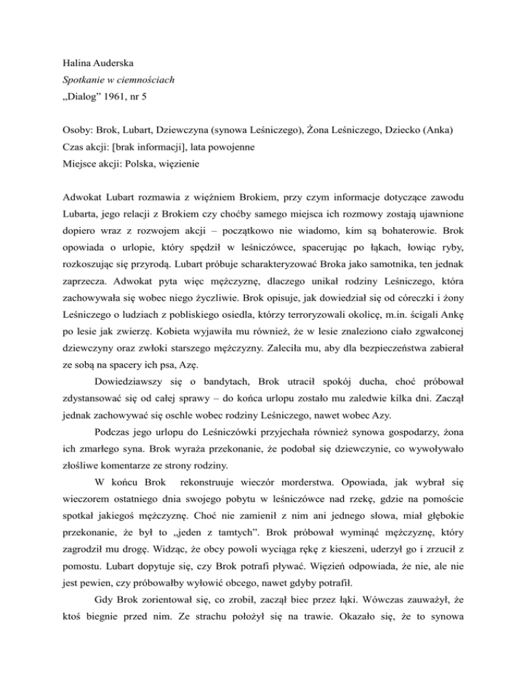 Halina Auderska Spotkanie w ciemnościach „Dialog” 1961, nr 5 Osoby: Brok, Lubart, Dziewczyna (synowa Leśniczego), Żona Leśniczego, Dziecko (Anka) Czas akcji: [brak informacji], lata powojenne Miejsce akcji: Polska, więzienie Adwokat Lubart rozmawia z więźniem Brokiem, przy czym informacje dotyczące zawodu Lubarta, jego relacji z Brokiem czy choćby samego miejsca ich rozmowy zostają ujawnione dopiero wraz z rozwojem akcji – początkowo nie wiadomo, kim są bohaterowie. Brok opowiada o urlopie, który spędził w leśniczówce, spacerując po łąkach, łowiąc ryby, rozkoszując się przyrodą. Lubart próbuje scharakteryzować Broka jako samotnika, ten jednak zaprzecza. Adwokat pyta więc mężczyznę, dlaczego unikał rodziny Leśniczego, która zachowywała się wobec niego życzliwie. Brok opisuje, jak dowiedział się od córeczki i żony Leśniczego o ludziach z pobliskiego osiedla, którzy terroryzowali okolicę, m.in. ścigali Ankę po lesie jak zwierzę. Kobieta wyjawiła mu również, że w lesie znaleziono ciało zgwałconej dziewczyny oraz zwłoki starszego mężczyzny. Zaleciła mu, aby dla bezpieczeństwa zabierał ze sobą na spacery ich psa, Azę. Dowiedziawszy się o bandytach, Brok utracił spokój ducha, choć próbował zdystansować się od całej sprawy – do końca urlopu zostało mu zaledwie kilka dni. Zaczął jednak zachowywać się oschle wobec rodziny Leśniczego, nawet wobec Azy. Podczas jego urlopu do Leśniczówki przyjechała również synowa gospodarzy, żona ich zmarłego syna. Brok wyraża przekonanie, że podobał się dziewczynie, co wywoływało złośliwe komentarze ze strony rodziny. W końcu Brok rekonstruuje wieczór morderstwa. Opowiada, jak wybrał się wieczorem ostatniego dnia swojego pobytu w leśniczówce nad rzekę, gdzie na pomoście spotkał jakiegoś mężczyznę. Choć nie zamienił z nim ani jednego słowa, miał głębokie przekonanie, że był to „jeden z tamtych”. Brok próbował wyminąć mężczyznę, który zagrodził mu drogę. Widząc, że obcy powoli wyciąga rękę z kieszeni, uderzył go i zrzucił z pomostu. Lubart dopytuje się, czy Brok potrafi pływać. Więzień odpowiada, że nie, ale nie jest pewien, czy próbowałby wyłowić obcego, nawet gdyby potrafił. Gdy Brok zorientował się, co zrobił, zaczął biec przez łąki. Wówczas zauważył, że ktoś biegnie przed nim. Ze strachu położył się na trawie. Okazało się, że to synowa Leśniczego. Dziewczyna widziała zabójstwo. Najpierw zaczęła płakać i przytuliła się do Broka, ale po chwili odepchnęła go i pobiegła do leśniczówki. Brok również wrócił domu i poszedł spać. Ciało znalazł o świcie stary rybak. Ku zaskoczeniu Broka, synowa Leśniczego sama poszła na milicję i opowiedziała o całym zajściu. Lubart stara się zrozumieć Broka, odwołując się do jego samotności, goryczy, stanów lękowych, „trudnego dzieciństwa”. Brok argumentuje, że jedynie się bronił, że próbował nie poddać się strachowi i zachować odwagę. Zapisane w didaskaliach odgłosy bomb, syreny etc. sugerują, że Brok przeżył wojnę. W sali jest ciemno, Lubart zaczyna się bać Broka. Wychodzi, zapewniając Broka, że może na niego liczyć. Brok bezskutecznie prosi go, aby jeszcze został. Mówi: „To przecież ja oskarżam! Ja oskarżam!”. Oprac. Agata Łuksza