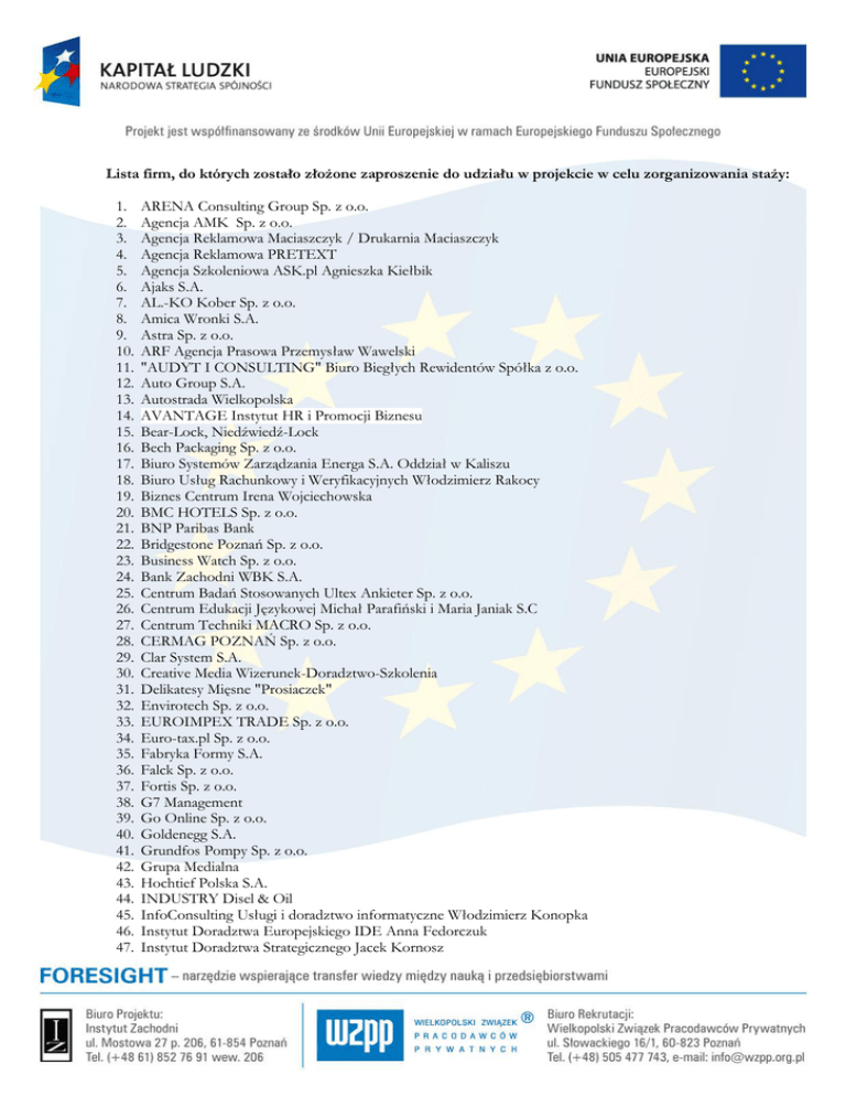 Lista firm, do których zostało złożone zaproszenie do udziału w projekcie w celu zorganizowania staży: 1. 2. 3. 4. 5. 6. 7. 8. 9. 10. 11. 12. 13. 14. 15. 16. 17. 18. 19. 20. 21. 22. 23. 24. 25. 26. 27. 28. 29. 30. 31. 32. 33. 34. 35. 36. 37. 38. 39. 40. 41. 42. 43. 44. 45. 46. 47. ARENA Consulting Group Sp. z o.o. Agencja AMK Sp. z o.o. Agencja Reklamowa Maciaszczyk / Drukarnia Maciaszczyk Agencja Reklamowa PRETEXT Agencja Szkoleniowa ASK.pl Agnieszka Kiełbik Ajaks S.A. AL.-KO Kober Sp. z o.o. Amica Wronki S.A. Astra Sp. z o.o. ARF Agencja Prasowa Przemysław Wawelski "AUDYT I CONSULTING" Biuro Biegłych Rewidentów Spółka z o.o. Auto Group S.A. Autostrada Wielkopolska AVANTAGE Instytut HR i Promocji Biznesu Bear-Lock, Niedźwiedź-Lock Bech Packaging Sp. z o.o. Biuro Systemów Zarządzania Energa S.A. Oddział w Kaliszu Biuro Usług Rachunkowy i Weryfikacyjnych Włodzimierz Rakocy Biznes Centrum Irena Wojciechowska BMC HOTELS Sp. z o.o. BNP Paribas Bank Bridgestone Poznań Sp. z o.o. Business Watch Sp. z o.o. Bank Zachodni WBK S.A. Centrum Badań Stosowanych Ultex Ankieter Sp. z o.o. Centrum Edukacji Językowej Michał Parafiński i Maria Janiak S.C Centrum Techniki MACRO Sp. z o.o. CERMAG POZNAŃ Sp. z o.o. Clar System S.A. Creative Media Wizerunek-Doradztwo-Szkolenia Delikatesy Mięsne "Prosiaczek" Envirotech Sp. z o.o. EUROIMPEX TRADE Sp. z o.o. Euro-tax.pl Sp. z o.o. Fabryka Formy S.A. Falck Sp. z o.o. Fortis Sp. z o.o. G7 Management Go Online Sp. z o.o. Goldenegg S.A. Grundfos Pompy Sp. z o.o. Grupa Medialna Hochtief Polska S.A. INDUSTRY Disel & Oil InfoConsulting Usługi i doradztwo informatyczne Włodzimierz Konopka Instytut Doradztwa Europejskiego IDE Anna Fedorczuk Instytut Doradztwa Strategicznego Jacek Kornosz 48. 49. 50. 51. 52. 53. 54. 55. 56. 57. 58. 59. 60. 61. 62. 63. 64. 65. 66. 67. 68. 69. 70. 71. 72. 73. 74. 75. 76. 77. 78. 79. 80. 81. 82. 83. 84. 85. 86. 87. 88. 89. 90. 91. 92. 93. 94. 95. 96. Kaliska Agencja Medyczna „Medix” Sp. z o.o Kancelaria Biegłego Rewidenta Iwona Nowak Kancelaria Doradztwa Podatkowego Jarosław Kubiak Kancelaria Radcy Prawnego Agata Pytel Karlik Spółka Jawna KOMA Biuro Konsultingowe Maria Korcz Kompania Piwowarska S.A. Komputronik S.A. KPMG Sp. z o.o. Krat Foods Polska S.A. Kuhne & Nagel Sp. z o.o. Legal Adviser Sp z o.o. Lingua Viva Logos Travel Marek Śliwka Sp.j Lyoness Poland Sp. z o.o. Magna Automotive Poland Sp. z o.o. Makropol S.A. MAN Truck & Bus MaxRoy.Com Sp. z o.o. Meble Vox Sp. z o.o. S.K.A. Menadżer Bezpieczeństwa Marian Kryłowicz MERIDIAN Restauracja Hotel Mondi Świecie S.A. M-Serwis Mielcarek Namysł S. c. Kancelaria Adwokacka Nickel Development Sp. z o.o. Nivea Polska Sp. z o.o. NOELL NOWIERSKI i Wspólnicy Sp. jawna Novol Sp. z o.o. Opel Szpot Sp. z .o.o Orlen Petro Zachód Sp. z o.o. OZE Inwestycje S.A. Pack Art. Sp. z o.o. Passion Cards Sp. z o.o. Philips Lighting Poland S.A. P. P.H.U "Blak-Mens" Kazimierz Rzeźnik PNO Consultants Sp. z o.o Polmed S.A. Polychem Systems Sp. z o.o. Potempa Inkasso Sp. z o.o. Premium Consulting Profitax Izabela Zaremba Raben Polska Sp. z o.o Reemtsma Polska S.A. Secus Wsparcie Biznesu Sp. z o.o. SKARKY&SKARKY Marcin Rudziakowicz Skutecznye-biznes.pl Haberq Sp. z o.o. (STAR TRAC Polska) Steel-Building Sp. z o.o. 97. Steer Sp. z o.o. 98. Stockmeier Chemie Sp. z o.o. i Spółka S.K. 99. Studio Urody Magdalena Matecka 100.Szkoła Berlitz Poland Sp. z o.o. 101.Śnioch i Partnerzy 102.T2 Investment S.A. 103.TEMPUS TELECOM Wojciech Jerzy Winkel 104.TRUST S.A. 105.R. Twining and Company Sp. z o.o. 106.Twoje M Deweloper 107.Warta Glass Group 108.WDC ProYou Sp. z o.o. 109.Wellness 110.Wielkopolska Spółdzielcza Kasa Oszczędnościowo – Kredytowa 111.Widzialni.pl 112.W.KRUK S.A. 113.Volkswagen Poznań Sp. z o.o. 114.YES Biżuteria Sp. z o.o. 115.Zakład Cukierniczy W. Kandulski 116.Zakład Naprawczy Mechanizacji Rolnictwa