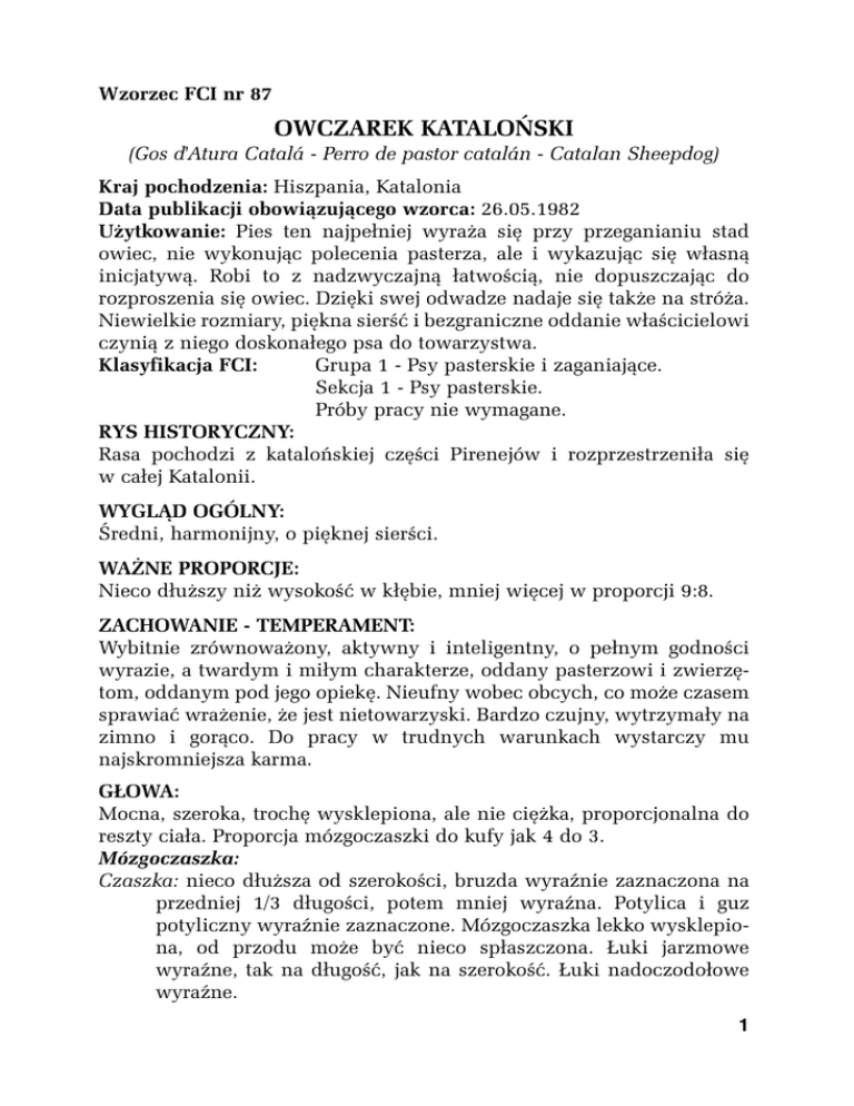 Wzorzec FCI nr 87 OWCZAREK KATALOŃSKI (Gos d'Atura Catalá - Perro de pastor catalán - Catalan Sheepdog) Kraj pochodzenia: Hiszpania, Katalonia Data publikacji obowiązującego wzorca: 26.05.1982 Użytkowanie: Pies ten najpełniej wyraża się przy przeganianiu stad owiec, nie wykonując polecenia pasterza, ale i wykazując się własną inicjatywą. Robi to z nadzwyczajną łatwością, nie dopuszczając do rozproszenia się owiec. Dzięki swej odwadze nadaje się także na stróża. Niewielkie rozmiary, piękna sierść i bezgraniczne oddanie właścicielowi czynią z niego doskonałego psa do towarzystwa. Klasyfikacja FCI: Grupa 1 - Psy pasterskie i zaganiające. Sekcja 1 - Psy pasterskie. Próby pracy nie wymagane. RYS HISTORYCZNY: Rasa pochodzi z katalońskiej części Pirenejów i rozprzestrzeniła się w całej Katalonii. WYGLĄD OGÓLNY: Średni, harmonijny, o pięknej sierści. WAŻNE PROPORCJE: Nieco dłuższy niż wysokość w kłębie, mniej więcej w proporcji 9:8. ZACHOWANIE - TEMPERAMENT: Wybitnie zrównoważony, aktywny i inteligentny, o pełnym godności wyrazie, a twardym i miłym charakterze, oddany pasterzowi i zwierzętom, oddanym pod jego opiekę. Nieufny wobec obcych, co może czasem sprawiać wrażenie, że jest nietowarzyski. Bardzo czujny, wytrzymały na zimno i gorąco. Do pracy w trudnych warunkach wystarczy mu najskromniejsza karma. GŁOWA: Mocna, szeroka, trochę wysklepiona, ale nie ciężka, proporcjonalna do reszty ciała. Proporcja mózgoczaszki do kufy jak 4 do 3. Mózgoczaszka: Czaszka: nieco dłuższa od szerokości, bruzda wyraźnie zaznaczona na przedniej 1/3 długości, potem mniej wyraźna. Potylica i guz potyliczny wyraźnie zaznaczone. Mózgoczaszka lekko wysklepiona, od przodu może być nieco spłaszczona. Łuki jarzmowe wyraźne, tak na długość, jak na szerokość. Łuki nadoczodołowe wyraźne. 1 Przełom czołowo-nosowy (stop): dobrze widoczny, ale niezbyt głęboki. Trzewioczaszka: Nos: prosty, proporcjonalny do wielkości głowy, wyłącznie czarny. Kufa: prosta, raczej krótka, stożkowata, lekko zaokrąglona w obrysie. Wargi: mocne, krótkie, o równych krawędziach, nie obwisłe, czarne, mocno pigmentowane, podobnie jak podniebienie. Uzębienie: mocne, dobrze wykształcone, białe i zdrowe. Zgryz nożycowy. U psów pracujących kły mogą być starte. Oczy: szeroko otwarte, wyraziste, o żywym i inteligentnym spojrzeniu, barwy ciemnobursztynowej, o czarnych powiekach. Uszy: wysoko osadzone, trójkątne, delikatne, na końcach zaostrzone; chrząstka niezbyt gruba i elastyczna. Wiszące blisko przy głowie. Stosunek szerokości do długości ucha jak 8 do 10. Porośnięte długim włosem, tworzącym ruchliwe frędzle. U psów pracujących dopuszcza się uszy cięte. SZYJA: Ruchliwa, mocna, dobrze umięśniona, raczej krótka, ale nie aż tak, aby ograniczało to jej ruchliwość, dobrze osadzona na łopatkach. TUŁÓW: Lekko wydłużony, mocny, dobrze umięśniony, dający wrażenie siły i zwinności. Kłąb: dobrze widoczny. Grzbiet: prosty, nigdy nie zapadnięty, zad lekko wzniesiony, na wysokość kłębu lub nieco niżej. Może wydawać się jeszcze wyższy ze względu na obfity włos. Zad: krzepki, dobrze umięśniony, lekko opadający. Klatka piersiowa: dobrze rozwinięta, szeroka, sięgająca łokcia. Żebra dobrze wysklepione, nie płaskie, co zapewnia niezbędna do pracy pojemność klatki. Brzuch i słabizna: brzuch lekko podciągnięty, słabizna krótka, wyraźnie widoczna. OGON: Osadzony raczej nisko, może być długi, sięgający stawu skokowego, albo krótki, krótszy niż 10 cm. Zdarzają się osobniki bez ogonów, a u psów pracujących dopuszcza się cięcie. Gdy pies stoi spokojnie, ogon zwisa luźno, tworząc fajkę na końcu. Dopuszczalny także ogon w kształcie szabli. W ruchu wzniesiony, ale nie zawinięty nad grzbietem. Obficie porośnięty długim, lekko falistym włosem. 2 KOŃCZYNY: Kończyny przednie: mocne, suche, proste i równoległe, tak z przodu, jak z boku. Odległość od kłębu do łokcia niemal taka sama, jak od łokcia do podłoża. Łopatki: mocne, dobrze umięśnione, ustawione trochę skośnie. Kąt pomiędzy łopatką i ramieniem: około 110 stopni. Ramiona: mocne i dobrze umięśnione, łokcie przylegające, nie wykręcone ani na zewnątrz, ani do wewnątrz. Kąt pomiędzy ramieniem a przedramieniem: około 135 stopni. Przedramię: proste, mocne, zapewniające dużą sprawność w pracy. Nadgarstki i śródręcza: stanowią pionowe przedłużenie przedramienia i są raczej krótkie. Łapy: owalne, o czarnym i mocnych opuszkach, między palcami dobrze porośnięte włosem, pazury mocne i czarne. Kończyny tylne: Mocne, dobrze umięśnione, równoległe, dające wrażenie siły i zwinności. Uda: długie, szerokie, dobrze umięśnione, o mocnej kości. Kąt pomiędzy miednicą a kością udową: około 115 stopni. Kończyny: o mocnym kośćcu i dobrze umięśnione. Stawy skokowe: nisko osadzone, nie wykręcone ani na zewnątrz, ani do wewnątrz. Śródstopia: krótkie, pionowe i proste. Łapy: identyczne, jak przednie, ale z nisko osadzonymi, podwójnymi, kostnymi wilczymi pazurami. Zrośnięte są one błoną i przyrośnięte do wewnętrznego palca łapy. CHODY: Wydajny, typowy dla psów owczarskich. Galopuje tylko na rozległych przestrzeniach, w ringu zaś porusza się krótkim kłusem, takim, jak inne psy, posiadające wilcze pazury. OKRYWA WŁOSOWA: Skóra: gruba, dobrze przylegająca na całym ciele i głowie, dobrze pigmentowana. Sierść: na tylnej jednej trzeciej tułowia sierść najdłuższa, prosta lub lekko falista, szorstka, z obfitym podszerstkiem. Na głowie widoczna broda, wąsy, brwi i tupecik. Ogon i kończyny dobrze owłosione. Linienie u tej rasy następuje w dwóch etapach. W pierwszym pies zrzuca sierść na przedniej części tułowia, tak, że pies wygląda jak dwa różne psy. Dopiero później linieje tylna część ciała, i pies wygląda znów normalnie. 3 Uma