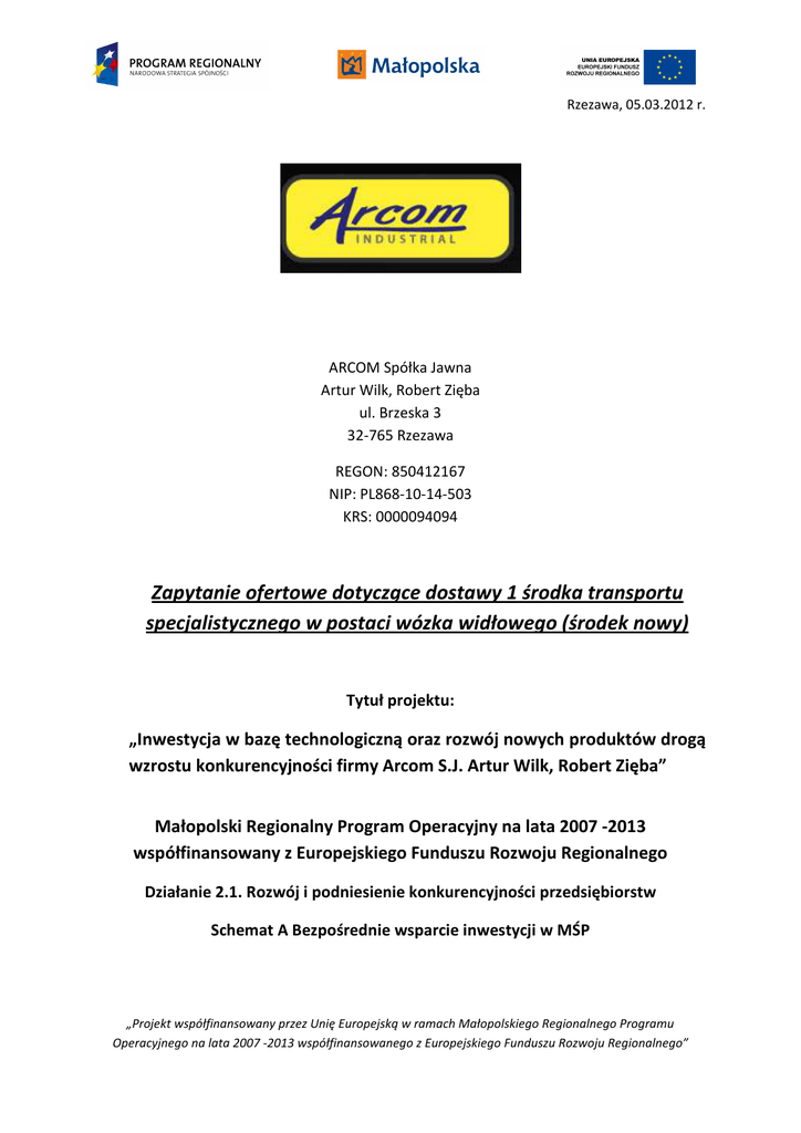 Rzezawa, 05.03.2012 r. ARCOM Spółka Jawna Artur Wilk, Robert Zięba ul. Brzeska 3 32-765 Rzezawa REGON: 850412167 NIP: PL868-10-14-503 KRS: 0000094094 Zapytanie ofertowe dotyczące dostawy 1 środka transportu specjalistycznego w postaci wózka widłowego (środek nowy) Tytuł projektu: „Inwestycja w bazę technologiczną oraz rozwój nowych produktów drogą wzrostu konkurencyjności firmy Arcom S.J. Artur Wilk, Robert Zięba” Małopolski Regionalny Program Operacyjny na lata 2007 -2013 współfinansowany z Europejskiego Funduszu Rozwoju Regionalnego Działanie 2.1. Rozwój i podniesienie konkurencyjności przedsiębiorstw Schemat A Bezpośrednie wsparcie inwestycji w MŚP „Projekt współfinansowany przez Unię Europejską w ramach Małopolskiego Regionalnego Programu Operacyjnego na lata 2007 -2013 współfinansowanego z Europejskiego Funduszu Rozwoju Regionalnego” 1.WPROWADZENIE Firma ARCOM istnieje od 1996 roku. Główną działalnością spółki jest produkcja lekkich konstrukcji metalowych dla branży motoryzacyjnej w szczególności metalowych palet. Firma specjalizuje się w rozwiązaniach do magazynowania opon. Oferta obejmuje wszelkiego rodzaju metalowe palety, metalowe regały, boxy oraz wózki do składowania i przewożenia wszystkich typów opon: od małych opon do quadów, wózków, czy skuterów, poprzez opony motorowe, osobowe, terenowe, dostawcze, rolnicze i przemysłowe, aż do opon Giant. 2.CELE ZAPYTANIA OFERTOWEGO Celem niniejszego zapytania ofertowego jest zakup środka transportu wymienionego w pkt.3. 3. PRZEDMIOT ZAPYTANIA OFERTOWEGO Przedmiotem niniejszego zapytania jest dostawa 1 środka transportu specjalistycznego w postaci wózka widłowego (środek nowy). Parametry techniczne: Udźwig: Wysokość podnoszenia: Opony: Przesuw boczny: Kabina ogrzewana: Silnik : 4,5 T 4,5 m Maszt Tripex Super Elastik tak tak diesel 4. OSOBY UPRAWNIONE DO KONTAKTU Z OFERENTEM Osobą uprawnioną do porozumiewania się z Oferentami jest: Artur Wilk tel: 14 696 04 00 e-mail: [email protected] 5. SPOSÓB WYBORU OFERENTA Ocena zgodności ofert z wymaganiami Zamawiającego przeprowadzona zostanie wyłącznie na podstawie analizy dokumentów i materiałów, jakie Oferent zawarł w swej ofercie. Ocenie podlegać będzie zarówno formalna, jak i merytoryczna zgodność oferty z wymaganiami. Zamawiający zastrzega sobie prawo sprawdzania w toku oceny ofert wiarygodności przedstawionych przez Oferentów dokumentów, wykazów, danych i informacji. 5.1 Kryterium wyboru oraz ich waga Wybór najkorzystniejszej oferty nastąpi w oparciu o następujące kryteria: „Projekt współfinansowany przez Unię Europejską w ramach Małopolskiego Regionalnego Programu Operacyjnego na lata 2007 -2013 współfinansowanego z Europejskiego Funduszu Rozwoju Regionalnego” Kryterium Cena Waga 100 % 6. TERMINY ZWIĄZANE Z ZAPYTANIEM OFERTOWYM Ostateczny termin składania ofert 09.03.2012 Termin oceny ofert 12.03.2012 Ostateczny termin realizacji 30.06.2012 Ofertę należy przesłać pocztą, na adres e-mail osoby upoważnianej do kontaktu bądź też dostarczyć osobiście do siedziby Zamawiającego. 7. SPOSÓB PRZYGOTOWANIA OFERTY • Oferta może być dostarczona w formie papierowej lub elektronicznej (plik w formacie pdf lub word nieedytowalne). Wnioskodawca dopuszcza także możliwość składania ofert na formularzu ofertowym stanowiącym załącznik nr 1 do niniejszego zapytania ofertowego. • Oferta powinna zostać złożona na formularzu ofertowym stanowiącym załącznik do zapytania ofertowego lub w postaci samodzielnie przygotowanego dokumentu zawierającego co najmniej: − − − − − nazwę i adres oferenta, wartość oferty (netto oraz brutto), termin ważności oferty, warunki płatności, datę sporządzenia. Wskazane jest, by oferta zawierała również inne, dodatkowe informacje, np. dodatkowe funkcje dostawy, warunki dostawy, możliwe do uzyskania upusty, maksymalny czas realizacji, kosztorys ofertowy itd. • Oferta powinna być opatrzona pieczątką firmową oraz powinna być podpisana przez oferenta. • Oferent może wprowadzić zmiany w złożonej ofercie lub ją wycofać, pod warunkiem, że uczyni to przed upływem terminu składania ofert. • Ocena zgodności ofert z wymaganiami Zamawiającego przeprowadzona zostanie tylko i wyłącznie na podstawie informacji, jakie Oferent zawarł w swej ofercie. „Projekt współfinansowany przez Unię Europejską w ramach Małopolskiego Regionalnego Programu Operacyjnego na lata 2007 -2013 współfinansowanego z Europejskiego Funduszu Rozwoju Regionalnego” • Zamawiający nie dopuszcza składania ofert częściowych. • Zamawiający nie dopuszcza składania ofert wariantowych. • Każdy oferent może złożyć tylko jedną ofertę. • Żadne dokumenty wchodzące w skład oferty, w tym również te przedstawiane w formie oryginałów, nie podlegają zwrotowi przez Zamawiającego. • Oferent ponosi wszelkie koszty związane z przygotowaniem i złożeniem oferty. • Podana w ofercie cena ofertowa powinna uwzględniać wszystkie wymagania Zamawiającego określone w opisie przedmiotu zamówienia oraz zawierać wszelkie koszty, jakie poniesie Oferent z tytułu należytej oraz zgodnej z obowiązującymi przepisami realizacji przedmiotu zamówienia. • Wszystkie ceny powinny być podane w PLN netto oraz zawierać oznaczenie stawki VAT lub wartość podatku VAT. • Dopuszcza się składanie ofert w walucie obcej. Oferta w walucie obcej będzie przeliczona wg kursu na dzień złożenia oferty. • Całość oferty w formie papierowej lub elektronicznej musi zostać dostarczona na adres zamawiającego. Jeżeli oferta jest przygotowana w formie papierowej, powinna zostać złożona w formie uniemożliwiającej jej zdekompletowanie. Dokumenty przygotowane samodzielnie przez Oferenta muszą mieć formę wydruku komputerowego lub maszynopisu. 8. TERMIN ZWIĄZANIA OFERTĄ Jeżeli Oferent nie zaznaczy inaczej, pozostaje związany z