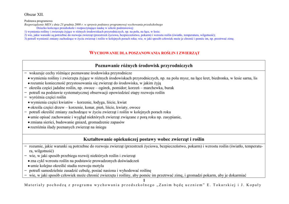 Obszar XII. Podstawa programowa Rozporządzenie MEN z dnia 23 grudnia 2008 r. w sprawie podstawy programowej wychowania przedszkolnego Dziecko kończące przedszkole i rozpoczynające naukę w szkole podstawowej: 1) wymienia rośliny i zwierzęta żyjące w różnych środowiskach przyrodniczych, np. na polu, na łące, w lesie; 2) wie, jakie warunki są potrzebne do rozwoju zwierząt (przestrzeń życiowa, bezpieczeństwo, pokarm) i wzrostu roślin (światło, temperatura, wilgotność); 3) potrafi wymienić zmiany zachodzące w życiu zwierząt i roślin w kolejnych porach roku; wie, w jaki sposób człowiek może je chronić i pomóc im, np. przetrwać zimę. WYCHOWANIE DLA POSZANOWANIA ROŚLIN I ZWIERZĄT Poznawanie różnych środowisk przyrodniczych − wskazuje cechy różniące poznawane środowiska przyrodnicze wymienia rośliny i zwierzęta żyjące w różnych środowiskach przyrodniczych, np. na polu mysz, na łące kret, biedronka, w lesie sarna, lis rozumie konieczność przystosowania się zwierząt do środowiska, w jakim żyją − określa części jadalne roślin, np. owoce – ogórek, pomidor; korzeń – marchewka, burak − potrafi na podstawie systematycznej obserwacji opowiedzieć etapy rozwoju roślin − wyróżnia części roślin wymienia części kwiatów – korzenie, łodyga, liście, kwiat określa części drzew – korzenie, konar, pień, liście, kwiaty, owoce − potrafi określić zmiany zachodzące w życiu zwierząt i roślin w kolejnych porach roku umie opisać zachowanie i wygląd niektórych zwierząt związane z porą roku np. zasypianie, zmiana sierści, budowanie gniazd, gromadzenie zapasów rozróżnia ślady poznanych zwierząt na śniegu Kształtowanie opiekuńczej postawy wobec zwierząt i roślin − rozumie, jakie warunki są potrzebne do rozwoju zwierząt (przestrzeń życiowa, bezpieczeństwo, pokarm) i wzrostu roślin (światło, temperatura, wilgotność) − wie, w jaki sposób przebiega rozwój niektórych roślin i zwierząt zna cykl wzrostu roślin na podstawie prowadzonych doświadczeń umie kolejno określić stadia rozwoju motyla − potrafi samodzielnie zasadzić cebulę, posiać nasiona i wyhodować roślinę − wie, w jaki sposób człowiek może chronić zwierzęta i rośliny, aby pomóc im przetrwać zimę, i gromadzi pokarm, aby je dokarmiać 1 Materiały pochodzą z programu wychowania przedszkolnego „Zanim będę uczniem” E. Tokarskiej i J. Kopały Obszar XII. nie zrywa owoców drzew i krzewów stanowiących pokarm dla ptaków − potrafi opiekować się zwierzętami hodowanymi w domu − uczestniczy w pracach w ogródku przedszkolnym potrafi dbać o zasadzone rośliny grabi jesienią liście uczestniczy w zabezpieczaniu roślin przed mrozem Rozumienie konieczności ochrony środowiska przyrodniczego − rozumie, że działalność człowieka może mieć negatywny wpływ na środowisko naturalne orientuje się, że zanieczyszczenie powietrza powodują np. spaliny samochodowe, ścieki odprowadzane z dużych zakładów przemysłowych do rzek − potrafi właściwie zachować się w lesie i parku zachowuje się spokojnie, aby nie płoszyć zwierząt i ptaków sprząta po sobie opakowania po jedzeniu i napojach − wie, w jaki sposób człowiek chroni przyrodę rozumie, dlaczego niektóre gatunki zwierząt i roślin są pod ochroną potrafi rozpoznać i wymienić rośliny chronione, np. wiosenne kwiaty − wie, dlaczego trzeba budować oczyszczalnie ścieków określa, w jaki sposób należy oszczędzać wodę − zna pojęcie surowce wtórne i oznaczenie recyklingu − potrafi segregować odpady według ich rodzaju rozpoznaje oznaczenia pojemników na surowce wtórne wie, co należy robić z niewykorzystanymi lekarstwami i zużytymi bateriami − nazywa elementy środowiska naturalnego (gleba, powietrze, woda) i rozumie ich znaczenie dla świata ludzi, roślin i zwierząt − uczestniczy w akcjach propagujących ochronę środowiska, np. Sprzątanie Świata, Dzień Ziemi 2 Materiały pochodzą z programu wychowania przedszkolnego „Zanim będę uczniem” E. Tokarskiej i J. Kopały Obszar XII. Sposoby realizacji: spacery i wycieczki – rozbudzają emocjonalny stosunek do przyrody poprzez ukazanie jej znaczenia dla życia człowieka. Pomagają zauważyć różnorodne formy życia, bogactwo kolorów, dźwięków i zapachów, a także negatywne skutków niewłaściwego obcowania ludzi z przyrodą; prace w ogrodzie przedszkolnym – zapoznają z rozwojem, budową, sposobem pielęgnacji roślin i zabezpieczania ich przed mrozem. Uczą korzystania z narzędzi i przyborów ogrodniczych, utrzymywania ich w czystości i porządku. Kształtują takie cechy, jak obowiązkowość i odpowiedzialność; kącik przyrody wyposażony w materiał przyrodniczy oraz obiekty przyrody nieożywionej wykorzystujemy do prowadzenia stałych lub okresowych hodowli roślin i zwierząt, aby zapoznać dzieci z ich rozwojem oraz warunkami potrzebnymi do życia. Właściwie zagospodarowany umożliwia eksperymentowanie i przeprowadzanie różnych doświadczeń; przekaz literacki – przybliża i pomaga zrozumieć świat przyrody, wprowadza i utrwala ważne informacje przyrodnicze, uczy szacunku dla roślin i zwierząt. Pozwala na poznawanie środowisk przyrodniczych niedostępnych bezpośredniej obserwacji. Publikacje popularno-naukowe, do których należą atlasy zwierząt i roślin czy encyklopedie przyrodnicze, pokazują zwierzęta, rośliny i fakty zgodnie z rzeczywistością; rozmowa – sprzyja ukierunkowaniu obserwacji, zachęca do zadawania przez dzieci pytań, umożliwia wyjaśnienie zaobserwowanych zjawisk, porządkuje zdobyte wiadomości, pomaga w tworzeniu i uściślaniu pojęć ogólnych; zabawy badawcze – umożliwiają poznawanie przyrody wszystkimi zmysłami, wywołują emocje związane z samodzielnym dokonywaniem odkryć. Rozwijają logiczne myślenie w trakcie wyciągania wniosków z przeprowadzonych obserwacji i ustalania zwi