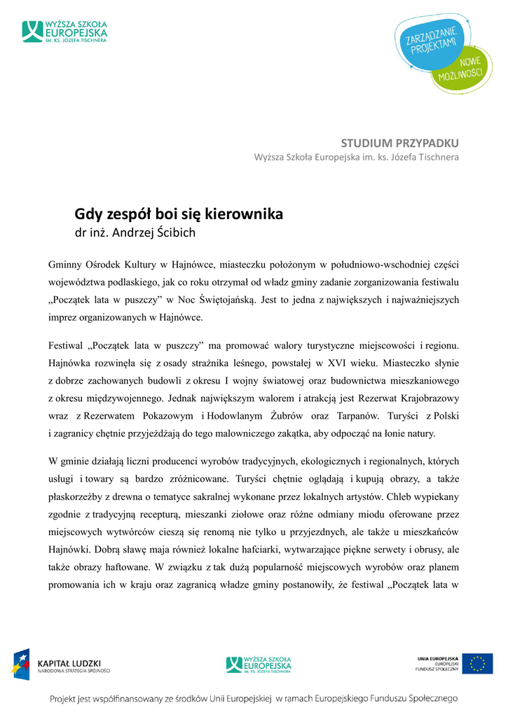 STUDIUM PRZYPADKU Wyższa Szkoła Europejska im. ks. Józefa Tischnera Gdy zespół boi się kierownika dr inż. Andrzej Ścibich Gminny Ośrodek Kultury w Hajnówce, miasteczku położonym w południowo-wschodniej części województwa podlaskiego, jak co roku otrzymał od władz gminy zadanie zorganizowania festiwalu „Początek lata w puszczy” w Noc Świętojańską. Jest to jedna z największych i najważniejszych imprez organizowanych w Hajnówce. Festiwal „Początek lata w puszczy” ma promować walory turystyczne miejscowości i regionu. Hajnówka rozwinęła się z osady strażnika leśnego, powstałej w XVI wieku. Miasteczko słynie z dobrze zachowanych budowli z okresu I wojny światowej oraz budownictwa mieszkaniowego z okresu międzywojennego. Jednak największym walorem i atrakcją jest Rezerwat Krajobrazowy wraz z Rezerwatem Pokazowym i Hodowlanym Żubrów oraz Tarpanów. Turyści z Polski i zagranicy chętnie przyjeżdżają do tego malowniczego zakątka, aby odpocząć na łonie natury. W gminie działają liczni producenci wyrobów tradycyjnych, ekologicznych i regionalnych, których usługi i towary są bardzo zróżnicowane. Turyści chętnie oglądają i kupują obrazy, a także płaskorzeźby z drewna o tematyce sakralnej wykonane przez lokalnych artystów. Chleb wypiekany zgodnie z tradycyjną recepturą, mieszanki ziołowe oraz różne odmiany miodu oferowane przez miejscowych wytwórców cieszą się renomą nie tylko u przyjezdnych, ale także u mieszkańców Hajnówki. Dobrą sławę maja również lokalne hafciarki, wytwarzające piękne serwety i obrusy, ale także obrazy haftowane. W związku z tak dużą popularność miejscowych wyrobów oraz planem promowania ich w kraju oraz zagranicą władze gminy postanowiły, że festiwal „Początek lata w puszczy” poprzedzą dwudniowe targi produktów lokalnych. Odpowiedzialność za ich zorganizowanie spoczęła również na Gminnym Ośrodku Kultury, którego pracownicy są najlepiej zorientowani w działalności producentów wyrobów regionalnych. Jednocześnie radni uznali, że najlepiej będzie jeśli oba przedsięwzięcia będą koordynować te same osoby, gdyż wówczas zostanie zachowana spójność pomiędzy nimi i festiwal oraz targi będą stanowić dwa elementy większego projektu. Powierzenie organizacji obu imprez Gminnemu Ośrodki Kultury wynikało również z faktu, iż wszystkie poprzednie wydarzenia przygotowane przez pracowników Ośrodka zakończyły się sukcesem. Radni wyznaczyli na kierownika projektu Jerzego Igiełkę, dyrektora Gminnego Ośrodka Kultury, który zarazem sprawuje funkcję radnego w powiecie oraz przewodniczącego powiatowej komisji kultury. Posiada on duże doświadczenie w organizacji różnego rodzaju przedsięwzięć kulturalnych i promocyjnych. W ciągu 30 lat swojej pracy, w tym 10 na stanowisku dyrektora Centrum był wielokrotnie nagradzany za swoje osiągnięcia. Jerzy Igiełka ze względu na sprawowane funkcje oraz długoletnią działalność w branży jest chętnie i często zapraszany na różnego rodzaju wydarzenia na terenie całego województwa oraz poza jego granicami. Posiada także szeroką sieć kontaktów nie tylko zawodowych ale także prywatnych na terenie Polski Wschodniej. W związku z tym, rzadko można spotkać go w biurze Gminnego Ośrodka Kultury. Bywa również trudno uchwytny przez telefon dla pracowników Ośrodka. Ponieważ Jerzy zdaje sobie sprawę z licznych zobowiązań i ograniczonego czasu jakim dysponuje, preferuje delegowanie zdań w swoich zespołach oraz rozliczanie podwładnych z efektów. Ceni samodzielność i umiejętność podejmowania kluczowych decyzji bez konieczności angażowania jego osoby. Bardzo szybko się irytuje, gdy pracownicy proszę go o podjęcie decyzji, która w jego ocenie powinna zostać przez nich podjęta. Jednocześnie bardzo nie lubi złych informacji i ma duże problemy z ich akceptacją, co często negatywnie odbija się na osobie je przekazującej. Innymi słowy posłaniec przynoszący złą informację nigdy nie może czuć się bezpieczny. Dodatkowo Jerzy ma bardzo niski poziom tolerancji na błędy popełniane przez swoich pracowników. Nie uznaje wyjaśnień i wymówek. Zazwyczaj swój brak zadowolenia formułuje werbalnie poprzez krzyk na pracownika, który popełnił błąd. Zdarzyło mu się nawet raz zwolnić jednego z nich. Zespół oddelegowany do przygotowania targów oraz festiwalu, którego kierownikiem jest Jerzy Igiełka, składa się z czterech pracowników Gminnego Ośrodka Kultury. Anna Kwiatek jest pracownikiem o najdłuższym stażu w GOK-u, doskonale orientuje się we wszelkich kwestiach finansowych, od zdobywania funduszy przez kontakty ze sponsorami po rozliczenia. W projekcie odpowiada za zbiórkę funduszy na realizację przedsięwzięć oraz budżet. Promocją projektu zajmuje się Paweł Szyszka, młody pracownik, który wrócił do Hajnówki po zakończeniu studiów związanych z PR i reklamą w Warszawie. Kwestie organizacyjne, w tym logistyka, zostały rozdzielone pomiędzy Klaudię Motyl, która jest odpowiedzialna za targi oraz Katarzynę Sęk odpowiedzialną za festiwal. Obie pracują w GOK-u od 10 lat. Cały zespół ma świadomość, że Jerzy Igiełka źle przyjmuje złe informacje, dlatego wszyscy unikają ich przekazywania i każdemu problemowi starają się zaradzić we własnym gronie. Od samego początku przygotowania do realizacji projektu były trudniejsze niż w poprzednich latach. Rozszerzenie festiwalu o targi spowodowało konieczność zwiększenia planowanych działań przy jednoczesnym zachowaniu tego samego budżetu. Radni zlecili dodatkowe zadania bez uwzględnienia ich w budżecie gminy. Dodatkowo część sponsorów ze względu na kryzys gospodarczy wycofała się lub zmniejszyła poziom swojego wsparcia. Do zorganizowania targów konieczne było wynajęcia straganów, na których lokalni producenci mogli wystawić swoje towary. Organizacja targó