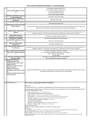 LISTA FIRM PARTNERÓW PROGRAMU 4+ LICZNA RODZINA 15% rabatu na wejście rodzinne 2+2 28 zł za wejście 4,5h dla dzieci do lat 13 5-7 lat nauka pływania 20 zł/h 8-10 lat nauka pływania 20 zł/h 11-13 lat nauka pływania 20zł/h 1 Termy Szaflary, Szaflary os. Nowe 20 2 3 4 5 KARCMA U BORZANKA, Nowy Targ ul. Waksmundzka 105 Pizzeria Da Grasso, Nowy Targ ul. Kowaniec 2F F.H. GEX, Nowy Targ ul. Rynek 15 Księgarnia Logos, Nowy Targ ul. Długa 81 7 Szkoła Walki Yamabushi, Ostrowsko ul. W. Orkana 52 Gospodarstwo Jeździeckie Stanisław Buła, Łopuszna ul. Polna 12 9 10 Biuro Usług Informatycznych Shift, Nowy Targ ul. Królowej Jadwigi 15 A 12 "Górol-Ski" Jacek Handzel Wyciąg Narciarski "Zadział" Handlowo-Produkcyjna Spółdzielnia Pracy "SCH" 1) Hala Handlowa, Nowy Targ ul. Ludźmierska 25A 2) Sklep nr 1 spożywczy, Nowy Targ ul. Rynek 14 3) Sklep nr 5 ChemicznoKosmetyczny, Nowy Targ ul. Rynek 14 4) Sklep nr 6 Odzież-Obuwie, Nowy Targ ul. Rynek 15 14 30% usługi serwisowe, 10% słuchawki, 5% pamięci, 10% tusze do drukowania, 3% zestawy komputerowe, 3% notebooki, 10% obudowy komputerowe 15% okluary korekcyjne, 10% okulary słoneczne, 5% soczewki kontaktowe i płyny do pielegnacji soczewek, 25% wizyta okulistyczna, 25% badanie tomografii okulistycznej, 15% badanie pola widzenia, 10% podręczniki szkolne, 10% pomoce naukowe, 10% testy kompetencyjne, 10% wademeka, 10% artykuły papierniczne, długopisy, pisaki itp. , 10% zeszyty, bloki, papier ksero, 10% plecaki, oprawki, worki na pantofle 15% rabatu na zajęcia jiu jitsu dla dziecka 5% rabat na indywidualną naukę jazdy konnej, 10% karnet nauki jazdy konnej Kino Tatry, Nowy Targ ul. J.Kazimierza 17 Księgarnia Emaus, Nowy targ ul. Św. Katarzyny 1 11 13 20% pizza duża i mała Zakład Optyczny Maria Kruk, Nowy Targ ul. Krzywa 7 6 8 10 % dania z karty, 10% napoje AVALIO Sp. z o.o. 10% rabatu na bilety kinowe 10% podręczniki szkolne, 10% pomoce naukowe, 10% testy kompetencyjne, 10% wademeka, 10% artykuły papierniczne, długopisy, pisaki itp. , 10% zeszyty, bloki, papier ksero, 10% plecaki, oprawki, worki na pantofle 5% rabat na komputery stacjonarne, drukarki, 3% na notebooki z wyjątkiem egzemplarzy promocyjnych, 10% na materiały eksploatacyjne, 10% na usługi 20% rabatu na naukę jazdy na nartach i snowboardzie, 20% na wypożyczanie sprzętu sportowego Wydanie kart stałego klienta na zakupy w wybranych placówkach spółdzielni umożliwiające uzyskanie rabatu w formie darmowego zakupu zgodnie z regulaminem karty stałego klienta 10% rabatu na zakup pakietu MECENA DIRECT Forma usług Telefoniczna pomoc prawna - korzystanie z profesjonalnej porady prawnej adwokata, radcy prawnego lub doradcy podatkowego. W ramach porady w jednej sprawie nasz zespół prawny przeanalizuje sprawę oraz dokumenty potrzebne do udzielenia prawidłowej porady a będących w posiadaniu Klienta i wskaże: - możliwe rozwiązania - jeśli prawo przewiduje ich kilka, - najkorzystniejszy dla Klienta sposób rozwiązania problemu - podstawy prawne – Klient dowie się, jakie przepisy odnoszą się do jego sprawy, - instytucje prawne – organy/podmioty uprawnione/zobowiązane do podjęcia działań w danej sprawie; - argumenty za i przeciw - podamy, jak bronić się przed ewentualnymi zarzutami drugiej strony, - wzory odpowiednich pism lub gotowe dokumenty - na życzenie, - odpowiedzi na pytania dodatkowe - informacje o wysokości kosztów sądowych i procedurach w danej sprawie; - informacje o właściwości sądów i innych organów w danej sprawie Zakres merytoryczny usługi Doradztwo w zakresie wszystkich dziedzin prawa związanych z życiem prywatnym W tym m.in.: - prawo spadkowe (dziedziczenie ustawowe; testament; zachowek, przyjęcie spadku; długi spadkowe; dział spadku; podatki; inne); - prawo dotyczące darowizn (forma darowizny, niezbędne dokumenty, opodatkowanie); - prawo rodzinne (rozwody, alimenty, adopcje, podział majątku małżonków, intercyzy, przysposobienia); - zabezpieczenie społeczne (emerytury; renty; dodatki do emerytur i rent; świadczenia przedemerytalne; bezrobocie; pomoc społeczna; dodatki mieszkaniowe; inne); - prawo lokalowe i prawo nieruchomości (najem, zamiana lokalu, dziedziczenie mieszkań, podział nieruchomości, warunki zabudowy) - prawo pracy (rozwiązanie umowy przez pracownika; rozwiązanie umowy przez pracodawcę; urlop; czas pracy; godziny nadliczbowe; wynagrodzenie; mobbing; zawarcie umowy; wypadki przy pracy; delegacje; zwolnienia grupowe; BHP; praca za granicą; inne); - wszelkie sprawy związane z posiadaniem i użytkowaniem pojazdu mechanicznego (kolizje drogowe, odszkodowania ubezpieczeniowe, mandaty, zbycie i zakup pojazdu) - postępowanie cywilne (właściwość sądu, procedury odwoławcze); - prawo konsumenckie (reklamacje, gwarancje, rękojmie, inne); - prawo podatkowe (podatek: dochodowy, VAT, od spadków i darowizn, od nieruchomości; opłaty skarbowe; podwójne opodatkowanie; inne); - prawo ubezpieczeniowe (dochodzenie roszczeń odszkodowawczych; - prawo karne i prawo wykroczeń (np. informacje dotyczące karalności sprawców, możliwości obrony, możliwości dochodzenia roszczeń przez pokrzywdzonych); - prawo administracyjne i procedura administracyjna Okres obowiązywania możliwość wykorzystania usługi 12 miesięcy po wykorzystaniu usługa wygasa cena po rabacie 45PLN 10% rabatu na zakup pakietu MECENA DIRECT DLA RODZINY Forma usług Telefoniczna pomoc prawna - korzystanie z profesjonalnej porady prawnej adwokata, radcy prawnego lub doradcy podatkowego. W ramach porady w jednej sprawie nasz zespół prawny przeanalizuje sprawę oraz dokumenty potrzebne do udzielenia prawidłowej porady a będących w posiadaniu Klienta i wskaże: - możliwe rozwiązania - jeśli prawo przewiduje ich kilka, - najkorzystniejszy dla Klienta sposób rozwiązania problemu - podstawy prawne – Klient dowie się, jakie przepisy odnoszą się do jego sprawy, - instytucje prawne – organy/podmioty uprawnione/zob