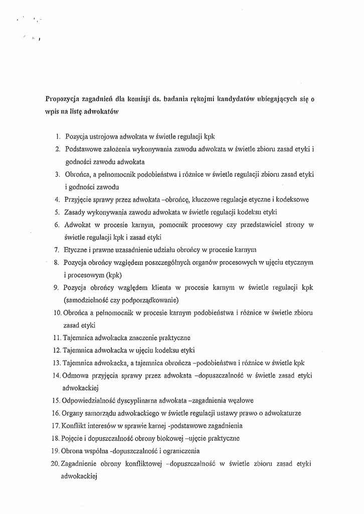 r , .' Propozycja zagadnleri dla komisji ds. badania rekojmi kandydatow ubiegajacych si~ 0 wpis ua Iist~ ndwokatow 1, Pozycja ustrojowa adwokata w swietle regulacji kpk 2. Podstawowe zalozeniawykonywania zawodu adwokata w swietle zbioru zasad etyki i godnosci zawodu adwokata 3. Obronca, a pelnomocnik podobienstwa i roznice 'v swietle regulacji zbioru zasad etyki i godnosci zawodu 4. Przyjecie sprawy przez adwokata -obr011C((, kluczowe regulacje etyczne i kodeksowe 5. Zasady wykonywania zawodu adwokata w swietle regulacji kodeksu etyki 6. Adwokat w procesie karnym, pomocnik procesowy czy przedstawiciel strony w swietle regulacji kpk i zasad etyki 7. Etyczne i prawne uzasadnienie udzialu obroncy w procesie karnym 8. Pozycja obroncy wzgledem poszczegolnych organow procesowych 'v ujeciu etycznym i procesowyrn (kpk) 9. Pozycja obroncy wzgledem klienta w procesie karnym \V swietle regulacji kpk (samodzielnosc ezy podporzadkowanie) 10. Obronca a pelnomocnik w procesie karnym podobieustwa i roznice w swietle zbioru zasad etyki 11. Tajemnica adwokacka znaczenie praktyczne 12. Tajemnica adwokacka -» ujeciu kodeksu etyki 13. Tajemnica adwokacka, a tajemnica obroncza -podobienstwa i roznice \v swietle kpk 14, Odmowa przyjecia sprawy przez adwokata -dopuszczalnosc w swietle zasad etyki adwokackiej 15. Odpowiedzialnosc dyscyplinarna adwokata -zagadnienia wezlowe ° 16. Organy samorzadu adwokackiego W swietle regulacji ustawy prawo adwokaturze 17. Konflikt interesow w sprawie karnej -podstawowe zagadnienia 18. Pojecie i dopuszczalnosc obrony blokowej -ujecie praktyczne 19. Obronawsp61na -dopuszczalnosc i ograniczenia 20, Zagadnienie obrony konfliktowej -dopuszczalnosc \v swietle zbioru zasad etyki adwokackiej f ! 21. Zagadnienie obrony konfliktowej -dopuszczalnosc Vl swietle regulacji kpk 22.Naduzycie prawa przez obronce, konsekwencje prawne i etyczne 23. Granice legalnej obrony lV swietle regulacji kpk 24. Granice legalnej obrony w swietleregulacji etycznych 25. Przedmiotowe i podrniotowe granice obrony 'v procesiekamym 26.Dopuszczalnosc konstruowania wersji obrony przez adwokata, a regulacje kpk i etyki adwokackiej 27. Poplecznictwo ewentualna odpowiedzialnosc adwokata za przygotowanie pism procesowych 28. Aktywnosc dowodowa obroncy w procesie karnym w swietle regulacji kpk i etyki adwokackiej 29. Ograniczenia zwiazane z przyjeciem i prowadzeniem spraw w swietle zasad etyki adwokackiej 30. Laczenie r61 procesowych (obronca -swiadek) 'v swietleregulacji zbioru etyki i kpk 31. Kontakty adwokata z osoba pozbawiona wolnosci w swietle zasad etyki adwokackiej 32. Obronca i swiadkowie -zasady kontaktow W swietle kpk i zasad etyki adwokackiej 33. Adwokat, a organy procesowe -zasady utrzymywania kontaktow swietle etyki adwokackiej 34, Poza. procesowa aktywnosc obroncy w zakresie poszukiwania dowcdov..' -regulacja kpk i zasad etyki 35. Podstawowe obowiazki adwokata wzgledem samorzadu adwokatury w swietle regulacji kodeksu etyki adwokackiej 36,Podstawowe zasady zwiazane z relacjami wobec kolegow adwokat6w w swietle zbioru zasad etyki i godnosci zawodu 37.0bowi'lzki adwokata wzgledem samorzadu 38, Warunki dopuszczalnosci wypowiedzenia przez adwokata pelnomocnictwa do prowadzeniasprawy 39.Obowiazki adwokata wobec klienta w zwiazku z prowadzeniem sprawy 40. Granice Iegalnej obrony w swietle kpk i kodeksu etyki -zasadnicze rozbieznosci nonnat)'\vne.