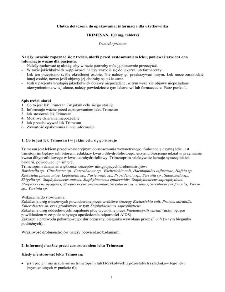 Ulotka dołączona do opakowania: informacja dla użytkownika TRIMESAN, 100 mg, tabletki Trimethoprimum Należy uważnie zapoznać się z treścią ulotki przed zastosowaniem leku, ponieważ zawiera ona informacje ważne dla pacjenta. - Należy zachować tę ulotkę, aby w razie potrzeby móc ją ponownie przeczytać. - W razie jakichkolwiek wątpliwości należy zwrócić się do lekarza lub farmaceuty. - Lek ten przepisano ściśle określonej osobie. Nie należy go przekazywać innym. Lek może zaszkodzić innej osobie, nawet jeśli objawy jej choroby są takie same. - Jeśli u pacjenta wystąpią jakiekolwiek objawy niepożądane, w tym wszelkie objawy niepożądane niewymienione w tej ulotce, należy powiedzieć o tym lekarzowi lub farmaceucie. Patrz punkt 4. Spis treści ulotki 1. Co to jest lek Trimesan i w jakim celu się go stosuje 2. Informacje ważne przed zastosowaniem leku Trimesan 3. Jak stosować lek Trimesan 4. Możliwe działania niepożądane 5. Jak przechowywać lek Trimesan 6. Zawartość opakowania i inne informacje 1. Co to jest lek Trimesan i w jakim celu się go stosuje Trimesan jest lekiem przeciwbakteryjnym do stosowania wewnętrznego. Substancją czynną leku jest trimetoprim będący inhibitorem reduktazy kwasu dihydrofoliowego, enzymu biorącego udział w przemianie kwasu dihydrofoliowego w kwas tetrahydrofoliowy. Trimetoprim selektywnie hamuje syntezę białek bakterii, powodując ich śmierć. Trimetoprim działa na większość szczepów następujących drobnoustrojów: Bordetella sp., Citrobacter sp., Enterobacter sp., Escherichia coli, Haemophilus influenzae, Hafnia sp., Klebsiella pneumoniae, Legionella sp., Pasteurella sp., Providencia sp., Serratia sp., Salmonella sp., Shigella sp., Staphylococcus aureus, Staphylococcus epidermidis, Staphylococcus saprophyticus, Streptococcus pyogenes, Streptococcus pneumoniae, Streptococcus viridans, Streptococcus faecalis, Vibrio sp., Yersinia sp. Wskazania do stosowania: Zakażenia dróg moczowych powodowane przez wrażliwe szczepy Escherichia coli, Proteus mirabilis, Enterobacter sp. oraz gronkowce, w tym Staphylococcus saprophyticus. Zakażenia dróg oddechowych: zapalenie płuc wywołane przez Pneumocystis carinii (m.in. będące powikłaniem w zespole nabytego upośledzenia odporności AIDS). Zakażenia przewodu pokarmowego: dur brzuszny, biegunka wywołana przez E. coli (w tym biegunka podróżnych). Wrażliwość drobnoustrojów należy potwierdzić badaniami. 2. Informacje ważne przed zastosowaniem leku Trimesan Kiedy nie stosować leku Trimesan: jeśli pacjent ma uczulenie na trimetoprim lub którykolwiek z pozostałych składników tego leku (wymienionych w punkcie 6); 1 w przypadku ciąży; jeśli pacjent ma zaburzenia krwi, w tym niedokrwistość (anemię) megaloblastyczną wywołaną niedoborem kwasu foliowego; jeśli u pacjenta występuje ciężka niewydolność nerek. Ostrzeżenia i środki ostrożności Przed rozpoczęciem stosowania leku Trimesan należy omówić to z lekarzem. Trimetoprim może hamować wytwarzanie komórek krwi. Jeśli podczas leczenia wystąpi ból gardła, gorączka lub wybroczyny, należy natychmiast skontaktować się z lekarzem, ponieważ mogą to być objawy uszkodzenia szpiku. Należy powiadomić lekarza o wszelkich istniejących zaburzeniach czynności szpiku (zaburzenia krwiotwórcze), w tym niedokrwistości (anemii), ponieważ trimetoprim może pogorszyć ich przebieg. Należy powiadomić lekarza o wszelkich przebytych schorzeniach wątroby lub nerek, ponieważ mogą one prowadzić do konieczności zmniejszenia dawki leku. Trimesan a inne leki Należy powiedzieć lekarzowi lub farmaceucie o wszystkich lekach stosowanych przez pacjenta obecnie lub ostatnio, a także o lekach, które pacjent planuje przyjmować. W szczególności dotyczy to: antybiotyków, takich jak ryfampicyna, leków przeciwzakrzepowych, takich jak warfaryna, digoksyny i prokainamidu – leków stosowanych w chorobach serca, fenytoiny stosowanej w padaczce, dapsonu – leku stosowanego w leczeniuopryszczkowego zapalenia skóry lub trądu, leków hamujących czynność szpiku kostnego, takich jak metotreksat i fenytoina. Trimesan z jedzeniem i piciem Najlepiej stosować lek między posiłkami, gdyż pokarm hamuje wchłanianie trimetoprimu. Ciąża i karmienie piersią Jeśli pacjentka jest w ciąży lub karmi piersią, przypuszcza, że może być w ciąży lub gdy planuje mieć dziecko, powinna poradzić się lekarza lub farmaceuty przed zastosowaniem tego leku. Kobiety w ciąży nie powinny stosować leku Trimesan. Trimetoprim przenika do mleka ludzkiego. Nie zaleca się stosowania trimetoprimu podczas karmienia piersią. Prowadzenie pojazdów i obsługiwanie maszyn Brak jest informacji, by lek wpływał na zdolność prowadzenia pojazdów i obsługiwania maszyn. 3. Jak stosować lek Trimesan Ten lek należy zawsze stosować zgodnie z zaleceniami lekarza. W razie wątpliwości należy zwrócić się do lekarza lub farmaceuty. Zazwyczaj stosowana dawka leku: Dorośli i dzieci powyżej 12 lat: zwykle 100 mg do 200 mg dwa razy na dobę (1 – 2 tabletki co 12 godzin). Dzieci w wieku od 6 do 12 lat: około 2 mg do 4 mg na kg masy ciała (to jest pół do 1 tabletki), dwa razy na dobę. 2 Czas trwania kuracji: Lek należy stosować przez co najmniej 10 dni. Po ustąpieniu objawów chorobowych leczenie należy kontynuować jeszcze 2 do 3 dni. Dawkowanie u chorych z niewydolnością nerek zależy od wartości oznaczonego klirensu kreatyniny: W przypadku klirensu kreatyniny powyżej 30 ml/min dawka nie różni się od zazwyczaj stosowanej dawki – czyli 100 mg do 200 mg dwa razy na dobę. W przypadku klirensu kreatyniny 15 – 30 ml/min – dawka wynosi 50 mg (pół tabletki) co 12 godzin. U osób z klirensem kreatyniny poniżej 15 ml/min nie zaleca się stosowania leku. Dawkowanie specjalne: U chorych z pneumocystozowym zapaleniem płuc, 5 mg na kg masy ciała co 8 godzin lub 300 mg co 8 godzin. W przypadku 