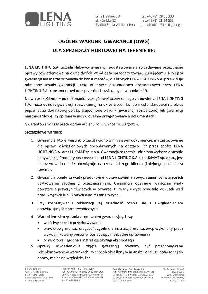 OGÓLNE WARUNKI GWARANCJI (OWG) DLA SPRZEDAŻY HURTOWEJ NA TERENIE RP: LENA LIGHTING S.A. udziela Nabywcy gwarancji podstawowej na sprzedawane przez siebie oprawy oświetleniowe na okres dwóch lat od daty sprzedaży towaru kupującemu. Niniejsza gwarancja nie ma zastosowania do konsumentów, dla których LENA LIGHTING S.A. przewiduje odmienne zasady gwarancji, ujęte w innych dokumentach dostarczanych przez LENA LIGHTING S.A. konsumentowi oraz przepisach wskazanych w punkcie 19. Na wniosek Klienta – po dokonaniu szczegółowej oceny danego zamówienia LENA LIGHTING S.A. może udzielić gwarancji rozszerzonej na okres trzech lat lub niestandardowej na okres pięciu lat za dodatkową opłatą. Uzgodnione warunki gwarancji rozszerzonej lub gwarancji niestandardowej są opisane w indywidualnie przygotowanych dokumentach. Gwarantowany czas pracy opraw w ciągu roku wynosi 5000 godzin. Szczegółowe warunki: 1. Gwarancja, której warunki przedstawiono w niniejszym dokumencie, ma zastosowanie dla opraw oświetleniowych sprzedawanych na obszarze RP przez spółkę LENA LIGHTING S.A. oraz LUXMAT sp. z o.o. Gwarancja ta zostaje udzielona wyłącznie stronie nabywającej Produkty bezpośrednio od LENA LIGHTING S.A lub LUXMAT sp. z o.o., jest nieprzenoszalna i nie obowiązuje na rzecz dalszego klienta (kolejnego posiadacza towaru). 2. Gwarancją objęte są wady produkcyjne opraw oświetleniowych uniemożliwiające ich użytkowanie zgodnie z przeznaczeniem. Gwarancja obejmuje wyłącznie wady powstałe z przyczyn tkwiących w towarze, tj. wady ukryte powstałe wskutek wad produkcyjnych lub ukrytych wad materiałowych. 3. Przy rozpatrywaniu reklamacji jej zasadność ocenia się z uwzględnieniem obowiązujących norm technicznych. 4. Warunkiem skorzystania z uprawnień gwarancyjnych są: właściwy sposób przechowywania, prawidłowy montaż urządzeń, zgodnie z instrukcją montażową, wykonany przez wykwalifikowany personel posiadający niezbędne uprawnienia, prawidłowa i zgodna z instrukcją obsługi eksploatacja. 5. Oprawy oświetleniowe objęte gwarancją powinny być przechowywane i eksploatowane w warunkach i w sposób określony w instrukcji obsługi, dołączonej do opraw, mając na względzie, że: Jeżeli w instrukcji nie określono inaczej, oprawy oświetleniowe przeznaczone są do pracy w standardowych warunkach, z wyjątkiem opraw o przeznaczeniu specjalnym. Warunki standardowe charakteryzuje temperatura otoczenia w zakresie -10°C- + 25°C, ciśnienie 960 - 1050 hPa, wilgotność 40-60%. Opraw nie należy stosować w przypadku, gdy warunki otoczenia mogą zagrozić konstrukcji oprawy, powłoce lakierniczej lub komponentom elektronicznym umieszczonym w oprawie powodując nieprawidłowe jej działanie. Oprawy są zbadane i zgodne z normą PN-EN-60598-1. Do czynników zagrażających konstrukcji oprawy można zaliczyć min.: wysoką temperaturę, wysoką wilgotność, zapylenie, obecność w powietrzu substancji chemicznie nieobojętnych (chlor, sól, kwasy, zasady), wibracje, wstrząsy, narażenie na udar, promienie UV, pole elektromagnetyczne. Oprawy należy stosować zgodnie z ich przeznaczeniem. Nabywca przed zakupem opraw bezwzględnie obowiązany jest skonsultować szczególne warunki, w których będą stosowane oprawy, jeżeli nie są określone w materiałach technicznych/produktowych. Nowoczesne i energooszczędne panele Led GO! oraz oprawy zostały zaprojektowane do bezawaryjnej i efektywnej pracy przez długi okres czasu. Celem długotrwałej bezawaryjnej eksploatacji opraw należy zapewnić odpowiednie warunki środowiskowe. Niektóre substancje chemiczne mogą powodować korozję i przebarwienia komponentów LED (powodując zmianę barwy emitowanego światła, zmniejszenie strumienia, aż do całkowitego zniszczenia źródła światła) oraz opraw (zmniejszając wytrzymałość mechaniczną oraz skracając okres eksploatacji). Listę przykładowych substancji chemicznych można pobrać na stronie www.lenalighting.pl/do-pobrania/owg 6. Uprawnienia gwarancyjne wyłączone są w szczególności, gdy dokonano ingerencji w oprawę, jej przeróbki oraz samowolnej naprawy lub gdy zastosowano ją lub użytkowano niezgodnie z przeznaczeniem. Gwarancji nie podlegają również uszkodzenia powstałe na skutek oddziaływania czynników zewnętrznych, mechanicznych, termicznych, chemicznych, nieprawidłowej eksploatacji oraz naturalnego zużycia. W szczególności gwarancja nie obejmuje materiałów eksploatacyjnych takich jak: tradycyjne źródła światła (żarówka, świetlówka itp.), kondensatory, zapłonniki, akumulatory. Wymienione materiały eksploatacyjne mogą być objęte gwarancją ich producenta. W przypadku opraw typu LED gwarancji nie podlegają: Spadek strumienia i mocy zgodnych (zgodnie z rozporządzeniem UE nr 1194/2012 lub późniejszymi przepisami) Zmiana temperatury barwowej w stopniu mniejszym niż (±10%) Wygaszenie pojedynczej diody w module LED, chyba że ilość wygaszonych pojedynczych diod przekracza 10% wszystkich diod na module. 7. Nabywca zobowiązany jest złożyć reklamację w formie pisemnej, w terminie 7 dni od daty wykrycia wady, a po uzgodnieniu z LENA LIGHTING S.A. warunków przesyłki dostarczyć reklamowany towar do siedziby LENA LIGHTING S.A. Zgłoszenie może być przyjęte na prawidłowo wypełnionym formularzu reklamacyjnym zamieszczonym na www.lenalighting.pl. Zgłoszenie musi zawierać indeks, ilość i nazwę reklamowanych produktów, numer dokumentu zakupu (FV) oraz szczegółowy opis stwierdzonej usterki. Jeżeli w procesie rozpatrywania reklamacji konieczne będzie uzyskanie dodatkowych informacji związanych z usterką bądź sposobem eksploatacji towaru, Nabywca zobowiązany jest dostarczyć wszelkich niezbędnych danych i informacji. 8. Gwarancja podlega rozpatrzeniu w terminie do 21 dni roboczych od dnia dostarczenia reklamowanego towaru do siedziby LENA LIGHTING S.A. (lub - jeśli oględziny większej ilości opraw muszą od