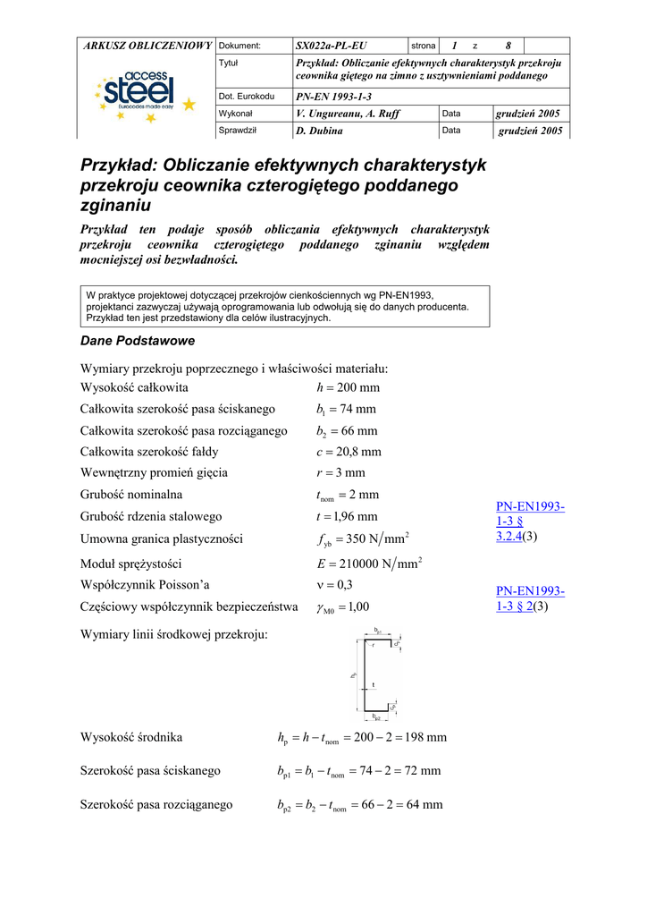 ARKUSZ OBLICZENIOWY Dokument: SX022a-PL-EU 1 strona z 8 Dot. Eurokodu Przykład: Obliczanie efektywnych charakterystyk przekroju ceownika giętego na zimno z usztywnieniami poddanego zginaniu PN-EN 1993-1-3 Wykonał V. Ungureanu, A. Ruff Data Sprawdził D. Dubina Data Tytuł grudzień 2005 grudzień 2005 Przykład: Obliczanie efektywnych charakterystyk przekroju ceownika czterogiętego poddanego zginaniu Przykład ten podaje sposób obliczania efektywnych charakterystyk przekroju ceownika czterogiętego poddanego zginaniu względem mocniejszej osi bezwładności. W praktyce projektowej dotyczącej przekrojów cienkościennych wg PN-EN1993, projektanci zazwyczaj uŜywają oprogramowania lub odwołują się do danych producenta. Przykład ten jest przedstawiony dla celów ilustracyjnych. Dane Podstawowe Wymiary przekroju poprzecznego i właściwości materiału: Wysokość całkowita h = 200 mm Całkowita szerokość pasa ściskanego b1 = 74 mm Całkowita szerokość pasa rozciąganego b2 = 66 mm Całkowita szerokość fałdy c = 20,8 mm Wewnętrzny promień gięcia r = 3 mm Grubość nominalna t nom = 2 mm Grubość rdzenia stalowego t = 1,96 mm Umowna granica plastyczności f yb = 350 N mm 2 Moduł spręŜystości E = 210000 N mm 2 Współczynnik Poisson’a ν = 0,3 Częściowy współczynnik bezpieczeństwa γ M0 = 1,00 Wymiary linii środkowej przekroju: Wysokość środnika hp = h − t nom = 200 − 2 = 198 mm Szerokość pasa ściskanego bp1 = b1 − t nom = 74 − 2 = 72 mm Szerokość pasa rozciąganego bp2 = b2 − t nom = 66 − 2 = 64 mm PN-EN19931-3 § 3.2.4(3) PN-EN19931-3 § 2(3) ARKUSZ OBLICZENIOWY Dokument: SX022a-PL-EU 2 strona z 8 Dot. Eurokodu Przykład: Obliczanie efektywnych charakterystyk przekroju ceownika giętego na zimno z usztywnieniami poddanego zginaniu PN-EN 1993-1-3 Wykonał V. Ungureanu, A. Ruff Data Sprawdził D. Dubina Data Tytuł grudzień 2005 grudzień 2005 cp = c − t nom 2 = 20,8 − 2 2 = 19,8 mm Szerokość fałdy Sprawdzanie proporcji geometrycznych Metoda projektowa zawarta w PN-EN1993 1-3 moŜe być stosowana jeŜeli są PN-EN1993spełnione następujące warunki: 1-3 § 5.2 b t ≤ 60 b1 t = 74 1,96 = 37,75 < 60 – OK c t ≤ 50 c t = 20,8 1,96 = 10,61 < 50 – OK h t ≤ 500 h t = 200 1,96 = 102,04 < 500 – OK Aby zapewnić wystarczająca sztywność, oraz by uniknąć utraty stateczności miejscowej ścianek usztywniających, wymiary tych ścianek powinny mieścić się w następujących granicach: 0,2 ≤ c b ≤ 0,6 c b1 = 20,8 74 = 0,28 0,2 < 0,28 < 0,6 – OK c b2 = 20,8 66 = 0,32 0,2 < 0,32 < 0,6 – OK Wpływ zaokrąglenia naroŜy jest zaniedbywalna jeŜeli: r t≤5 r t = 3 1,96 = 1,53 < 5 – OK r bp ≤ 0,10 r bp1 = 3 72 = 0,04 < 0,10 – OK r bp 2 = 3 64 = 0,05 < 0,10 – OK Charakterystyki przekroju całkowitego Abr = t (2cp + bp1 + bp2 + hp ) = 1,96 × (2 × 19,8 + 72 + 64 + 198) = 732 mm 2 PołoŜenie osi obojętnej w stosunku do pasa ściskanego: z b1 [c (h = p p ] − cp 2 ) + bp2 hp + hp2 2 + cp2 2 t Abr = 96,88 mm PN-EN19931-3 § 5.1(3) ARKUSZ OBLICZENIOWY Dokument: SX022a-PL-EU 3 strona 8 z Dot. Eurokodu Przykład: Obliczanie efektywnych charakterystyk przekroju ceownika giętego na zimno z usztywnieniami poddanego zginaniu PN-EN 1993-1-3 Wykonał V. Ungureanu, A. Ruff Data Sprawdził D. Dubina Data Tytuł grudzień 2005 grudzień 2005 Efektywne charakterystyki przekroju pasa i fałdy ściskanej Ogólnie jest stosowana procedura (iteracyjna) do obliczania efektywnych PN-EN1993charakterystyk pasa i fałdy ściskanej (płaskiego elementu z usztywnieniem). 1-3 § 5.5.3.2 Obliczenie powinno być wykonane w trzech krokach: Krok 1: Obliczanie początkowego efektywnego przekroju poprzecznego dla fałdy PN-EN1993uŜywając efektywnych szerokości pasa przyjmując, Ŝe ściskany pas jest 1-3 § 5.5.3.2 poparty z dwóch stron, fałda całkowicie usztywnia przekrój ( K = ∞ ), oraz Ŝe (3) nośność przekroju nie jest zmniejszana ( σ com,Ed = f yb / γ M 0 ). Efektywna szerokość pasa ściskanego Współczynnik rozkładu napręŜeń: ψ = 1 (równomierne ściskanie), więc współczynnik wyboczeniowy: kσ = 4 dla wewnętrznych ścianek ściskanych. ε = 235 f yb bp1 t 28,4 ε kσ = 72 1,96 = 0,789 28,4 × 235 350 × 4 Współczynnik redukcyjny szerokości: ρ= i PN-EN19931-5 § 4.4 Smukłość względna: λp,b = PN-EN19931-3 § 5.5.2 λp,b − 0,055(3 + ψ ) 0,789 − 0,055 × (3 + 1) = = 0,914 0,789 2 λp,b 2 Efektywna szerokość wynosi: beff = ρ bp1 = 0 ,914 × 72 = 65,8 mm be1 = be2 = 0 ,5beff = 0 ,5 × 65,8 = 32 ,9 mm ARKUSZ OBLICZENIOWY Dokument: SX022a-PL-EU strona 4 z 8 Dot. Eurokodu Przykład: Obliczanie efektywnych charakterystyk przekroju ceownika giętego na zimno z usztywnieniami poddanego zginaniu PN-EN 1993-1-3 Wykonał V. Ungureanu, A. Ruff Data Sprawdził D. Dubina Data Tytuł grudzień 2005 grudzień 2005 Efektywna szerokość fałdy krawędziowej Współczynnik wyboczeniowy: PN-EN19931-3 § 5.5.3.2 (5a) jeŜeli bp, c bp1 ≤ 0,35 : kσ = 0,5 jeŜeli 0,35 < bp, c bp1 ≤ 0,6 : kσ = 0,5 + 0,83 3 (bp,c bp1 − 0,35) 2 bp, c bp1 = 19,8 72 = 0,275 < 0,35 to kσ = 0,5 Smukłość względna: λp,c = cp t 28,4 ε kσ = PN-EN19931-5 § 4.4 19,8 1,96 = 0,614 28,4 × 235 350 × 0,5 Współczynnik redukcyjny szerokości: ρ= λp,c − 0,188 0,614 − 0,188 = = 1,13 0,614 2 λp,c 2 ale ρ ≤ 1 dlatego ρ =1 Efektywna szerokość wynosi: ceff = ρ cp = 1 × 19,8 = 19,8 mm PN-EN19931-3 § 5.5.3.2 (5a) Efektywny przekrój usztywnienia krawędziowego: ( ) ( ) As = t be2 + ceff = 1,96 × 32,9 + 19,8 = 103,3 mm 2 § 5.5.3.2 (6) Krok 2: UŜywając początkowego efektywnego przekroju usztywnienia, określa się PN-EN1993współczynnik redukcyjny, uwzględniając efekt ciągłego stęŜenia spręŜystego. 1-3 § 5.5.3.2 (3) ARKUSZ OBLICZENIOWY Dokument: SX022a-PL-EU strona 5 z Dot. Eurokodu Przykład: Obliczanie efektywnych charakterystyk przekroju ceownika giętego na zimno z usztywnieniami poddanego zginaniu PN-EN 1993-1-3 Wyk